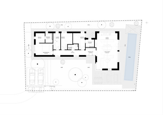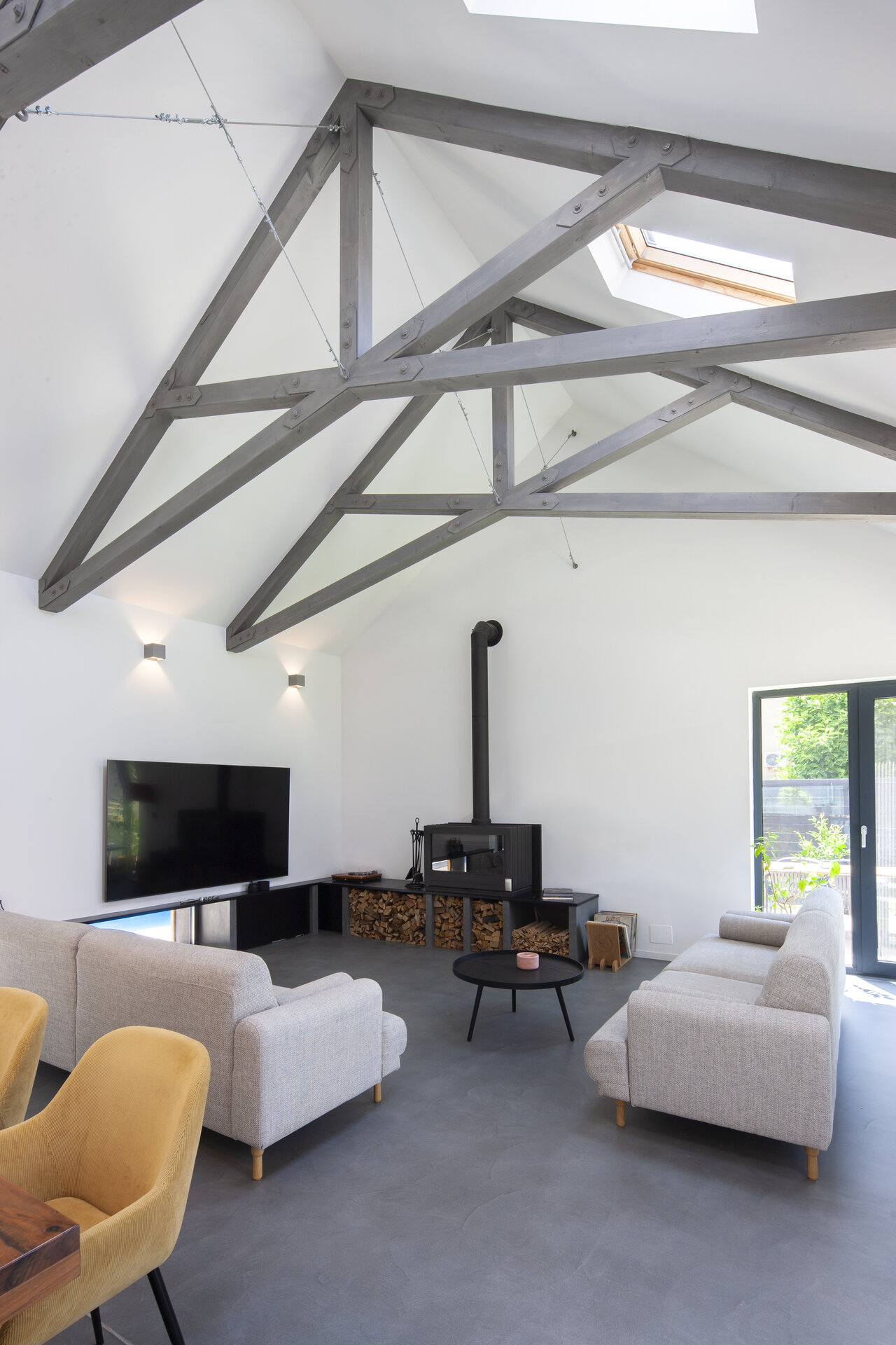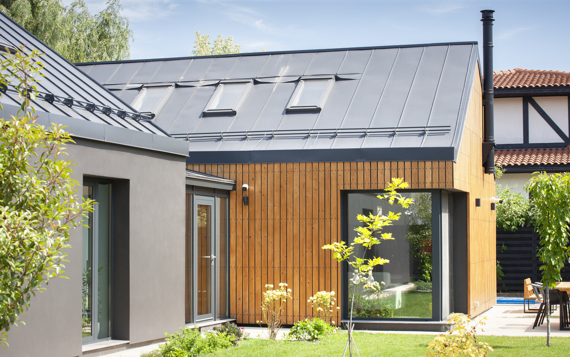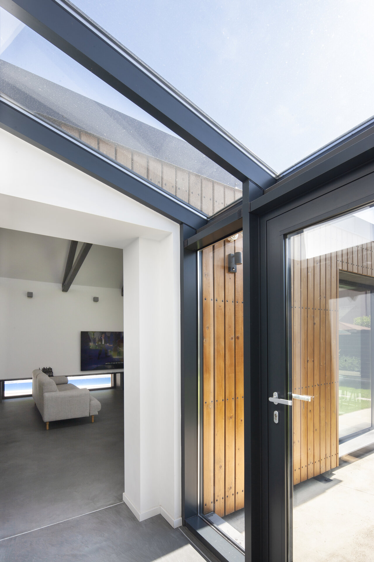 Proiectul recuperează arhetipul casei de țară – cu acoperiș în două ape, de tip șarpantă – dar îl reinterpretează într-o cheie contemporană. Această geometrie este adusă în interior, unde contribuie la definirea unor spații ample, aerisite și luminoase. Astfel, arhitectura nu doar că evită monumentalitatea, dar valorifică subtil expresia estetică a unei locuințe calme, echilibrate și profund funcționale.