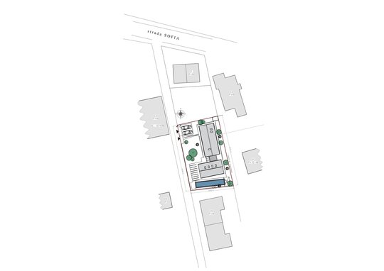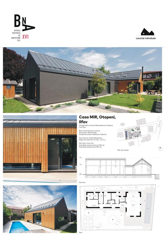 Amplasată în Otopeni, într-un context urbanistic dominat de locuințe individuale de mari dimensiuni, desfășurate pe suprafețe ample și înălțimi de 2–3 niveluri, Casa MIR alege o prezență discretă și echilibrată: un singur nivel, o retragere față de drumul de acces – aproape ca o uliță – și o curte de primire generoasă, care preia ritmul mai lent al locuirii familiale.