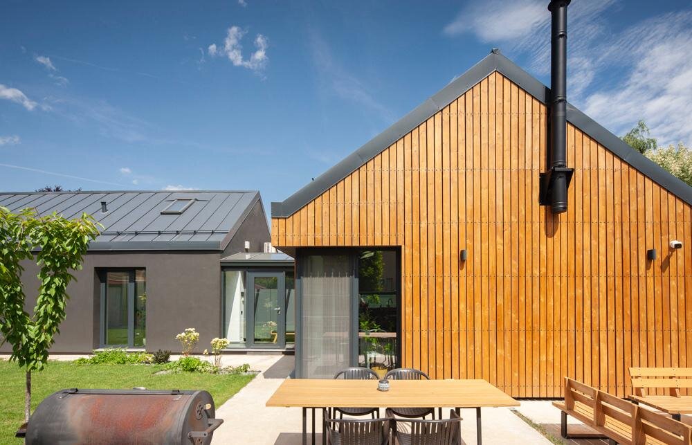 Estetica propusă nu se bazează pe gesturi spectaculoase, ci pe proporție, coerență materială, detalii bine controlate și relația dintre locuire și natură. Lemnul folosit la fațade provine din surse sustenabile, tâmplăria performantă asigură un bun control termic, iar orientarea și poziționarea ferestrelor maximizează aportul solar pasiv în sezonul rece și ventilarea naturală vara.
