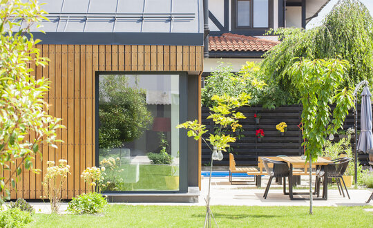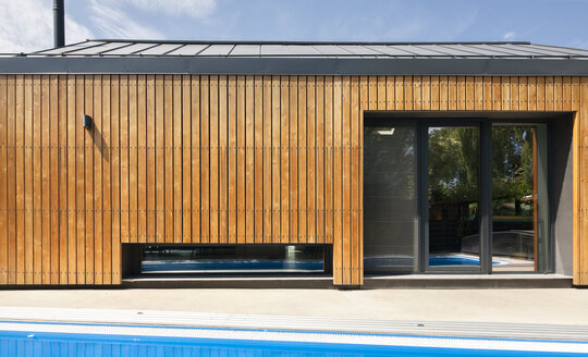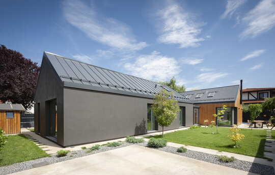 Volumetric, casa este compusă din două corpuri distincte – funcțional și estetic – articulate printr-un spațiu de acces complet vitrat, care devine axa de lumină și dialog între cele două zone. Zona de zi, marcată de o fațadă caldă din lemn și suprafețe vitrate ample, este deschisă, permeabilă și orientată spre grădină. Zona de noapte, finisată într-un gri închis, funcționează ca un spațiu protector, mai intim, dar păstrează o legătură vizuală subtilă cu restul casei.