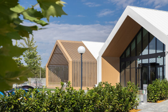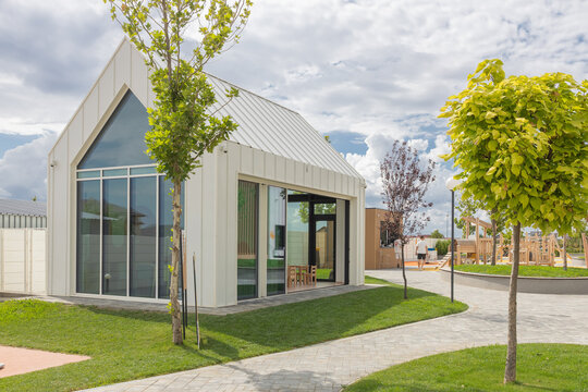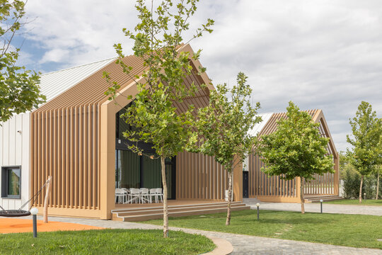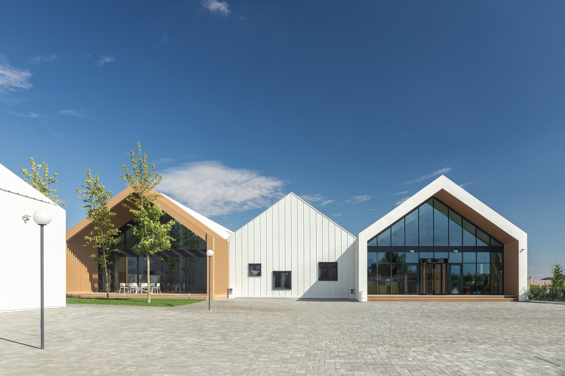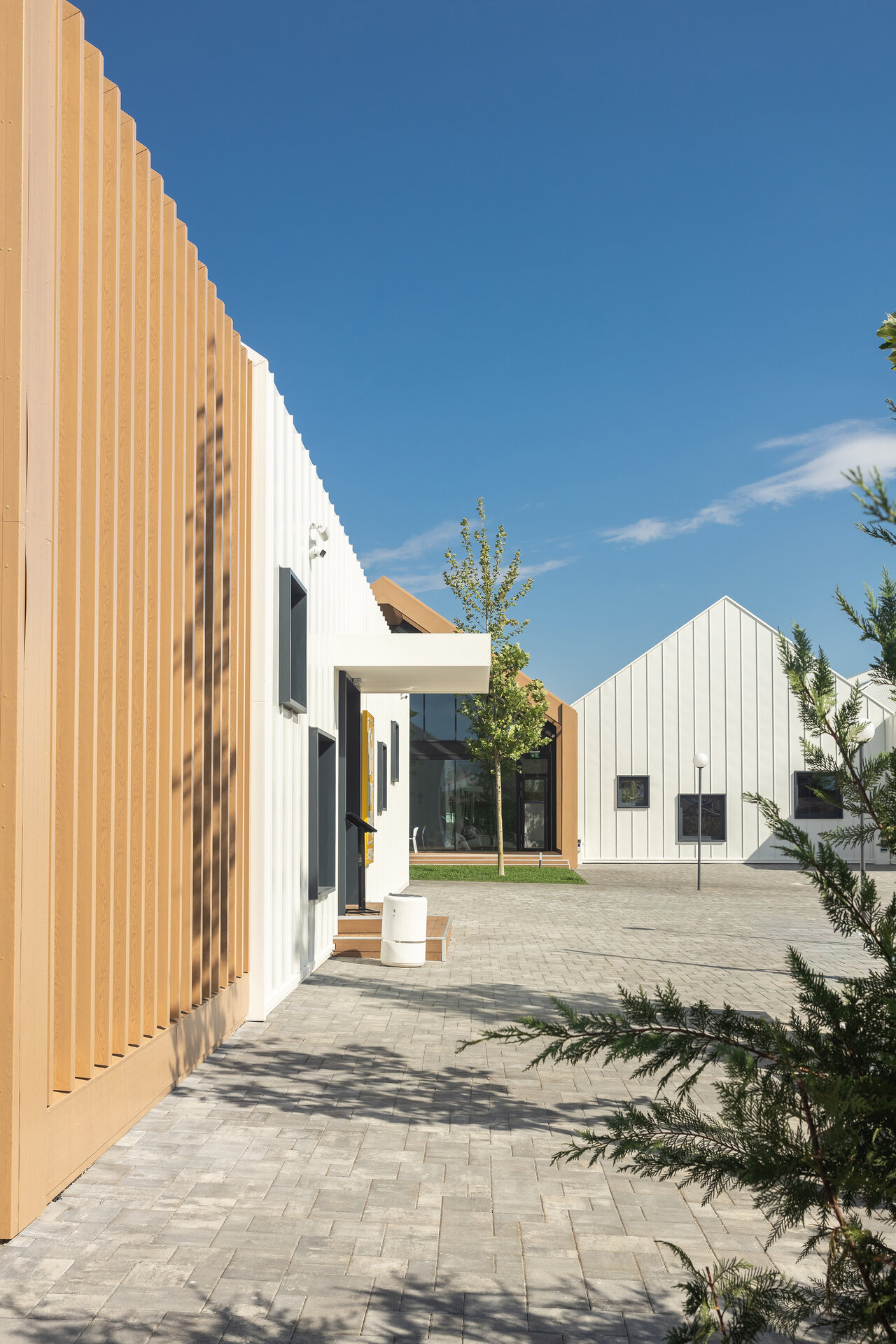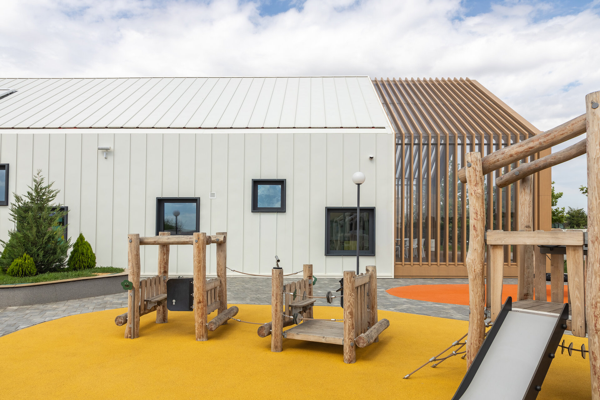 Exteriorul este amenajat cu locuri de joacă pentru sezonul cald și include o circulație internă cu 60 de locuri de parcare, facilitând accesul și siguranța vizitatorilor și patru pavilioane cu o suprafață însumata de 180mp.