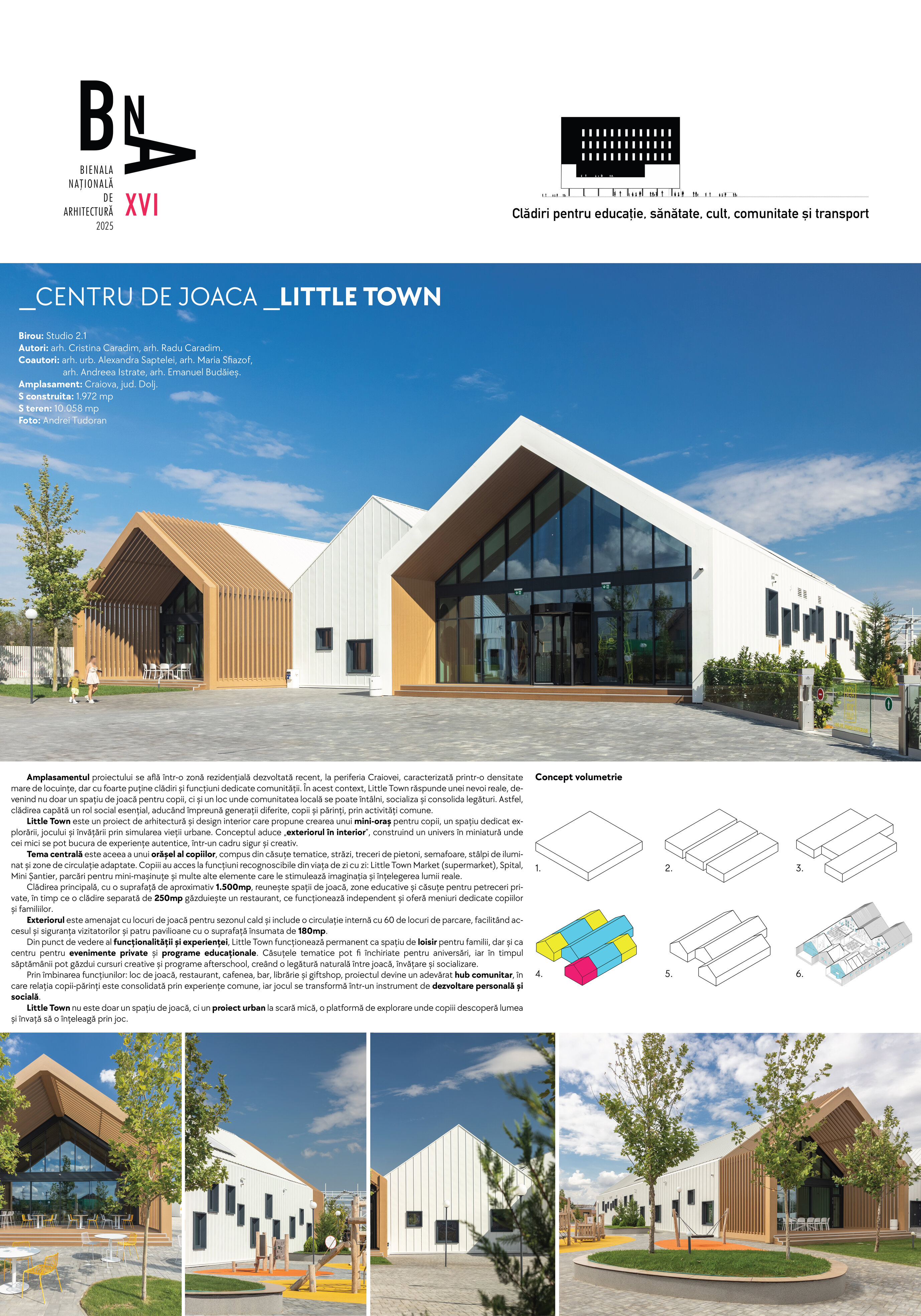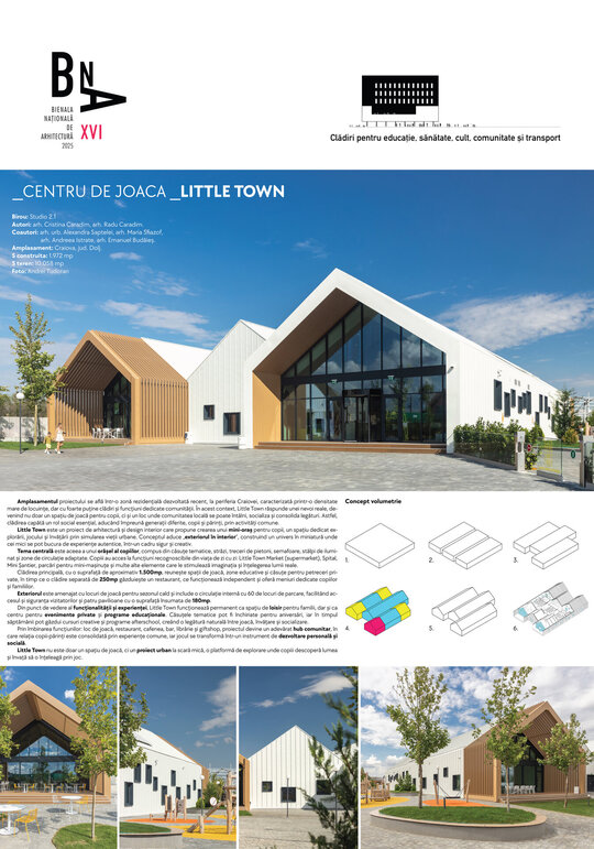 Amplasamentul proiectului se află într-o zonă rezidențială dezvoltată recent, la periferia Craiovei, caracterizată printr-o densitate mare de locuințe, dar cu foarte puține clădiri și funcțiuni dedicate comunității. În acest context, Little Town răspunde unei nevoi reale, devenind nu doar un spațiu de joacă pentru copii, ci și un loc unde comunitatea locală se poate întâlni, socializa și consolida legături. Astfel, clădirea capătă un rol social esențial, aducând împreună generații diferite, copii și părinți, prin activități comune.