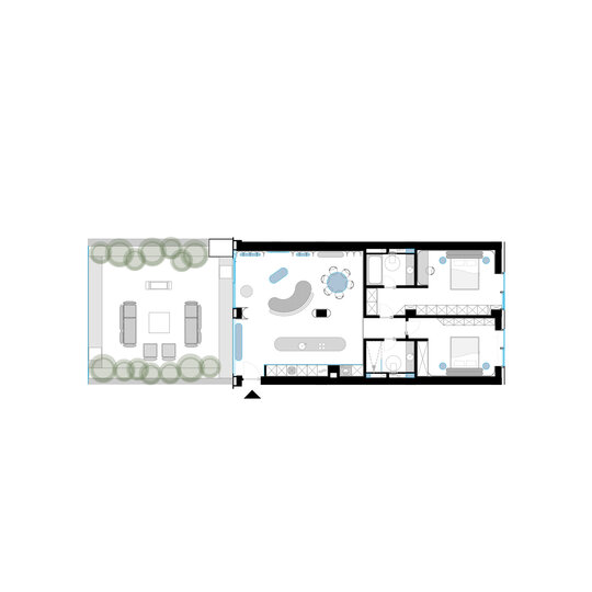 spațiul central, livingul, este scena deschisă a acestei coregrafii. lumina naturală trasează coregrafii schimbătoare de-a lungul zilei: dimineața, razele pătrund ferm, desenând contururi clare; după-amiaza, umbrele se adâncesc, iar seara liniile devin fluide și contemplative. suprafețele par să se miște odată cu lumina, asemenea unui dans care nu se repetă niciodată identic.
