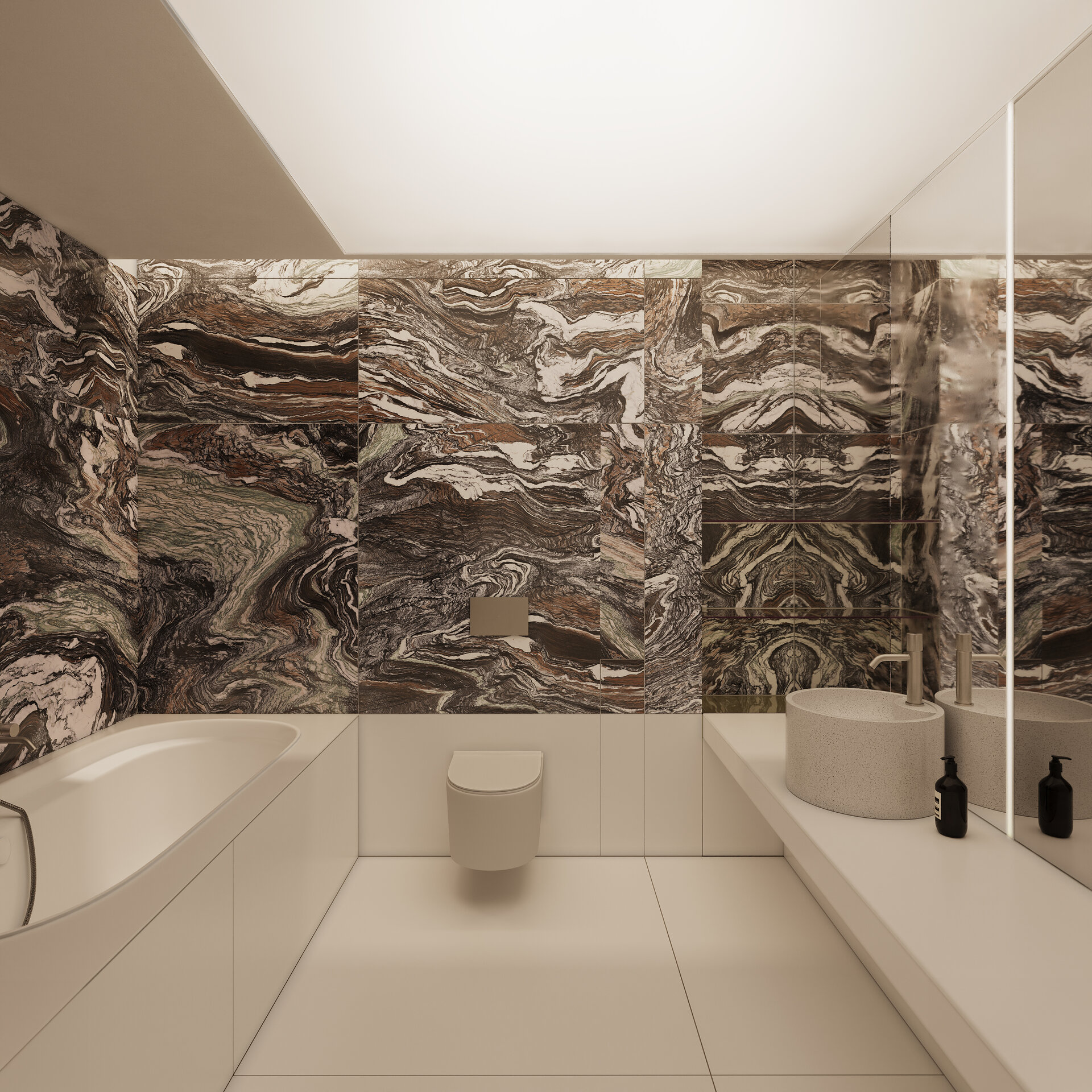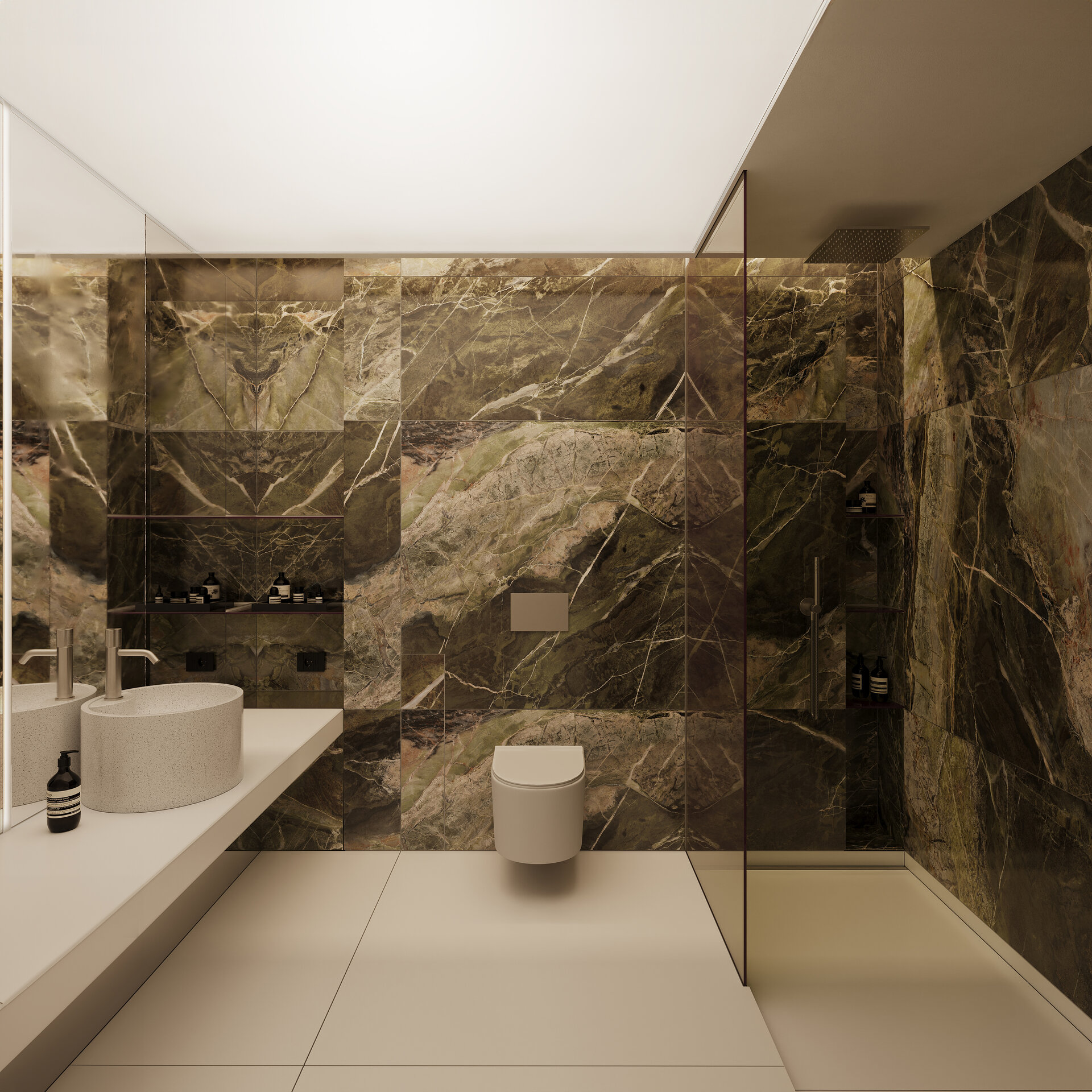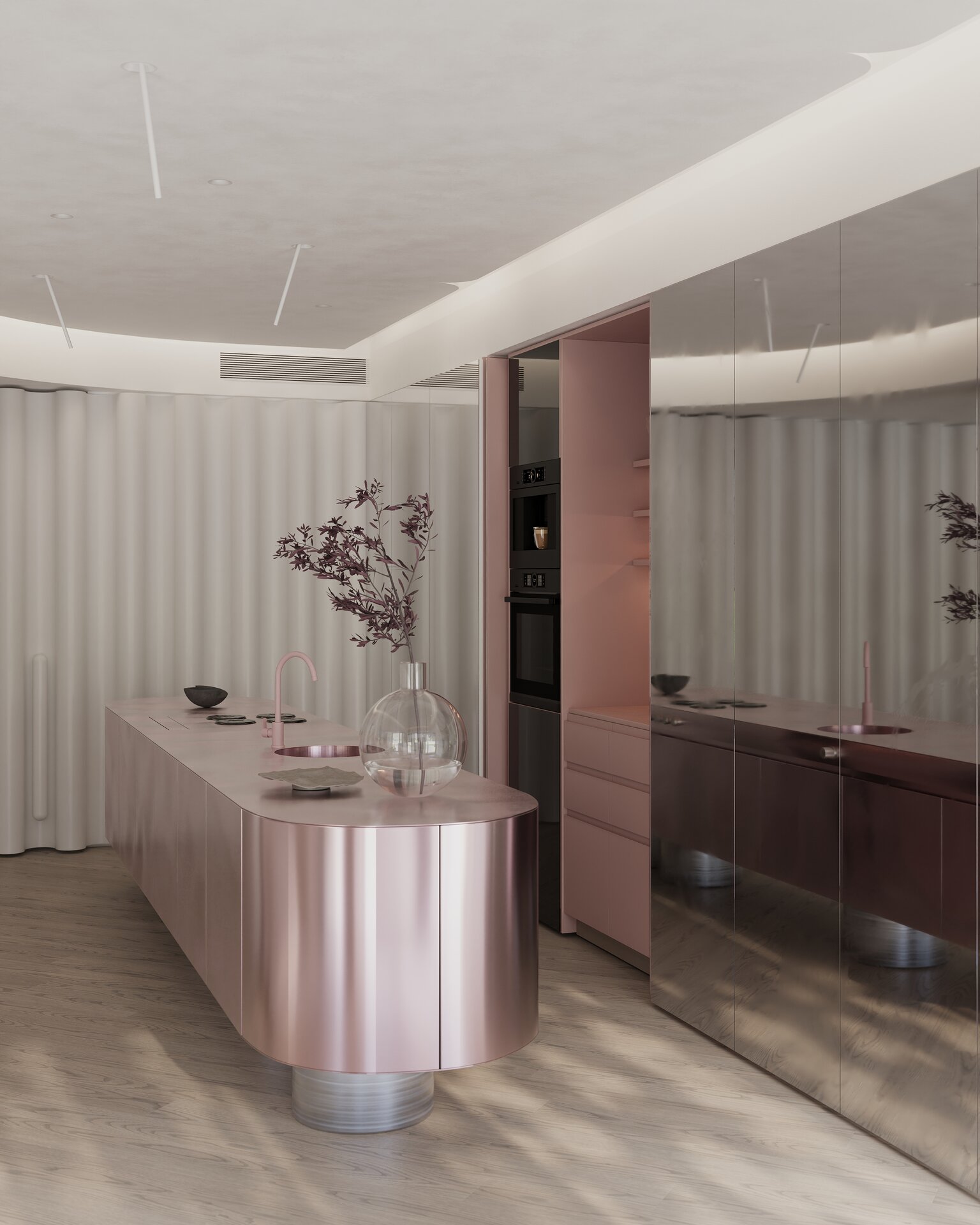 materialitatea spațiului este construită pe tensiunea fertilă dintre fix și efemer. textura pietrei naturale și lemnul aduc permanență și stabilitate, în timp ce elementele translucide, reflexiile metalice sau liniile curbe aduc fluiditate, mișcare și surpriză. aceste contraste nu se exclud, ci se completează, asemenea unor parteneri de dans care, prin diferențele lor, creează armonie.