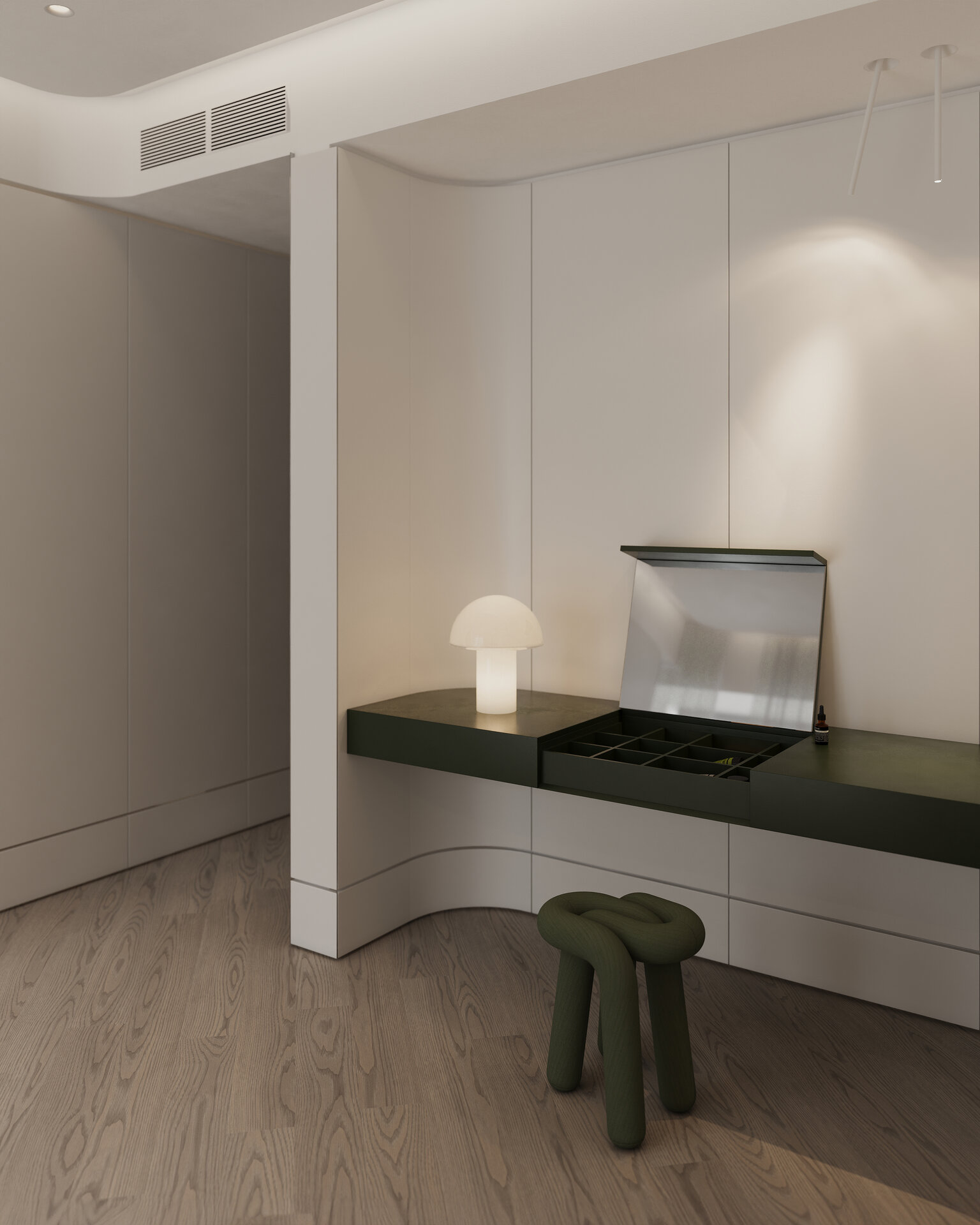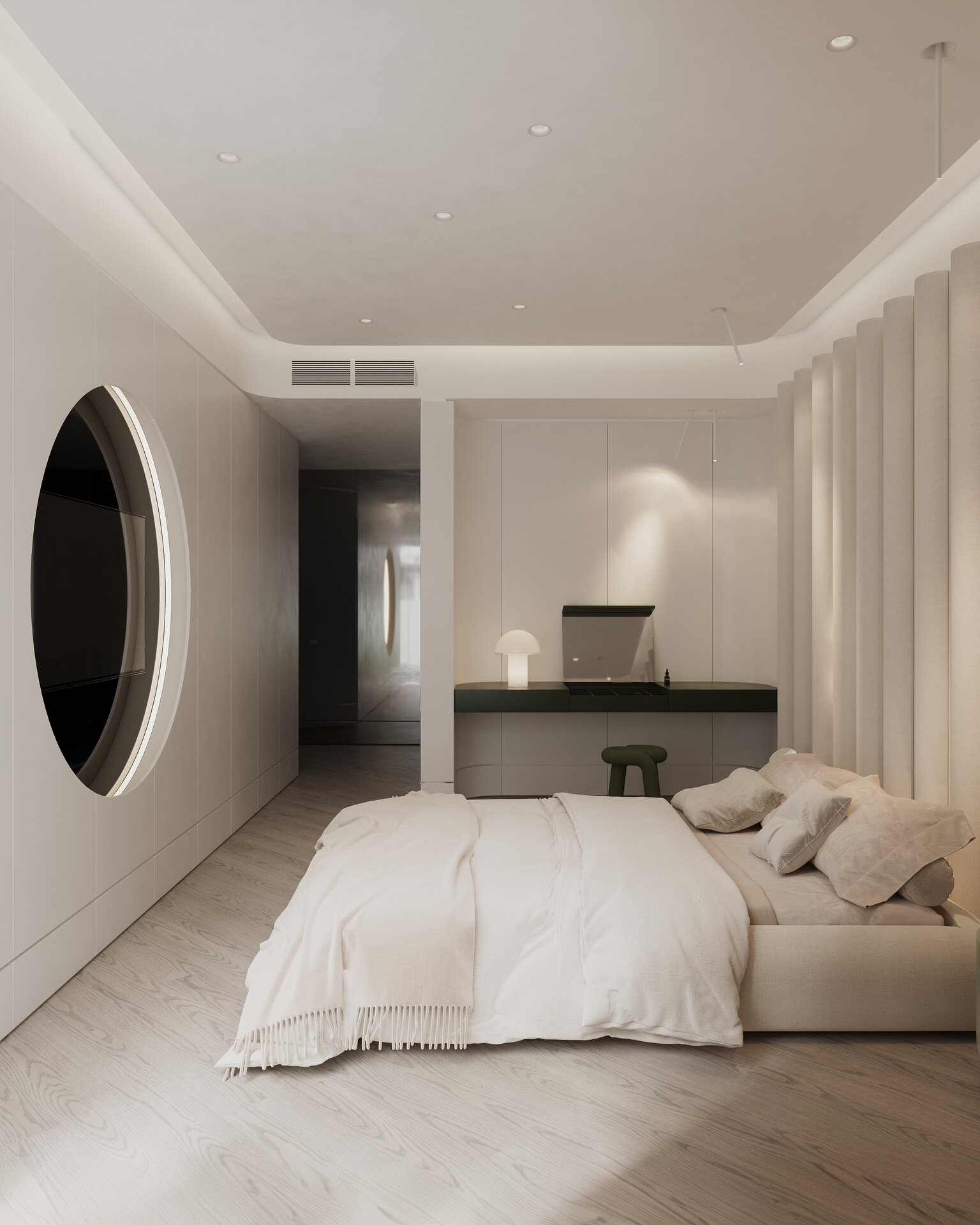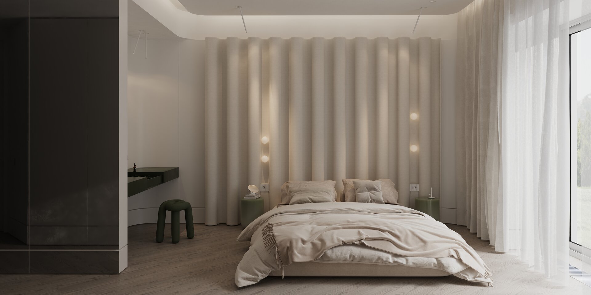 dormitoarele sunt concepute ca spații de retragere, unde ritmul încetinește și dansul timpului se transformă în respirație. texturile calde, țesăturile moi și nuanțele discrete induc intimitate și siguranță, construind un cadru pentru odihnă, introspecție și visare. aici, timpul capătă consistența memoriei personale, iar fiecare detaliu se imprimă ca o amintire în devenire.