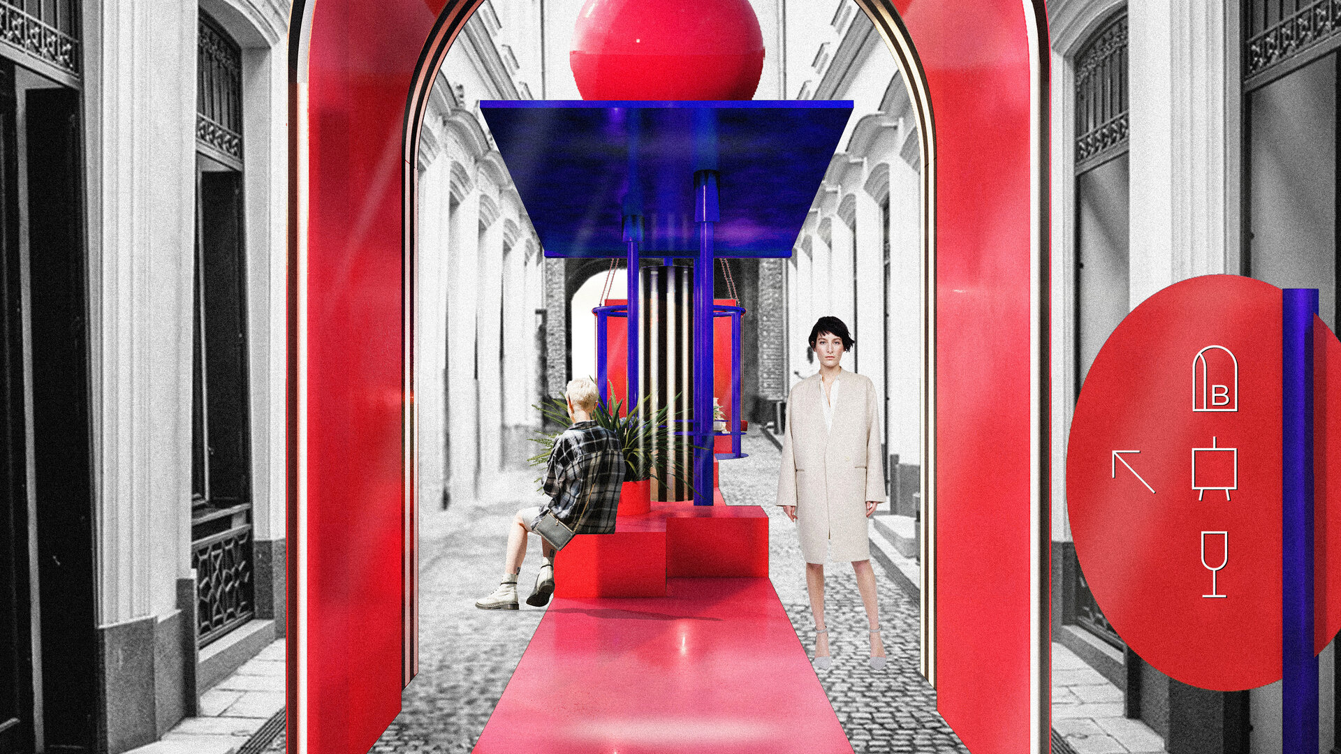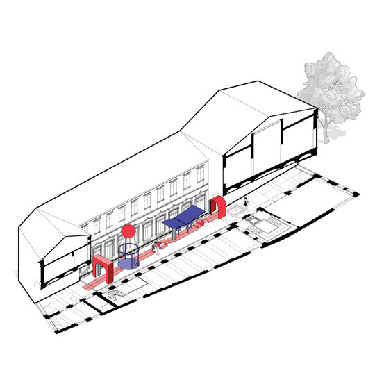 Amenajarea curții interioare se bazează pe un ansamblu modular compus din patru elemente principale. Portalurile de acces, realizate din structură metalică placată și panouri iluminate LED, marchează intrările și pot integra afișaj, sunet, proiecții sau funcții expoziționale. Elementul landmark – un cadru circular cu balon gonflabil suspendat – funcționează ca punct de reper urban, scenă sau zonă interactivă. Hub-ul acoperit oferă adăpost și facilități pentru activități diverse, de la cocktailuri la expoziții sau lucru remote. Platforma centrală, cu structură metalică și jardiniere integrate, preia denivelarea terenului și oferă spațiu de ședere. Mobilierul auxiliar completează intervenția prin firmă luminoasă, rastel de biciclete, totemuri de semnalizare, panouri modulare și semnalistică grafică adaptabilă.