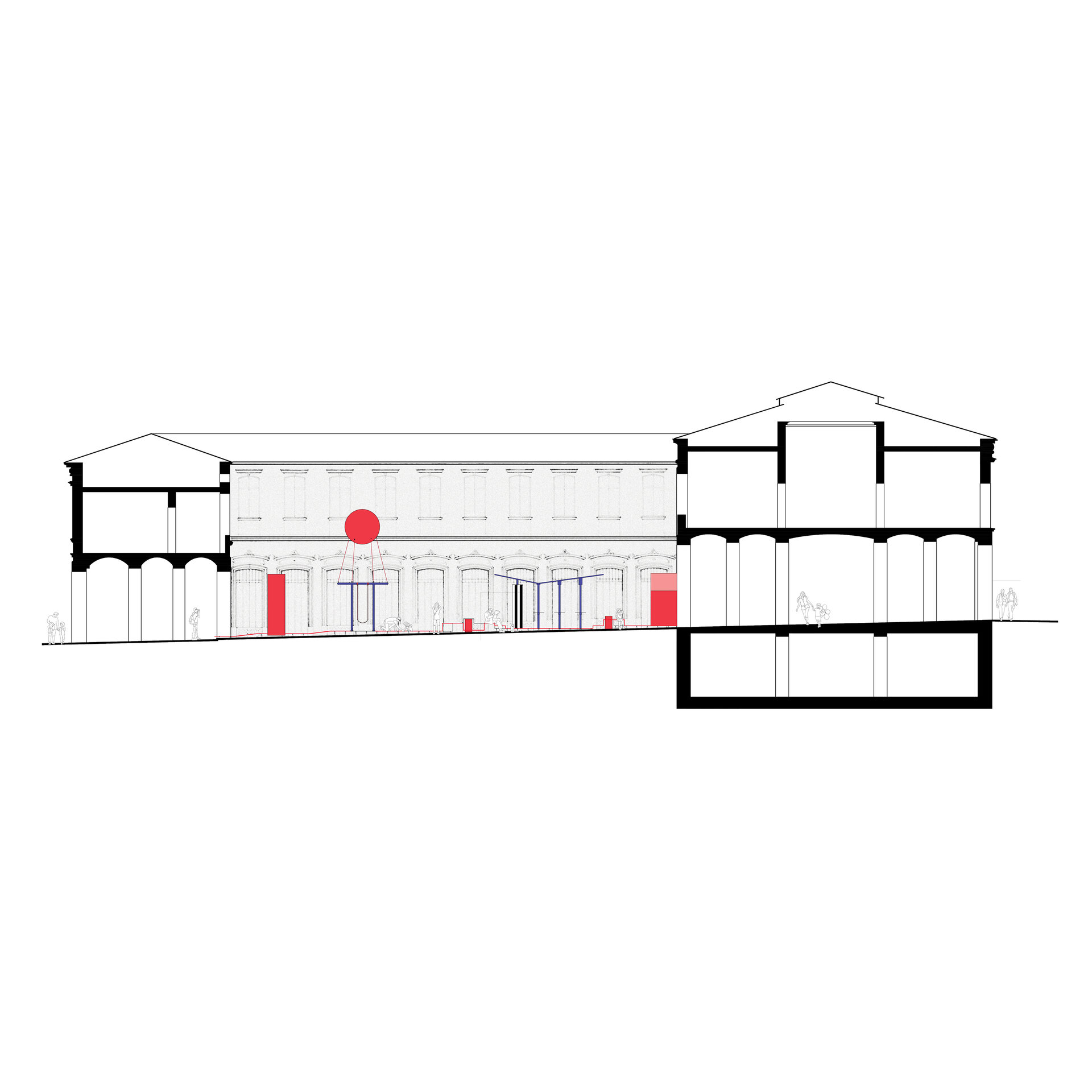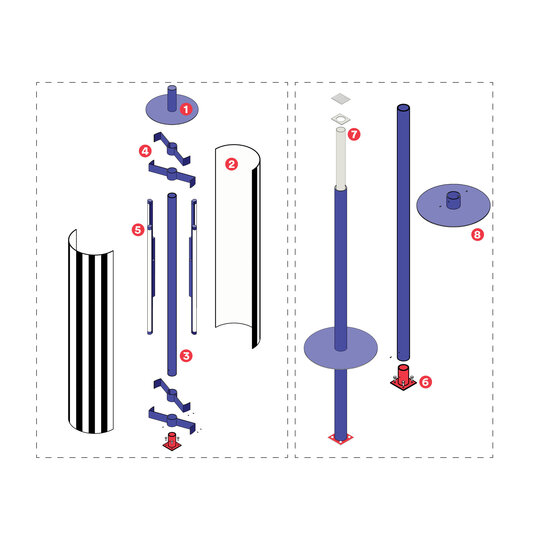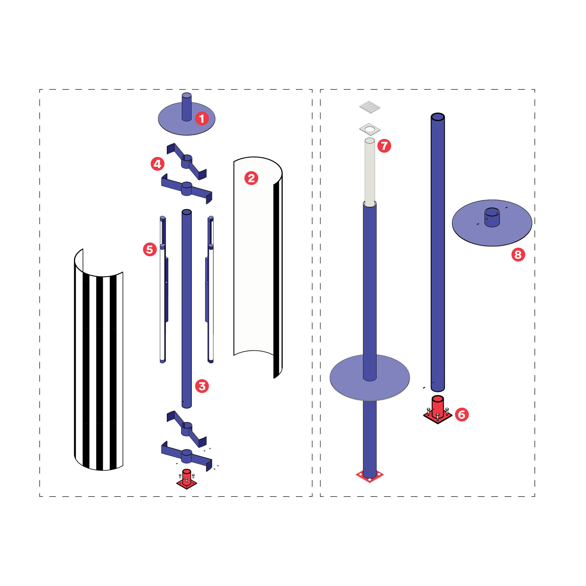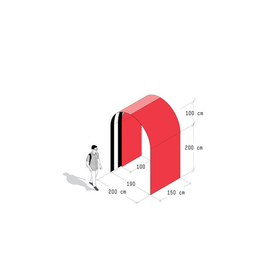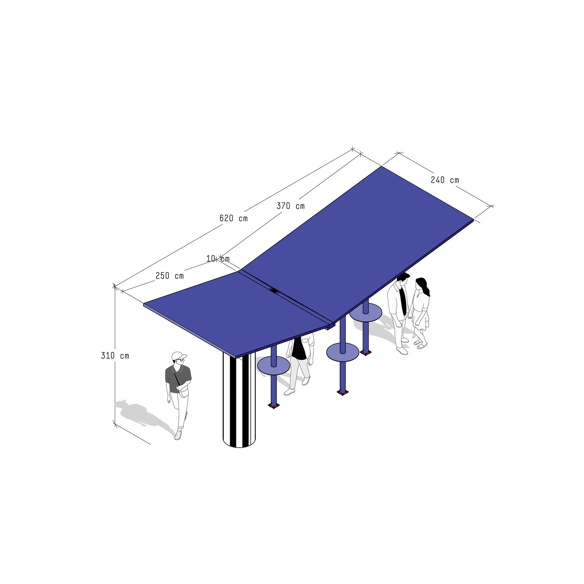 Construcția este ușoară, stabilă și demontabilă, ușor de amplasat atât în curtea exterioară, cât și pe străzi sau în interior, fiind pretabilă pentru expuneri artistice, spectacole live sau evenimente simultane. Alternând între zone adăpostite și spații deschise, ansamblul valorifică spațiul curții interioare unidirecționate și creează un spațiu multifuncțional, economic și sustenabil, care reflectă misiunea ARCUB de a transforma spațiul urban într-un catalizator al vieții culturale.