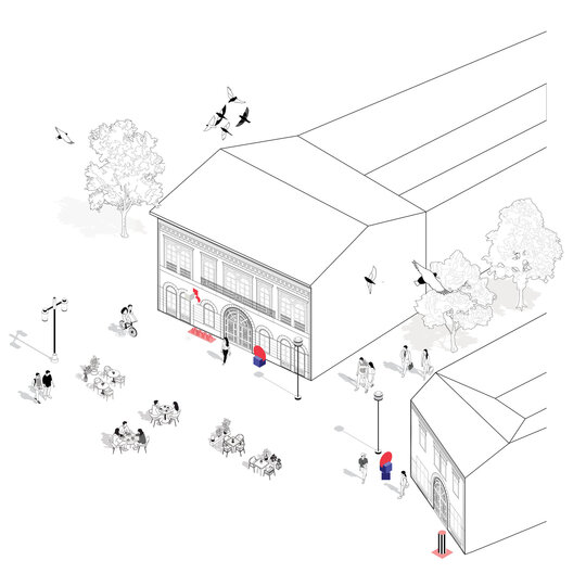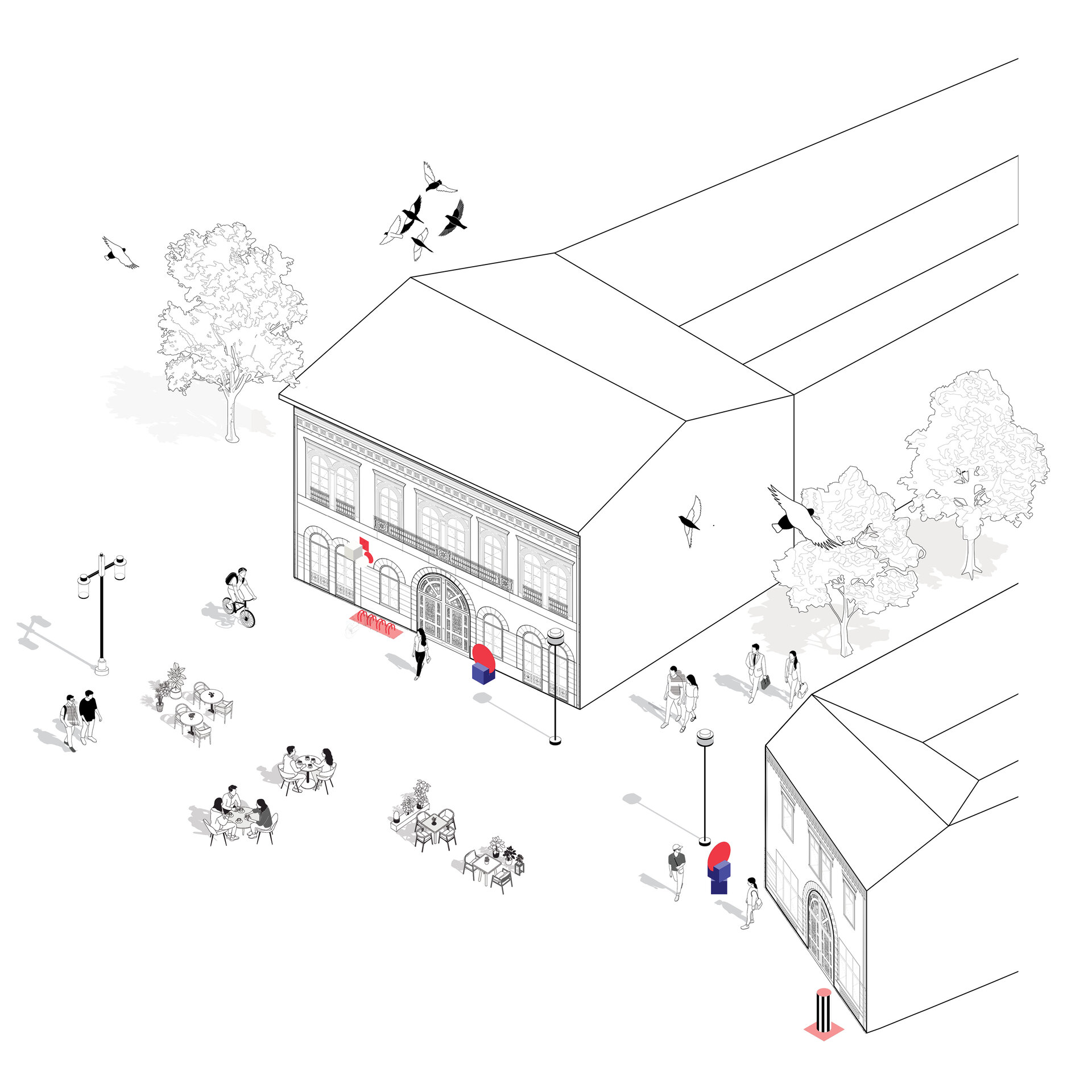 Structura integrează fluxurile de circulație dintre accesele clădirii și cele două străzi adiacente, asigurând conexiuni naturale și perspective deschise fără a obtura vizibilitatea.