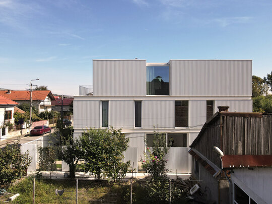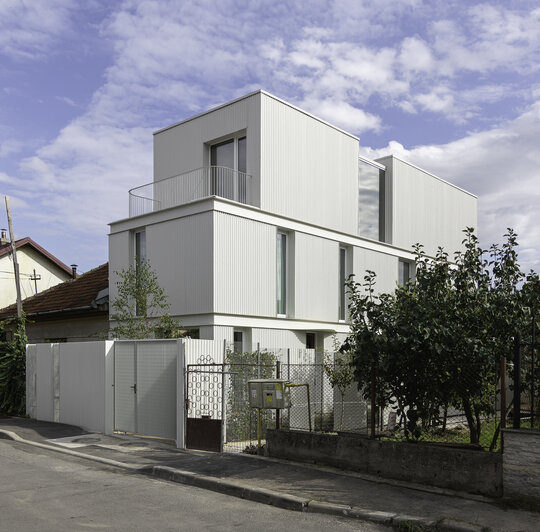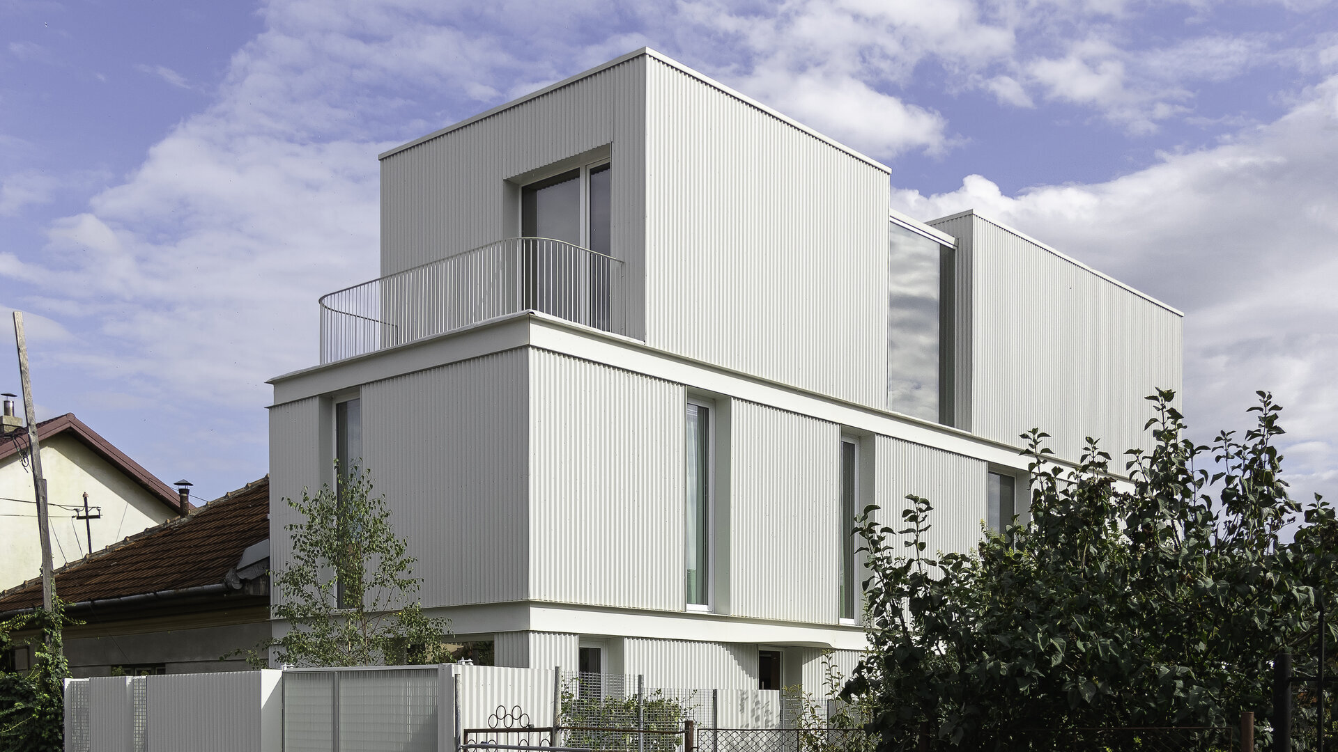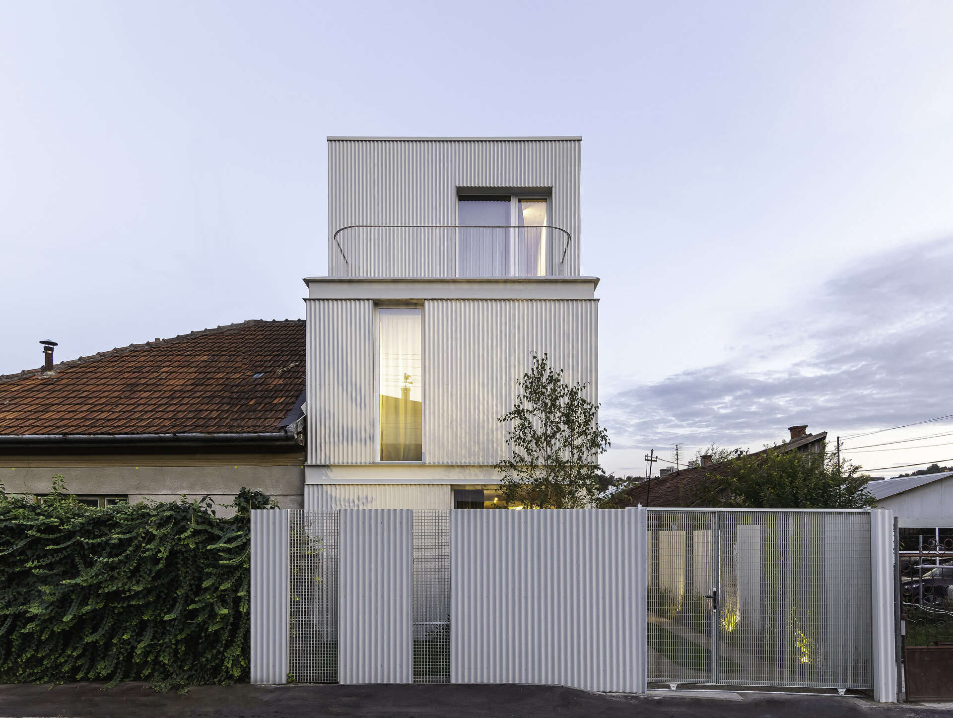 Exteriorul este placat cu tablă, dând locuinței un aspect industrial într-o notă contemporană. Suprafețele mari vitrate, strategic amplasate, sunt o caracteristică puternică a casei permițând luminii naturale să invadeze spațiile interioare, să creeze o atmosferă deschisă, generoasă și să ofere o comunicare puternică cu curtea exterioară si împrejurimile. Aceste vitraje fac deasemenea ca spațiile interioare să fie totuna cu spațiile exterioare, nesimțind că locuiești probabil în cea mai îngustă casă din oraș. Fiind o locuință de arhitecți, majoritatea sistemelor sunt inovative și eficiente , de la structura minimalistă a casei până la finisaje de beton aparent, cu agregate expuse și la sistemul inovativ de fațadă ventilată.