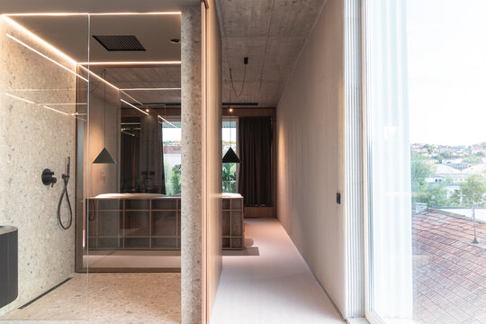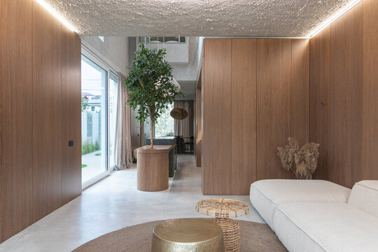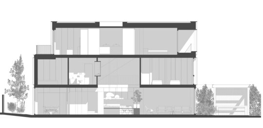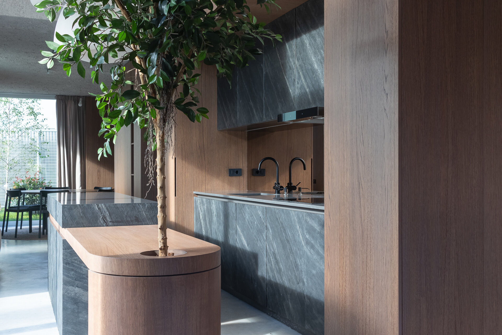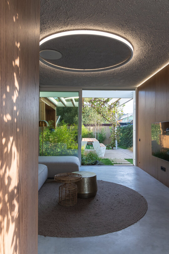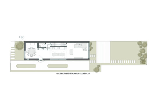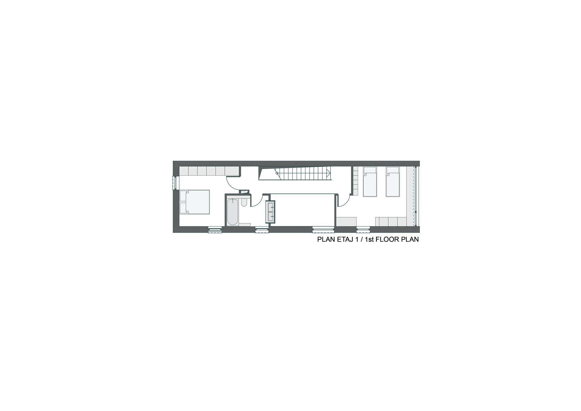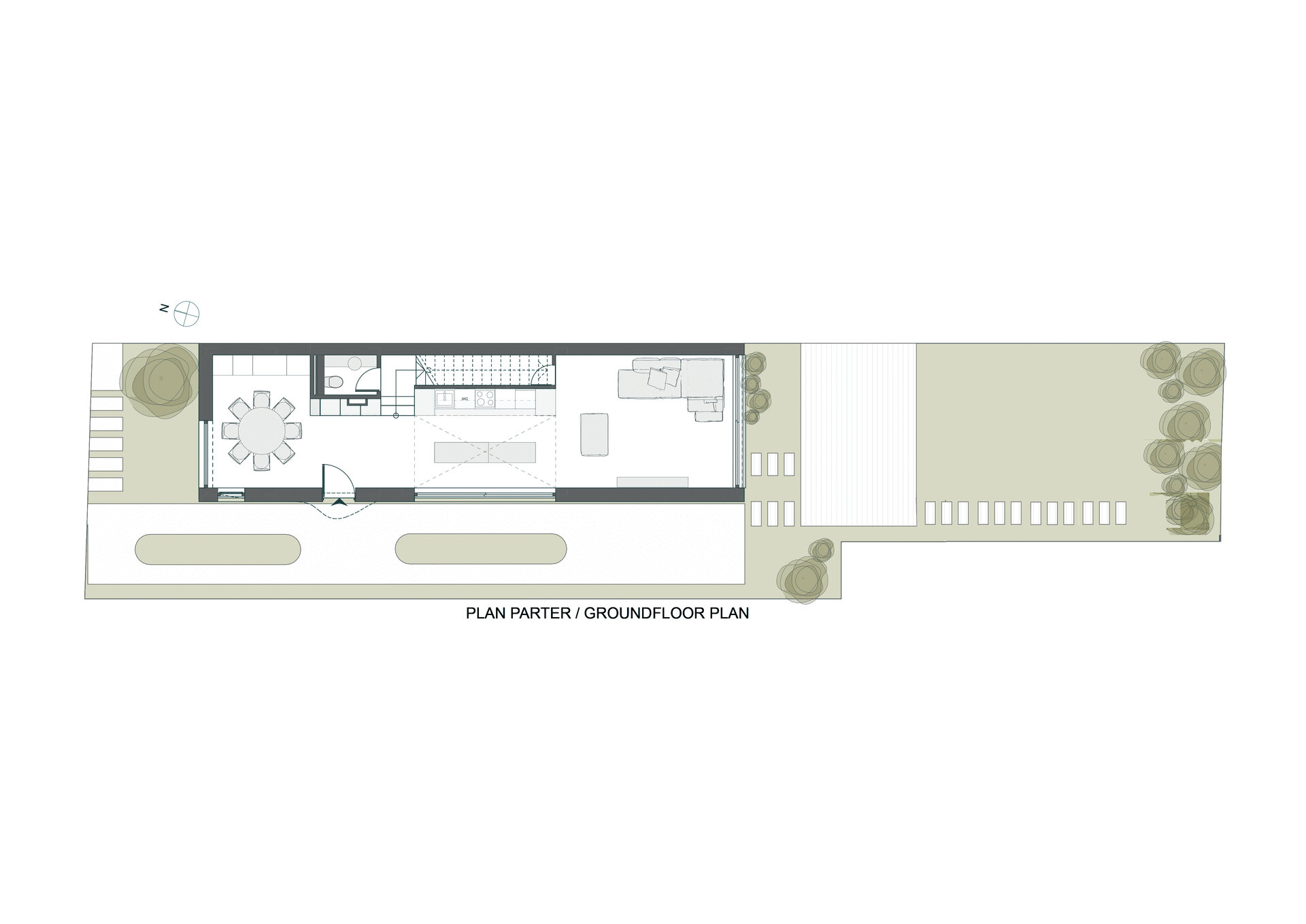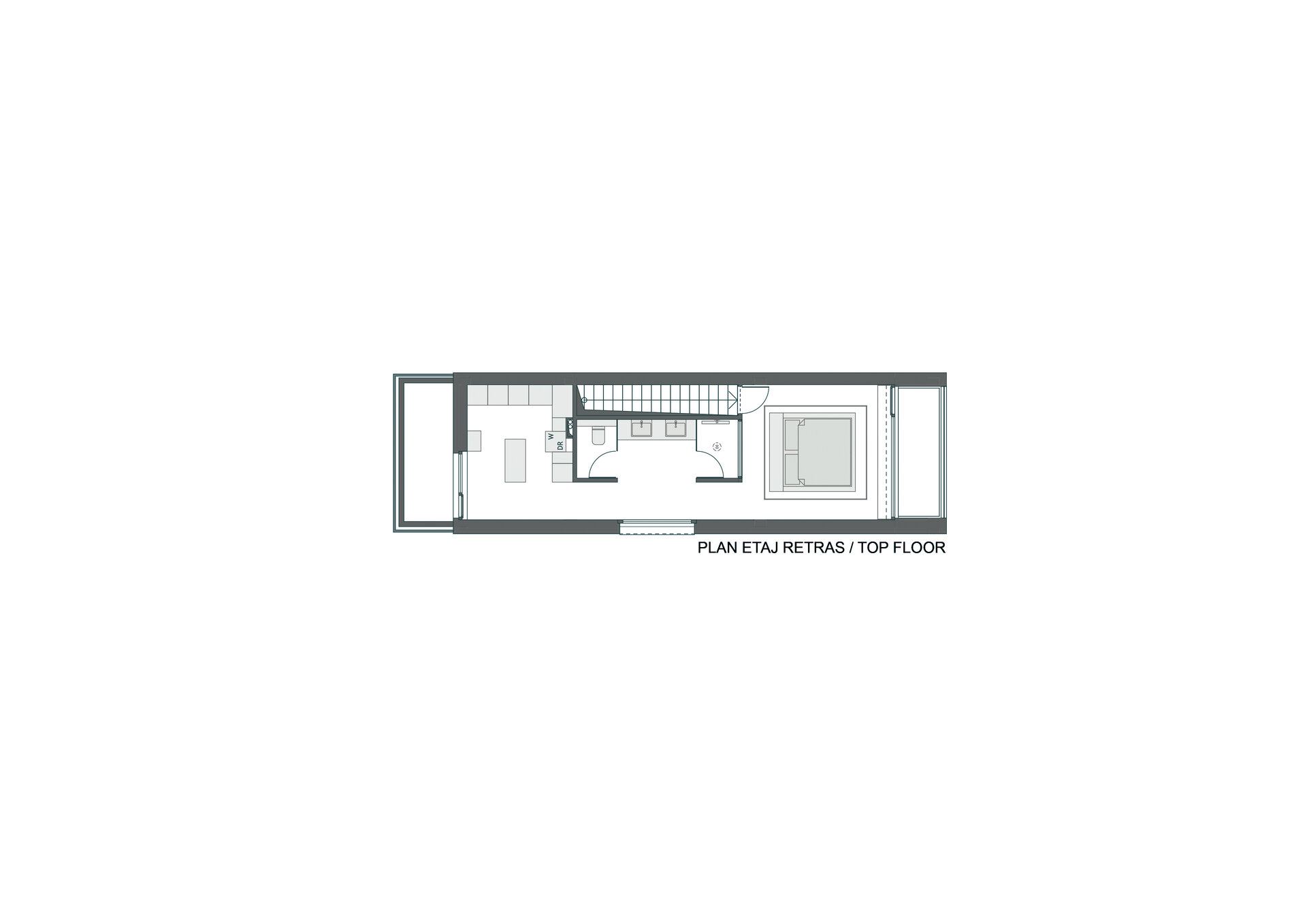 Designul este minimalist și eficient, folosind fiecare metru pătrat. În interior vei găsi un spațiu deschis care conectează pe orizontală întreaga zonă de zi cu exteriorul, dar și pe verticală cu etajul superior, prin poziționarea unui gol deasupra bucătăriei, în inima casei. În acest fel casa conectează majoritatea spațiilor interioare oferind deasemenea o comunicare directă și facilă între membrii familiei. În ciuda terenului îngust casa a fost gândită a.i. să ofere suficient spațiu pentru toate nevoile unei familii cu patru membri.