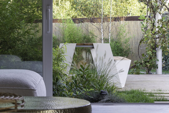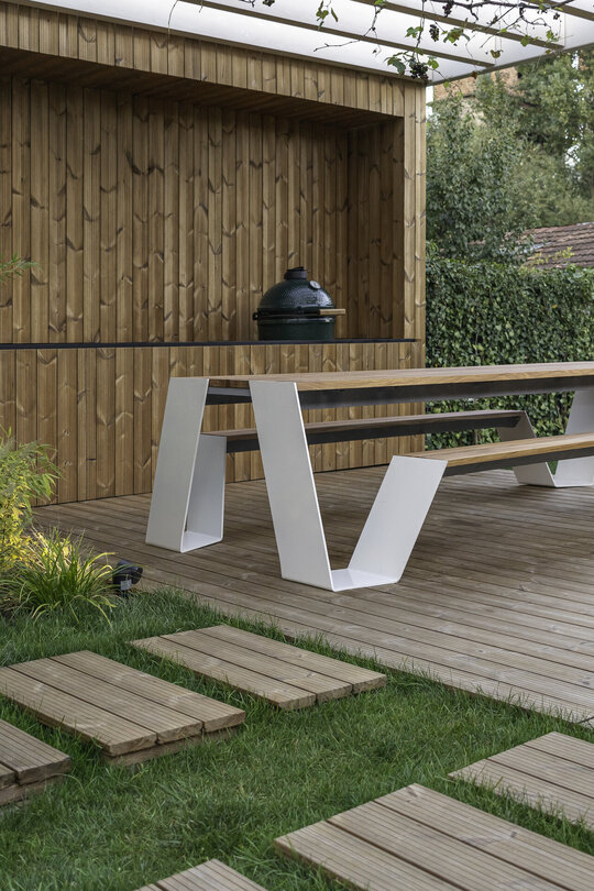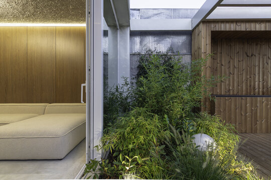 În exterior se află o curte restrânsă ,bogată în vegetație, aflată într-o conexiune intimă și relaxantă cu interiorul. Ritmul fatadei a fost preluat si in compozitia imprejmuirii.