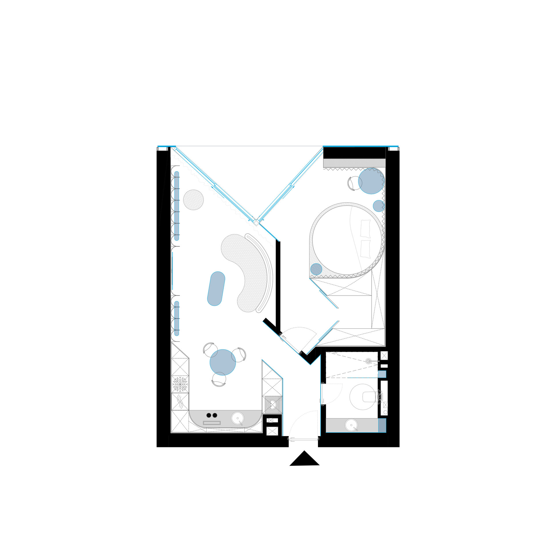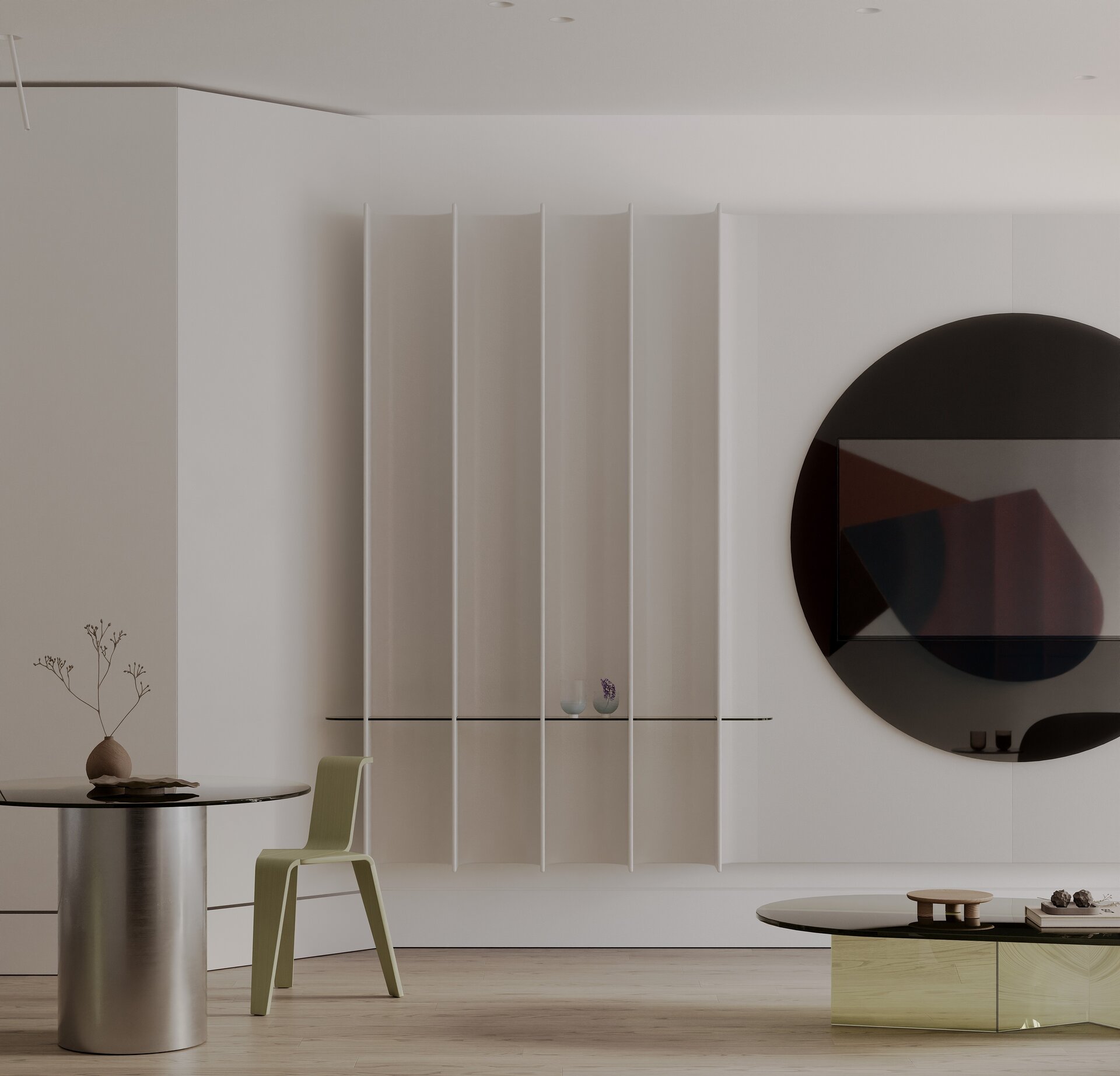 zona de zi se deschide ca un spațiu al expansiunii, unde lumina călătorește pe planuri reflectante, dizolvând limitele și multiplicând percepțiile. dimineața, contururile precise oferă claritate; după-amiaza, reflexiile fragmentate adâncesc misterul; iar seara, contururile devin fluide și contemplative. aici, oglinzile nu doar dilată spațiul, ci creează treceri simbolice către un dincolo nevăzut, făcând din prezent un teritoriu al posibilului.