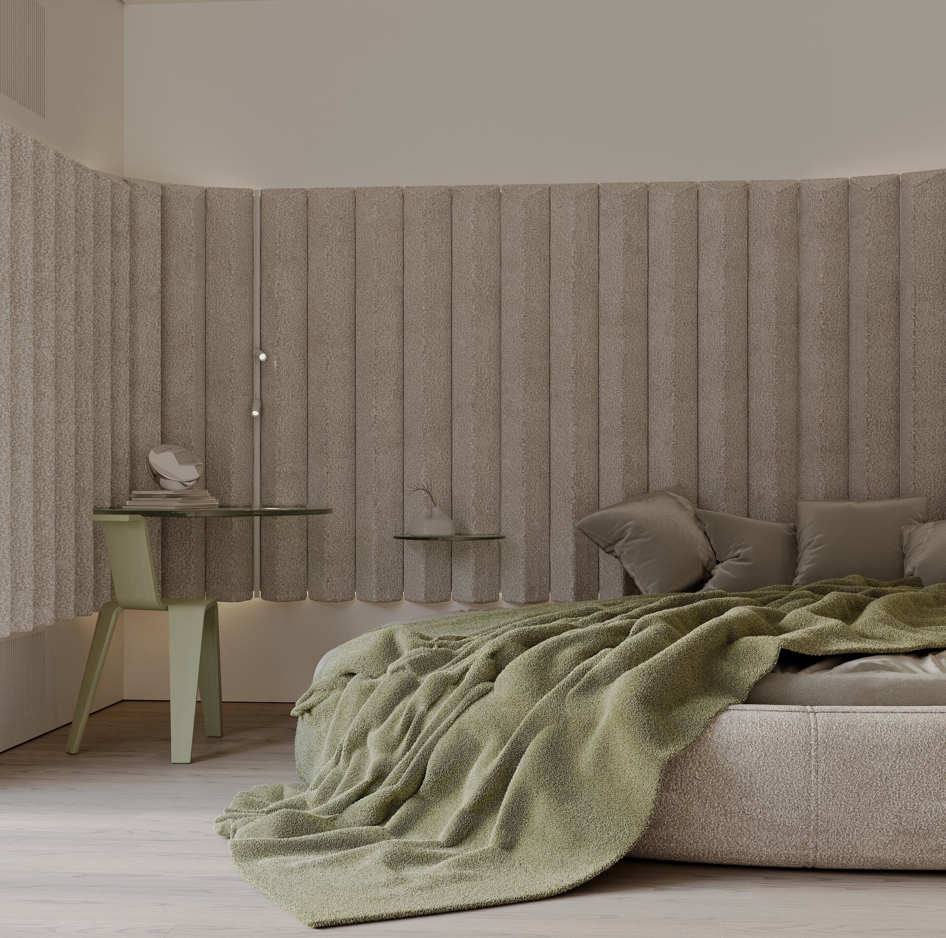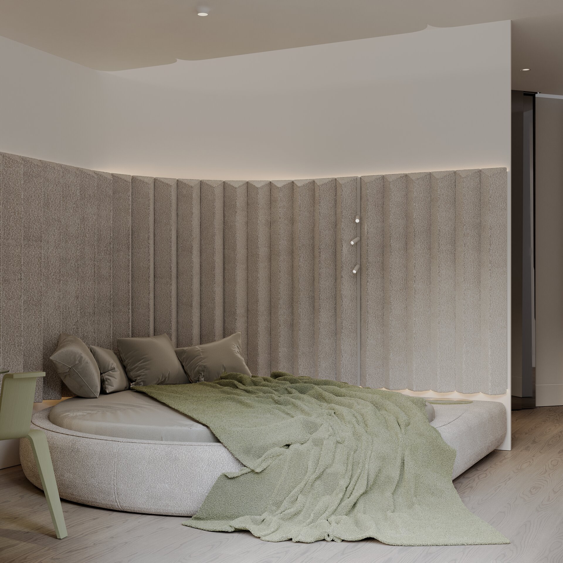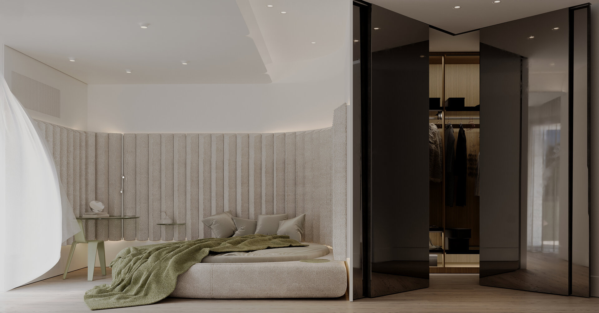 dormitorul, în schimb, aduce intimitatea unei reflecții interioare. lumina filtrată, texturile moi și tonurile discrete transformă oglinda într-un confesor al ritmurilor personale, un spațiu în care visul și memoria se împletesc. repaosul devine posibilitate, iar interioritatea capătă consistență poetică, transformând spațiul într-un sanctuar al liniștii și auto-reflecției.