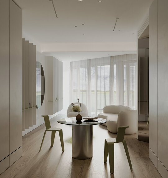 acest apartament de două camere este definit nu doar de limitele sale fizice, ci și de felul în care reflexiile dau naștere unor viziuni. interiorul devine o scenă a timpului, unde oglinzile surprind complexitatea existenței și, totodată, oferă priviri fugare către ceea ce se află dincolo de spațiul creativ și imaginația infinită.