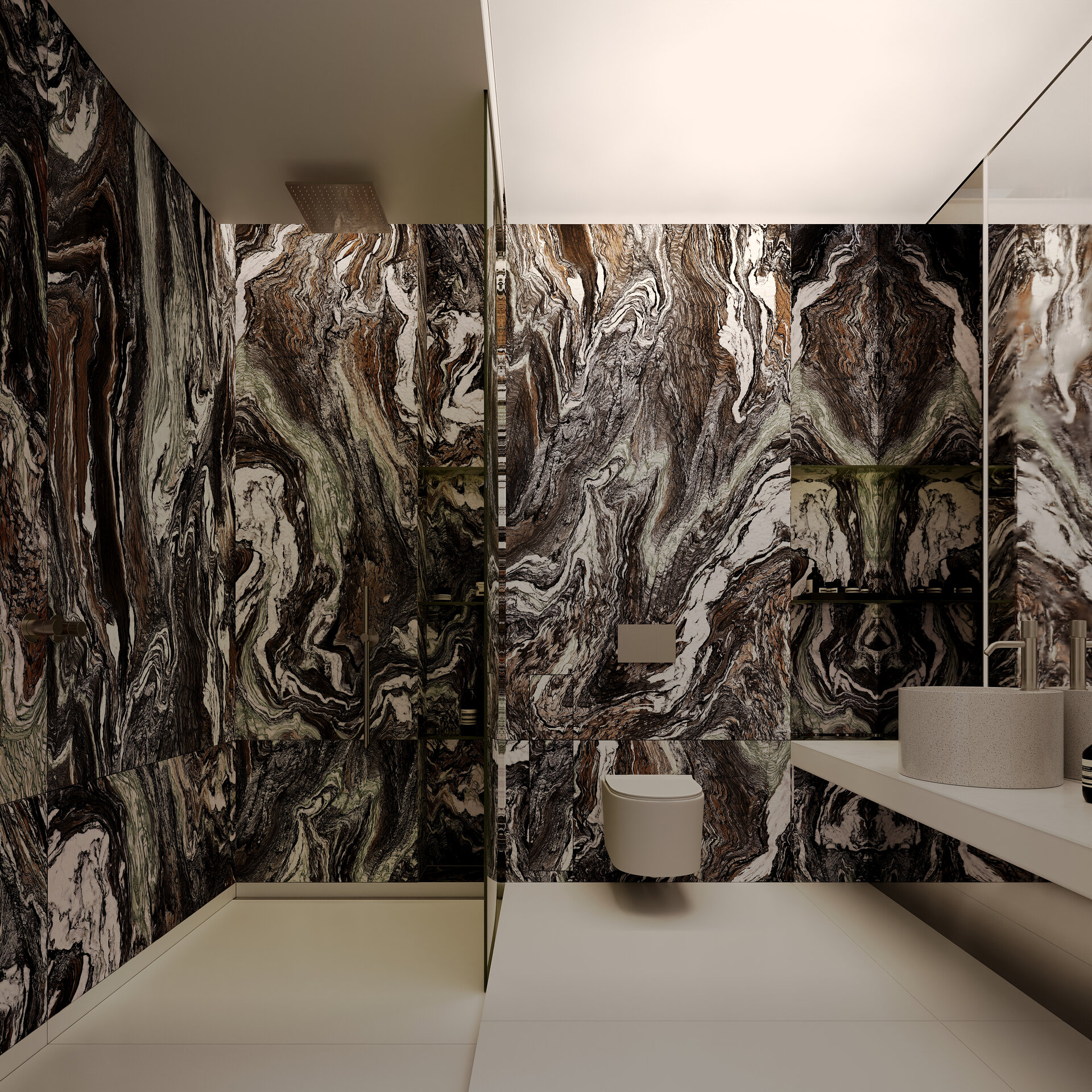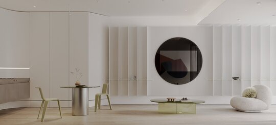paleta materială sprijină această narativă poetică: sticla și piatra lustruită dau claritate și luminozitate, lemnul și textilele adaugă căldură și ancorare, în timp ce accentele metalice și transparențele stratificate sugerează fluiditate și surpriză. designul este completat de subtilul joc al materialității, de tehnologii discrete și de o poveste arhitecturală cu tentă poetică, care invită privitorul să pășească într-o lume unde fiecare reflexie devine revelație, iar fiecare spațiu – un sanctuar atemporal al posibilităților.