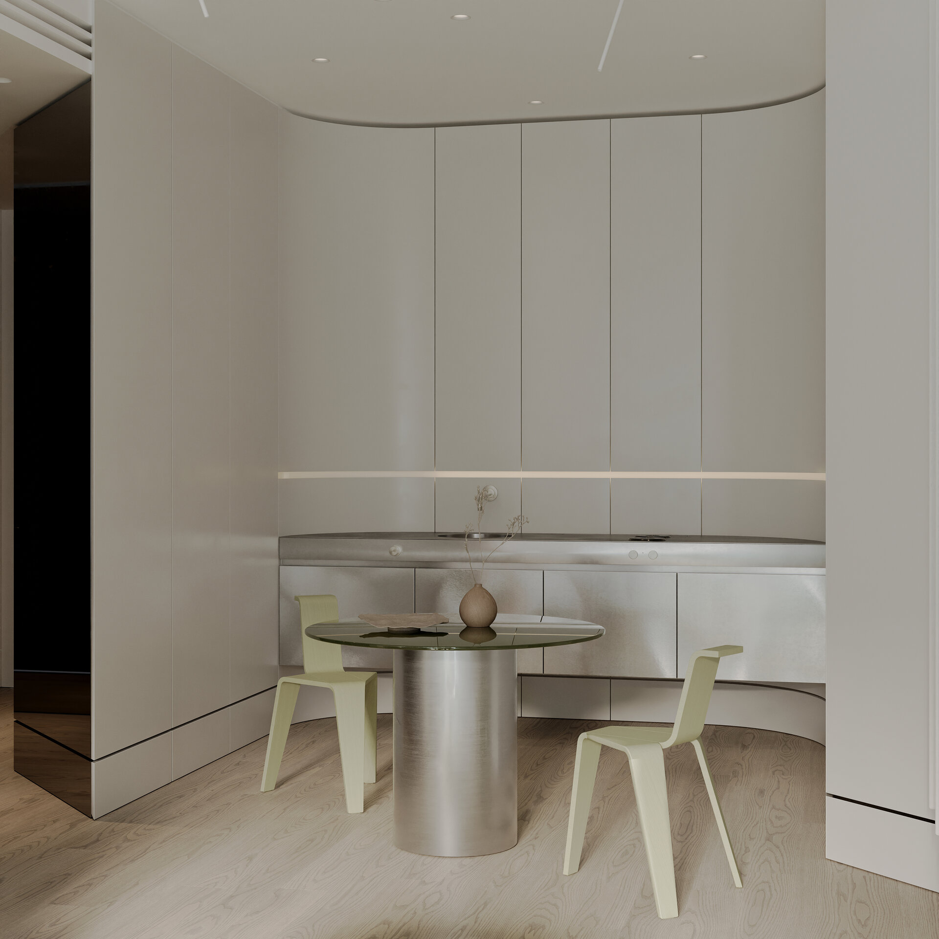 bucătăria și zonele de tranziție se animă prin gesturile colective, unde reflexia se multiplică și capătă o dimensiune comunitară. suprafețele lucioase capturează mișcările și conversațiile, iar lumina le refractă în ritmuri comune, adunând individualul și comunitarul într-o orchestră coerentă a vieții domestice.
