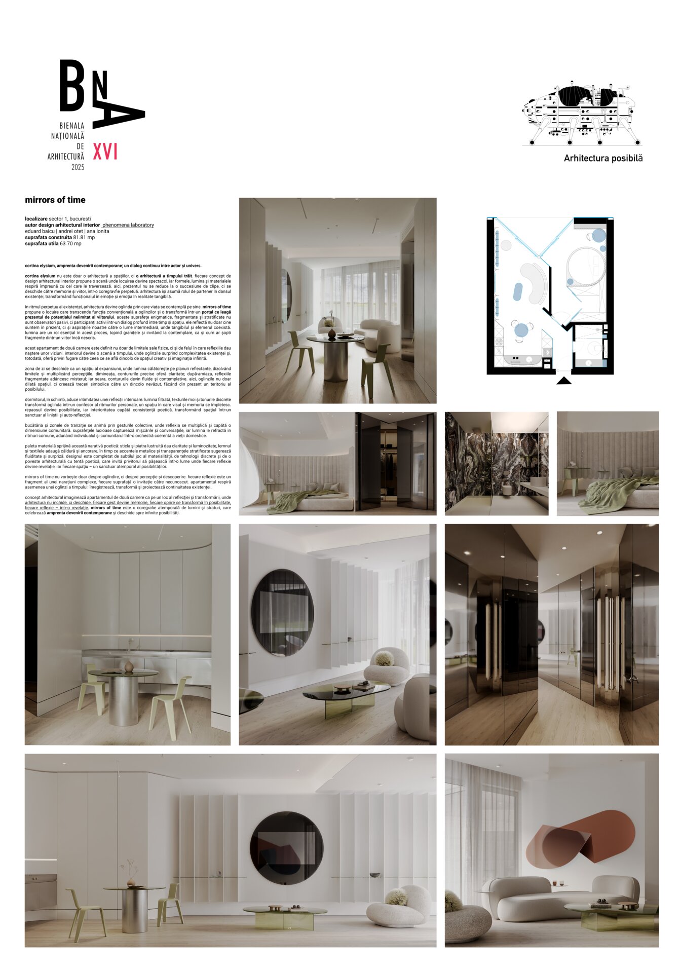 concept arhitectural imaginează apartamentul de două camere ca pe un loc al reflecției și transformării, unde arhitectura nu închide, ci deschide. fiecare gest devine memorie, fiecare oprire se transformă în posibilitate, fiecare reflexie – într-o revelație. mirrors of time este o coregrafie atemporală de lumini și straturi, care celebrează amprenta devenirii contemporane și deschide spre infinite posibilități.