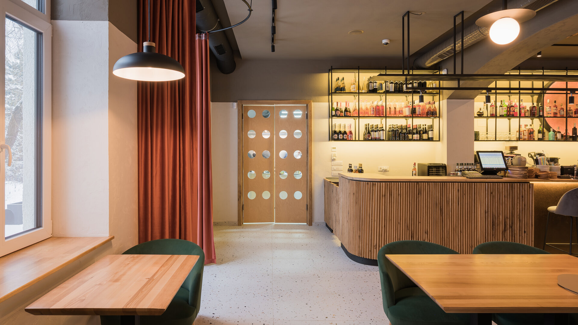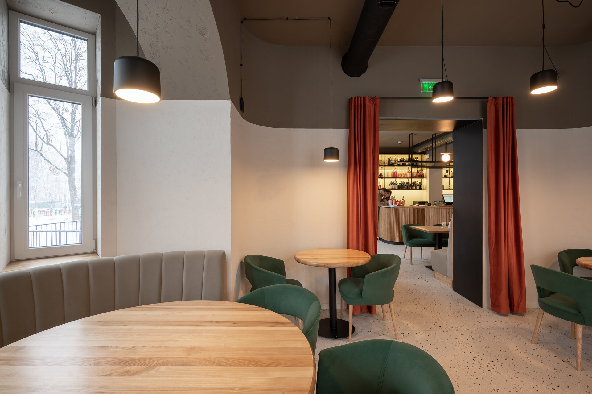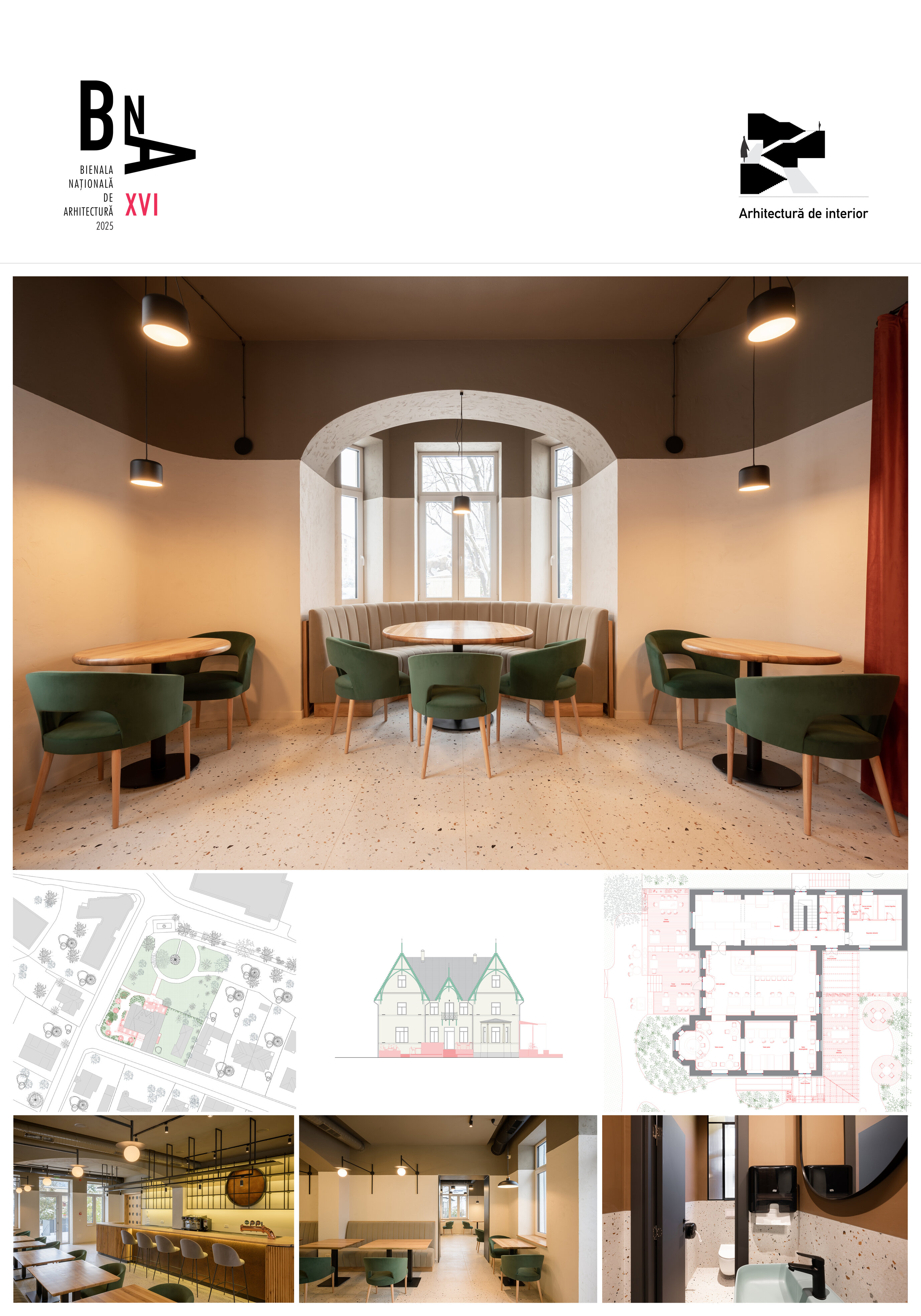 Astfel, accesul principal de pe latura nordică, dar și cel secundar de pe latura vestică, se deschid către grădină, generând o comunicare fluidă între spațiul interior și cel exterior al restaurantului.