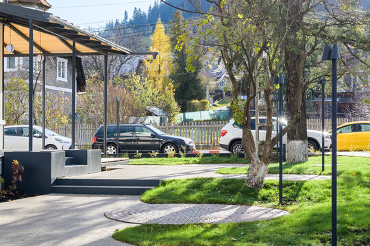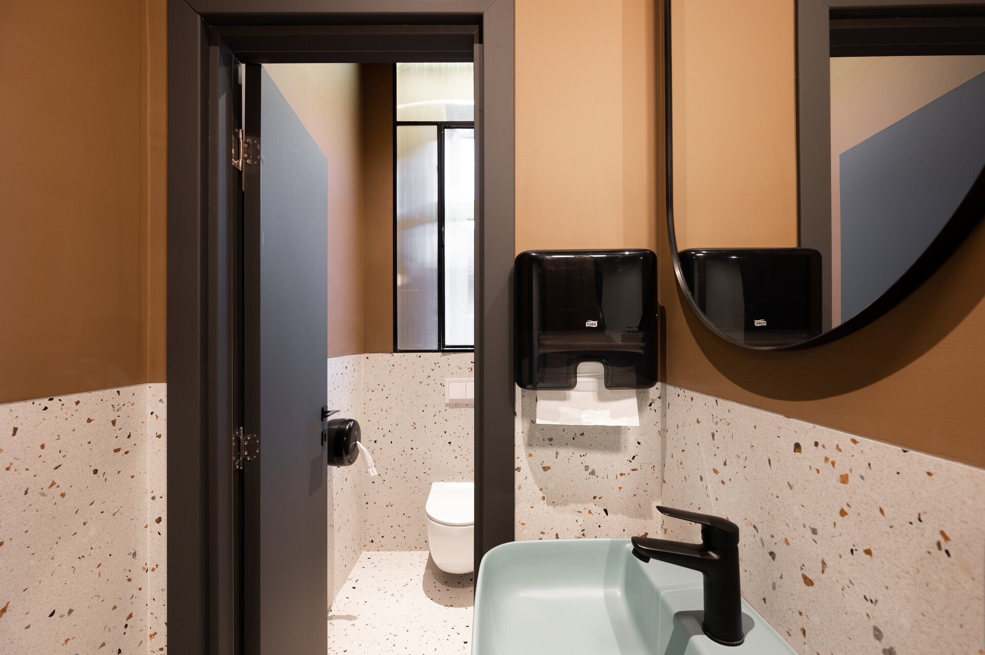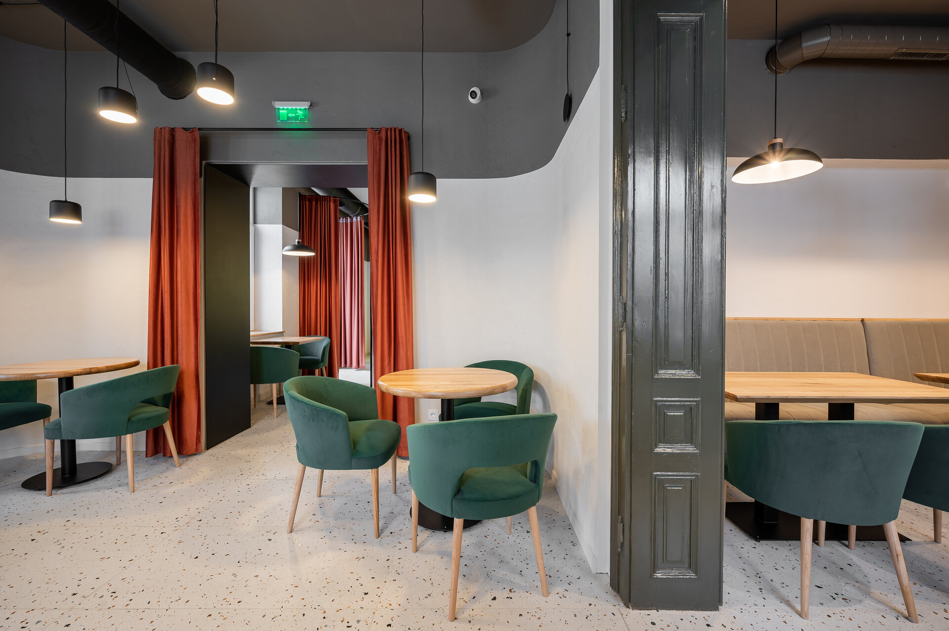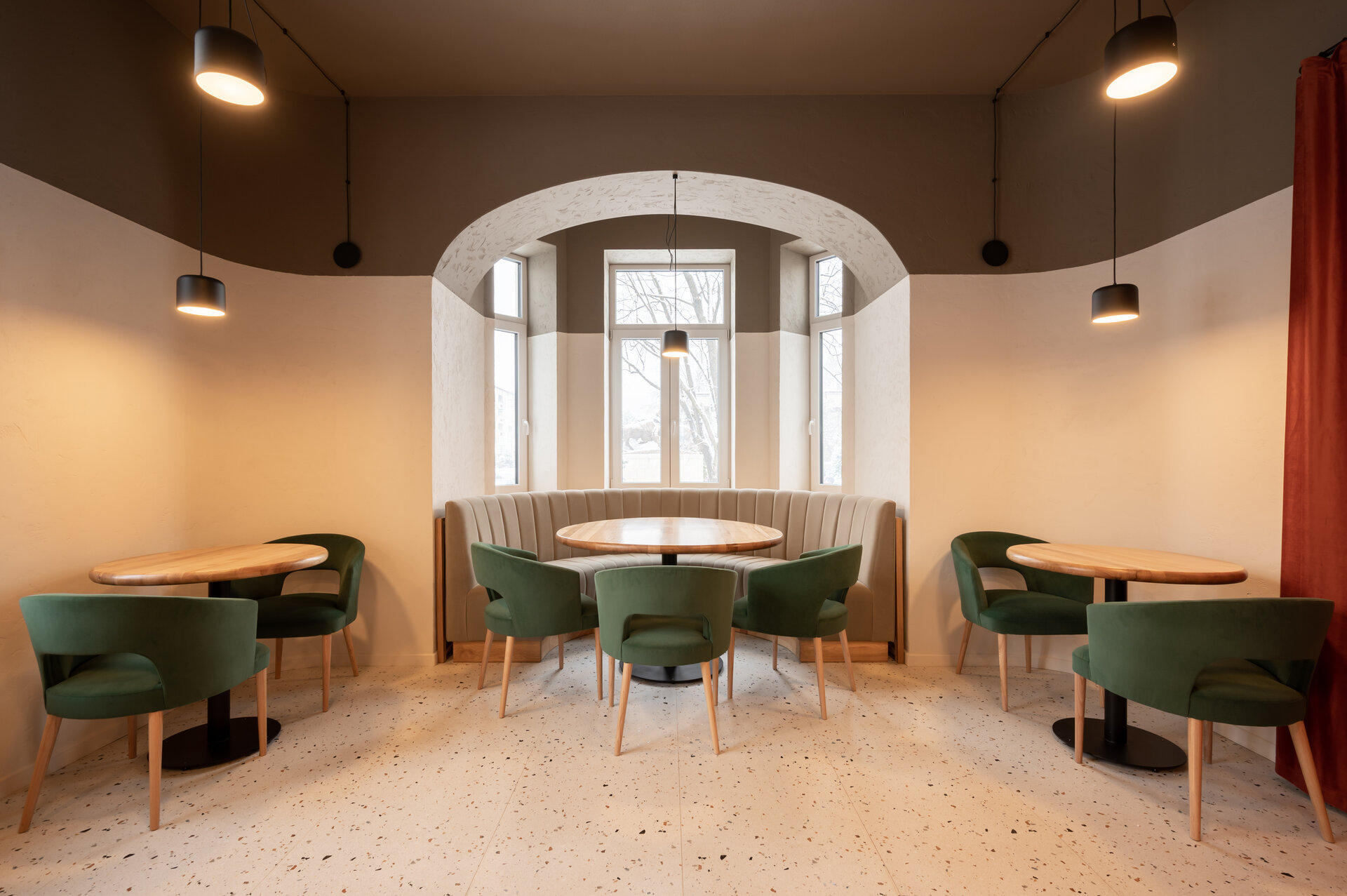 Astfel, accesul principal de pe latura nordică, dar și cel secundar de pe latura vestică, se deschid către grădină, generând o comunicare fluidă între spațiul interior și cel exterior al restaurantului.