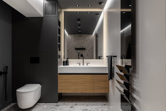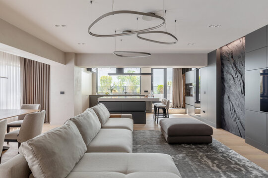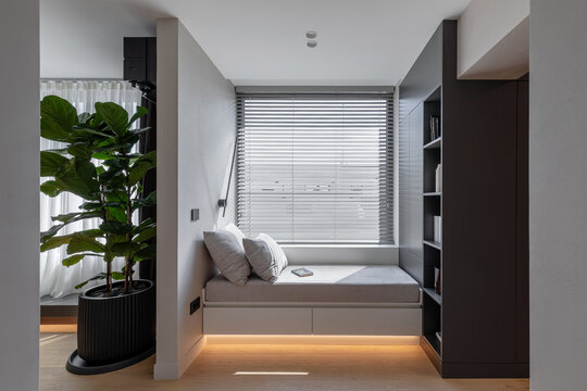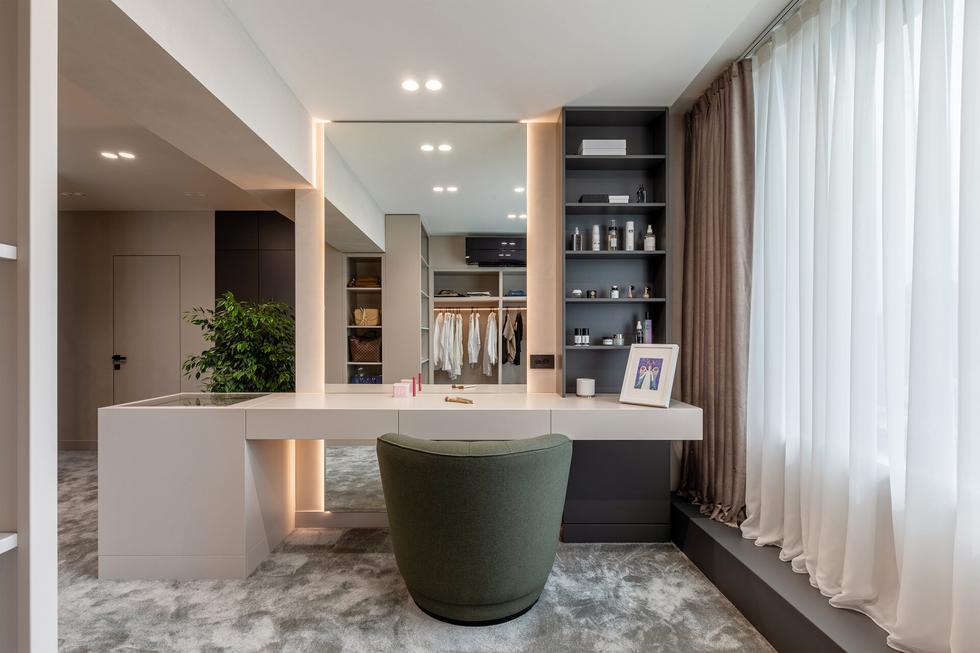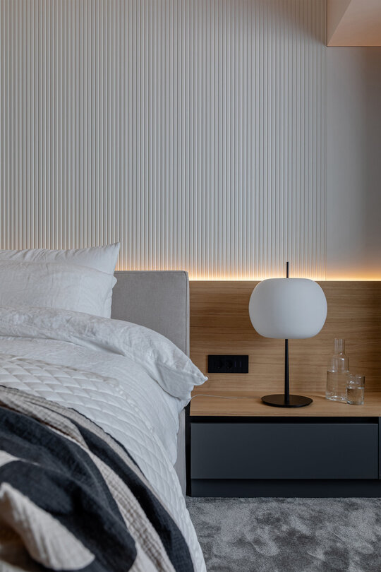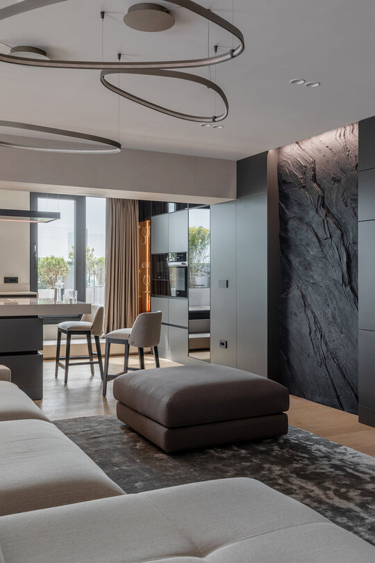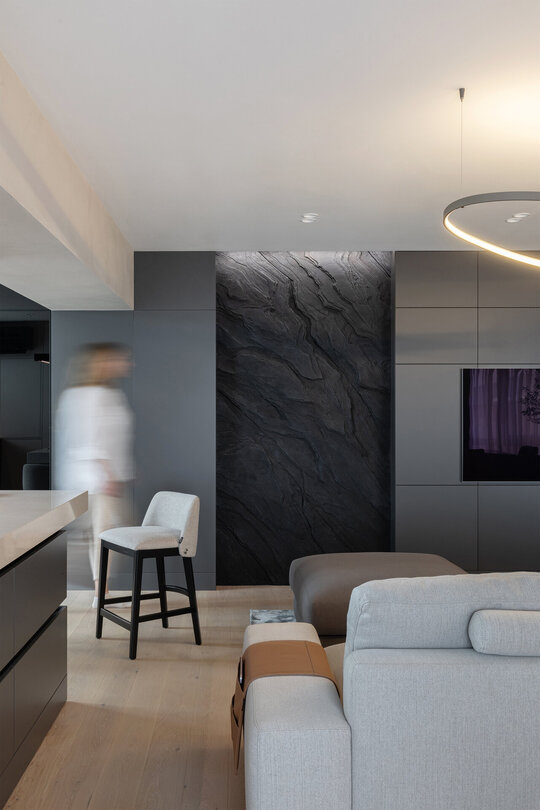 În interior, zona de zi este bine delimitată față de cea de noapte, dar se armonizează estetic și geometric prin linii și volume continue, texturi și cromatică unitare. În zona de zi, peretele sculptat este elementul de contrast, care aduce echilibrul în raport cu neutralitatea și rafinamentul corpurilor de mobilier și ale celorlalte finisaje.