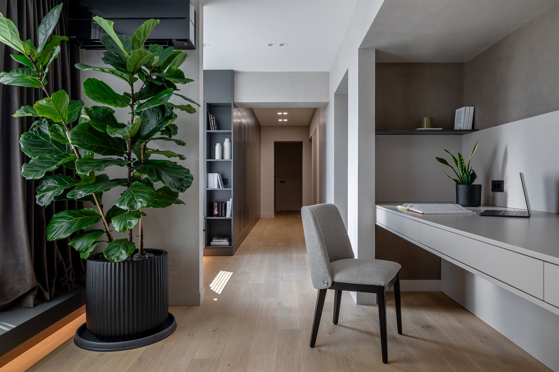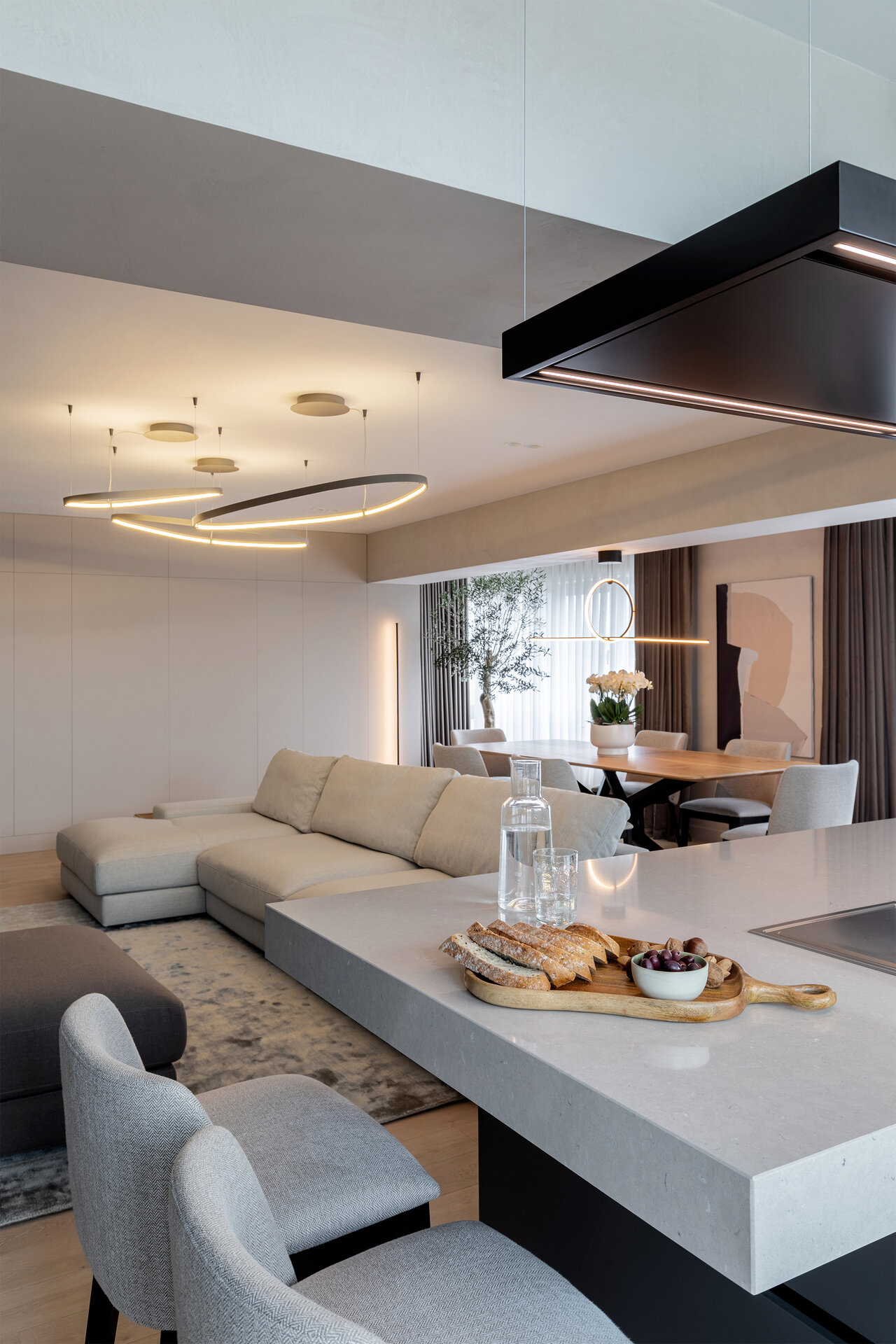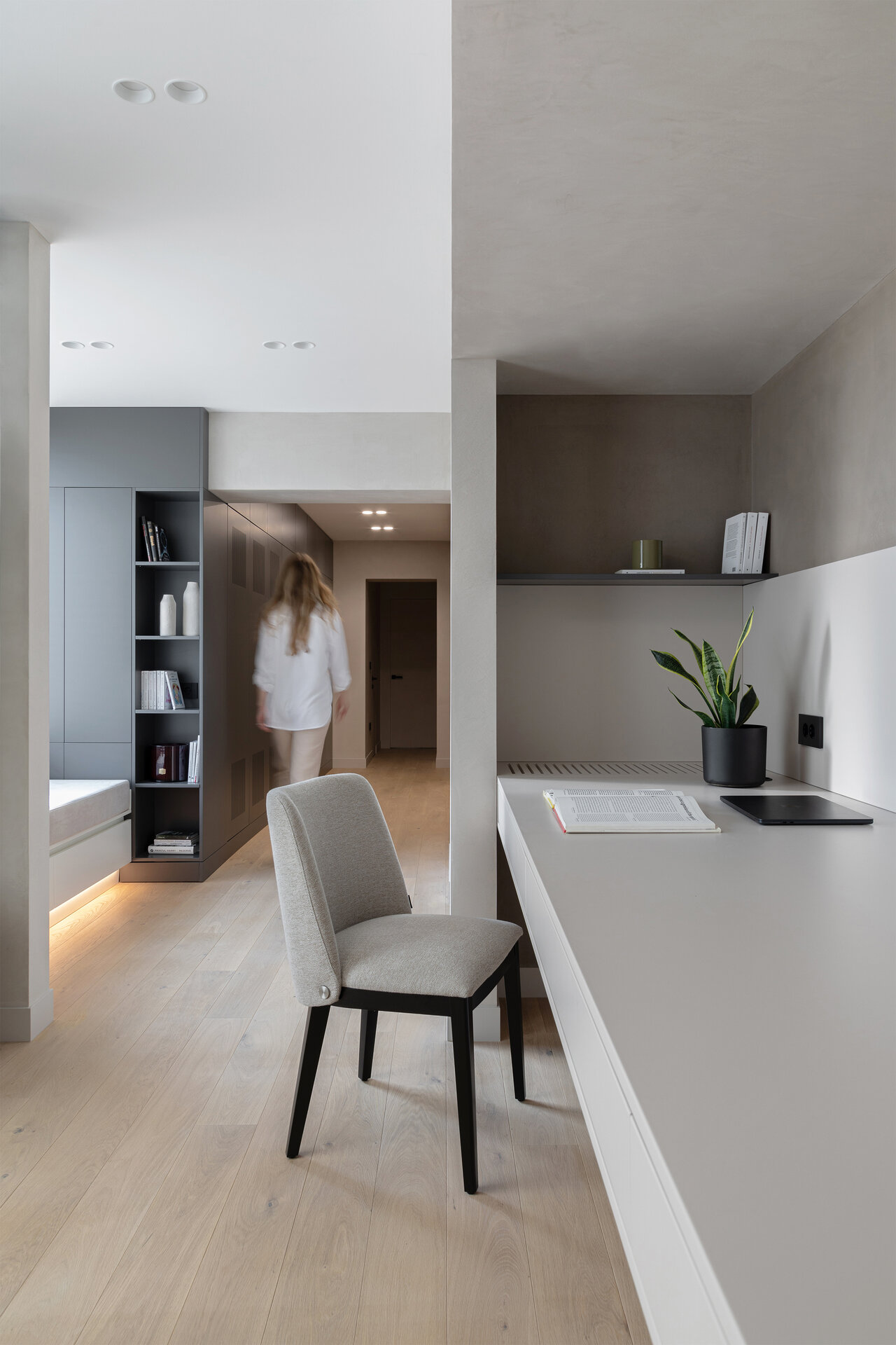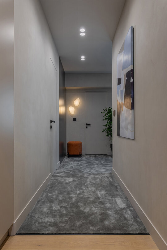 Acest proiect are ca punct de plecare un spațiu existent, a cărui compartimentare am ales să nu o modificăm, ci să căutăm o modalitate de a conecta și unifica spațiile interioare. Ne-am folosit de o serie de gesturi estetice și de o gândire de ansamblu, pornind de la scara macro, până la detalii, pentru a defini un interior curat și luminos, armonios cromatic, cu texturi care se completează și accente care creează dinamică.