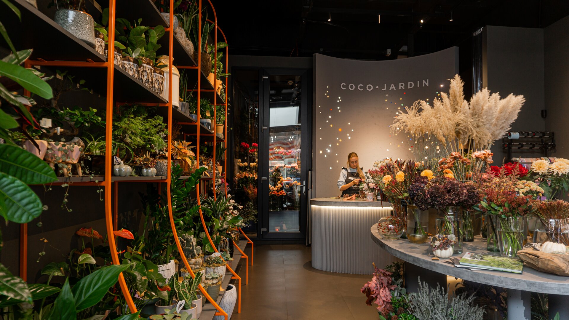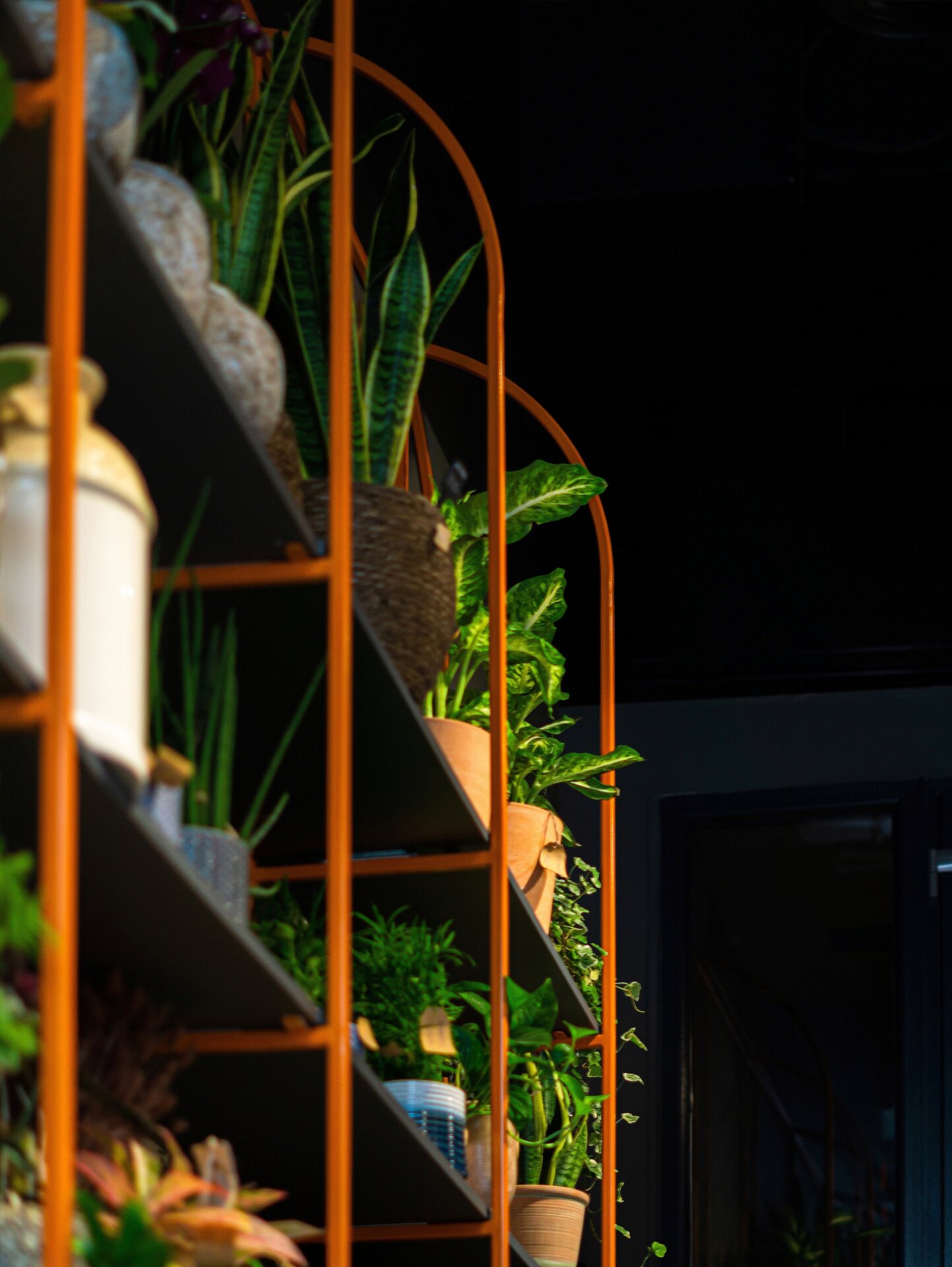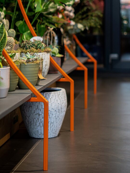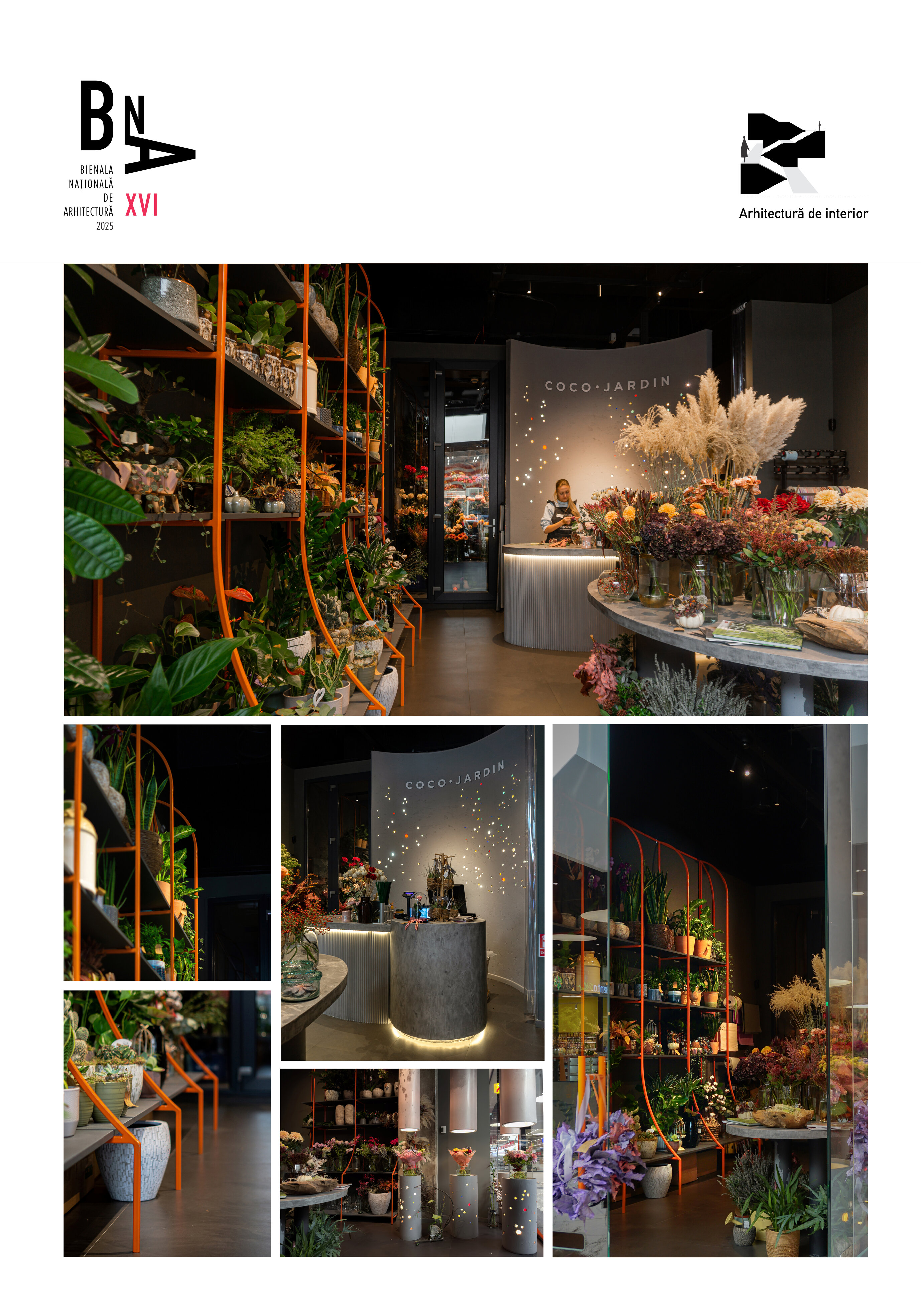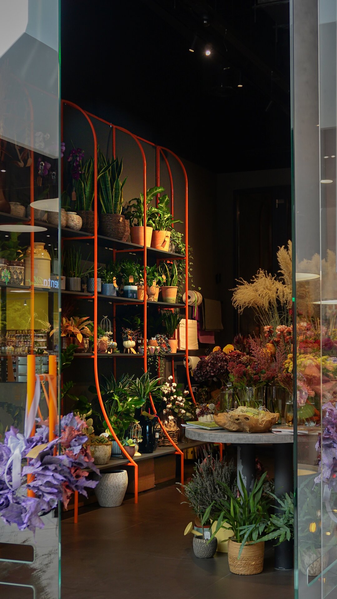 Mobilierul destinat expunerii plantelor este realizat din structuri metalice vopsite într-o nuanță vibrantă de orange, care amplifică energia cromatică a florilor. În contrast, pereții și plafonul, finisate în tonuri închise, oferă un fundal neutru ce pune în valoare volumetria pieselor, lumina și vegetația. Atmosfera este controlată, aproape teatrală, dar mereu vie, datorită aranjamentelor florale în continuă schimbare.
