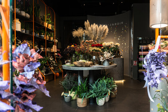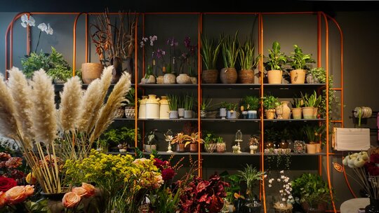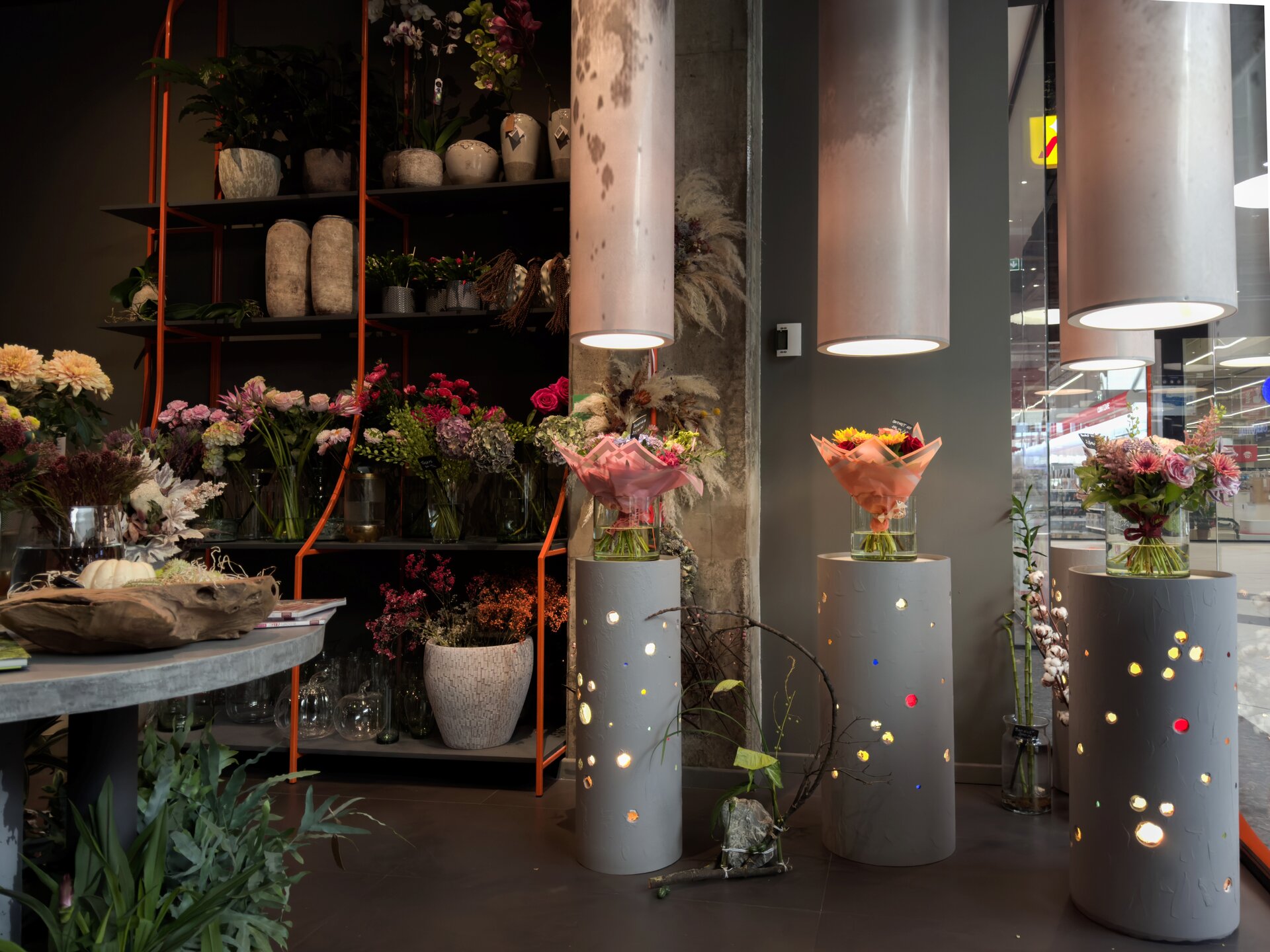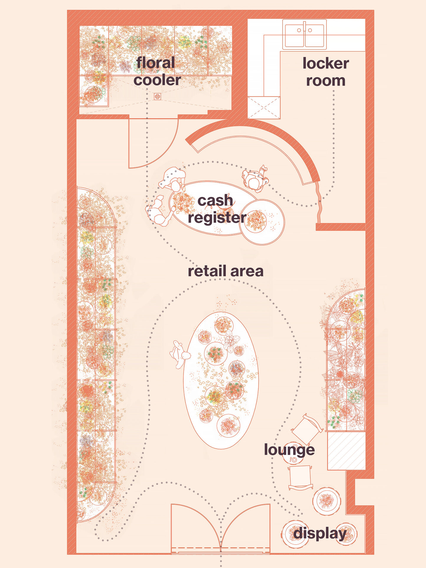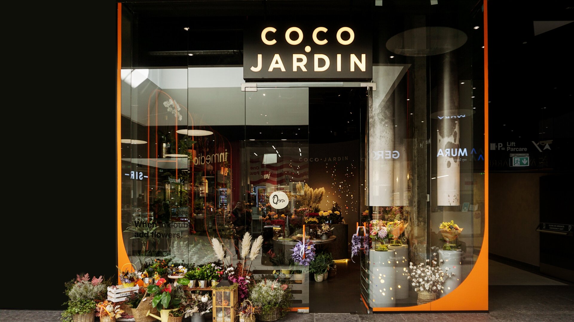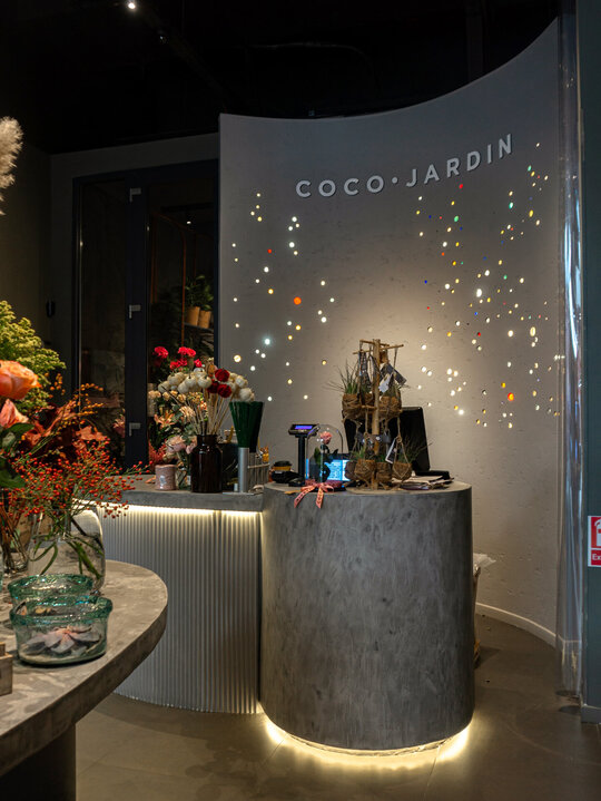 Mobilierul destinat expunerii plantelor este realizat din structuri metalice vopsite într-o nuanță vibrantă de orange, care amplifică energia cromatică a florilor. În contrast, pereții și plafonul, finisate în tonuri închise, oferă un fundal neutru ce pune în valoare volumetria pieselor, lumina și vegetația. Atmosfera este controlată, aproape teatrală, dar mereu vie, datorită aranjamentelor florale în continuă schimbare.