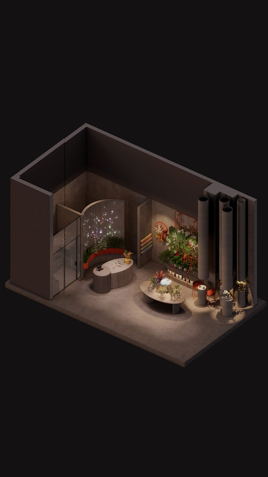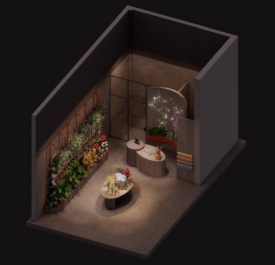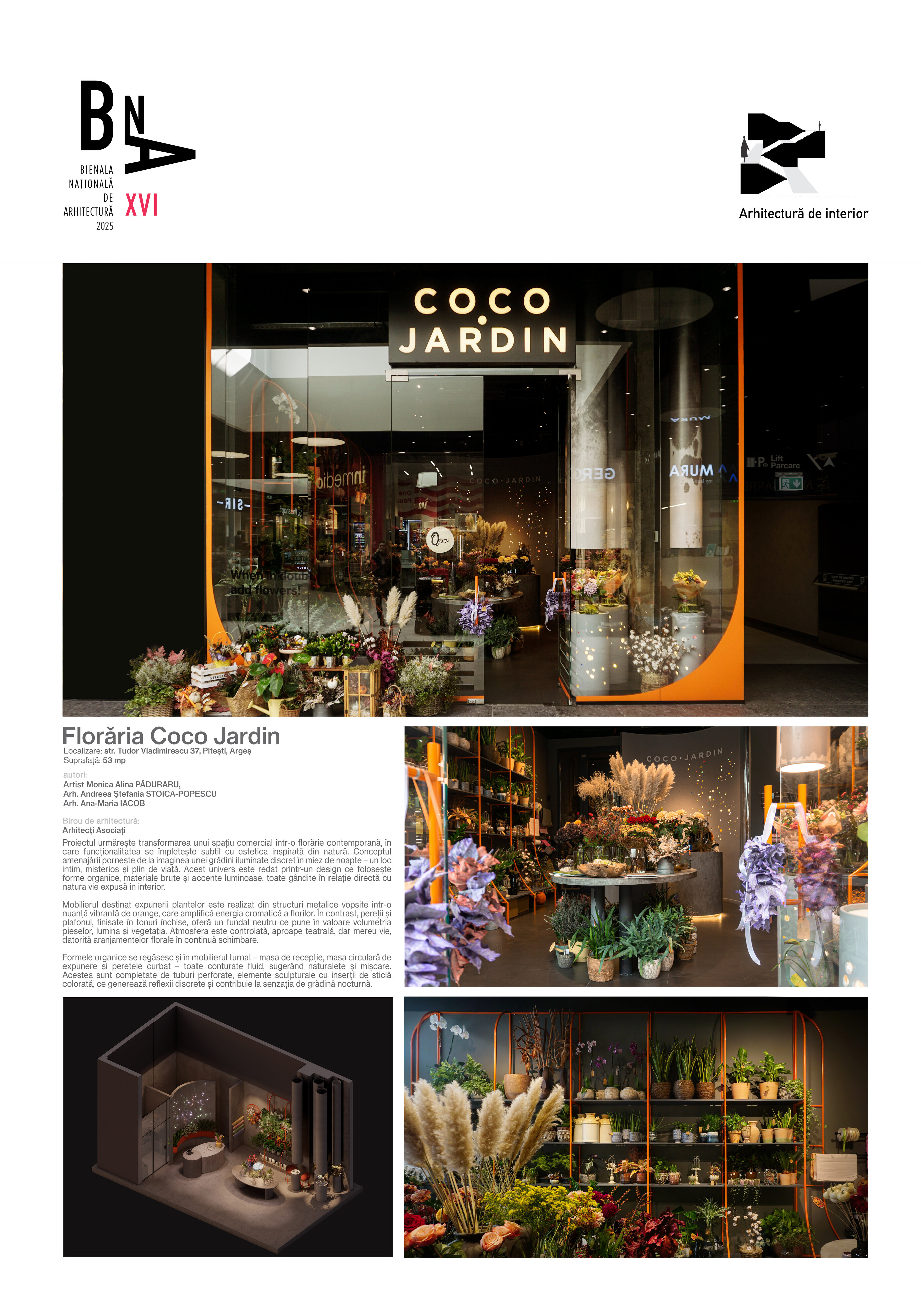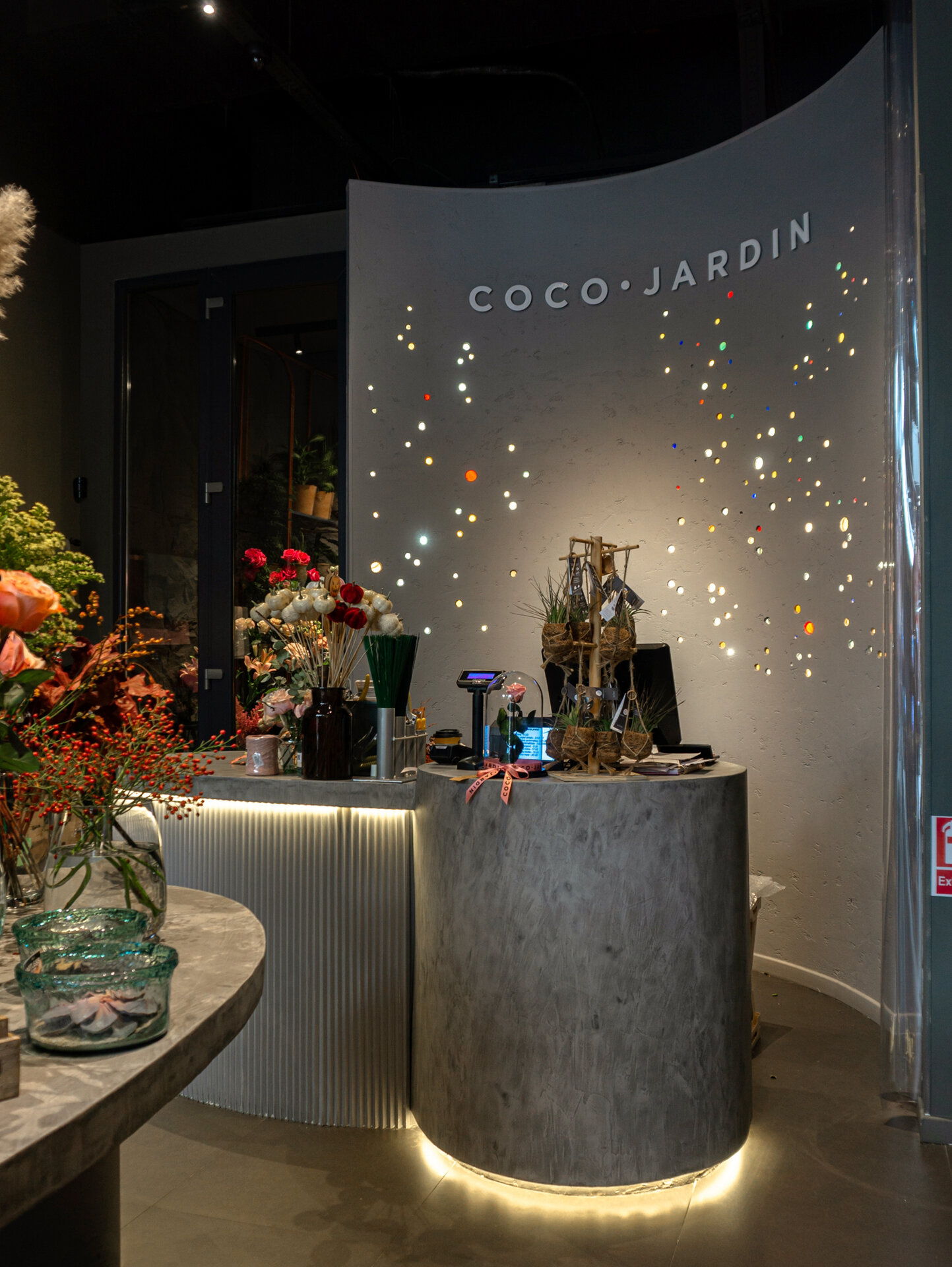 Proiectul urmărește transformarea unui spațiu comercial într-o florărie contemporană, în care funcționalitatea se împletește subtil cu estetica inspirată din natură. Conceptul amenajării pornește de la imaginea unei grădini iluminate discret în miez de noapte – un loc intim, misterios și plin de viață. Acest univers este redat printr-un design ce folosește forme organice, materiale brute și accente luminoase, toate gândite în relație directă cu natura vie expusă în interior.