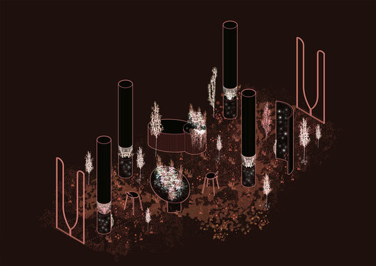 Formele organice se regăsesc și în mobilierul turnat – masa de recepție, masa circulară de expunere și peretele curbat – toate conturate fluid, sugerând naturalețe și mișcare. Acestea sunt completate de tuburi perforate, elemente sculpturale cu inserții de sticlă colorată, ce generează reflexii discrete și contribuie la senzația de grădină nocturnă.