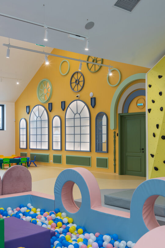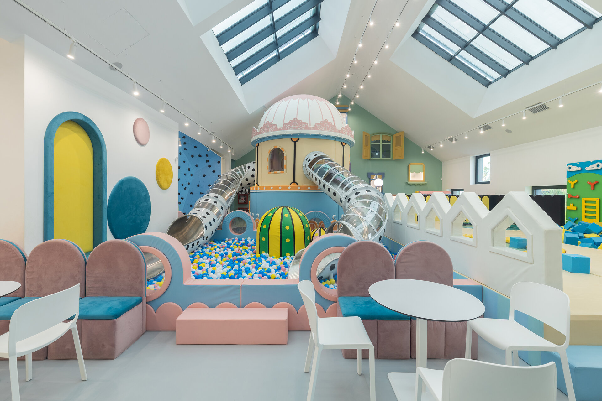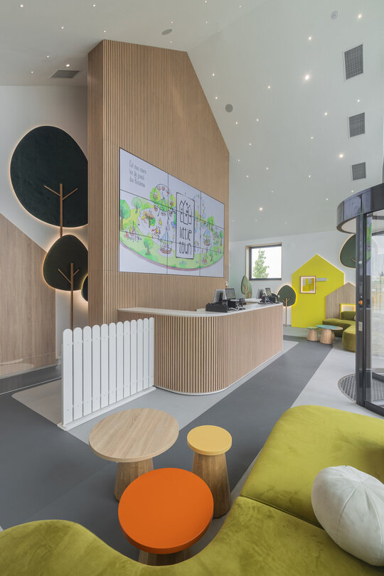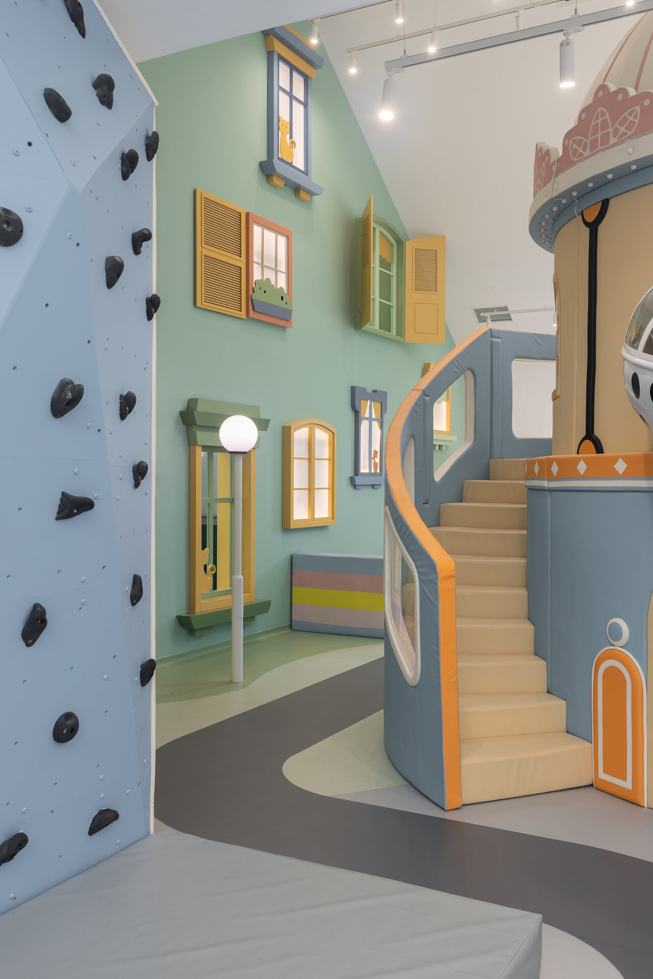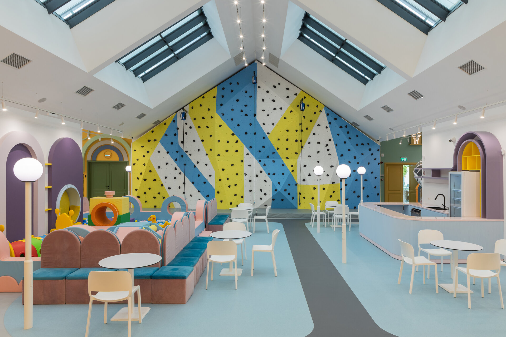 Paleta cromatică este alcătuită din nuanțe pastelate, combinate cu texturi calde de lemn și terrazzo, pentru a crea o atmosferă primitoare, luminoasă, cu accente nordice. Fiecare căsuță destinată evenimentelor este individualizată printr-o culoare dominantă și are o legătură directă cu locul de joacă exterior. De asemenea, fiecare beneficiază de o zonă de supantă, o „casă în casă”, accesibilă doar copiilor, cu tobogan, unde cei mici își pot imagina propriul univers și de unde pot observa întregul spațiu de joacă interior.