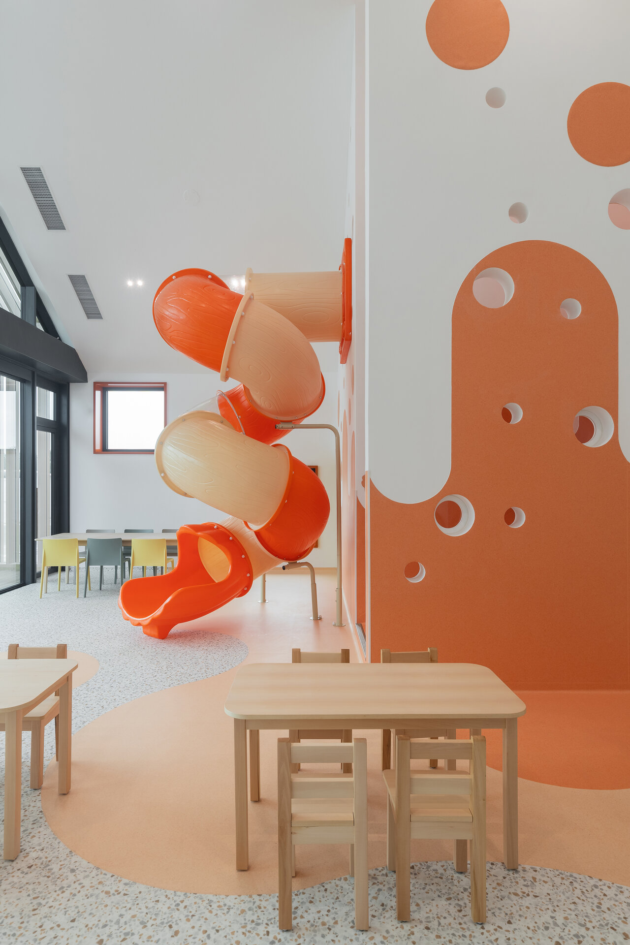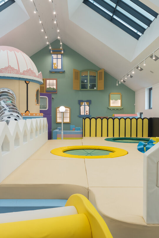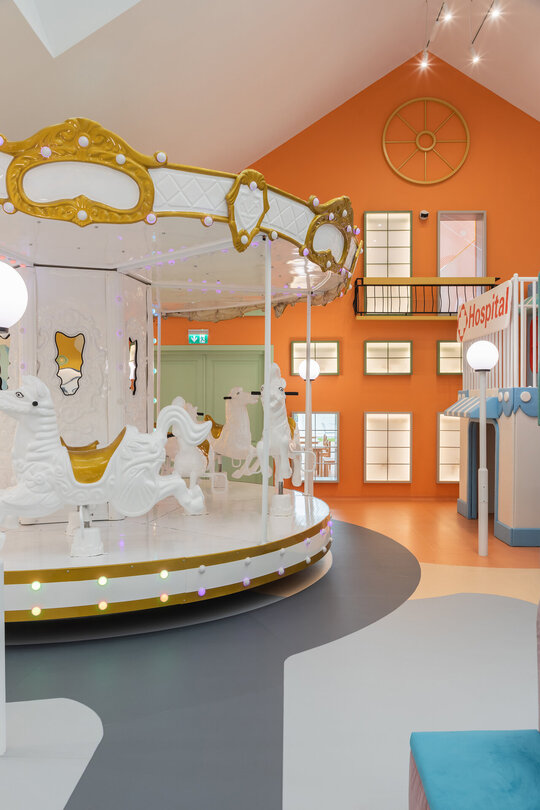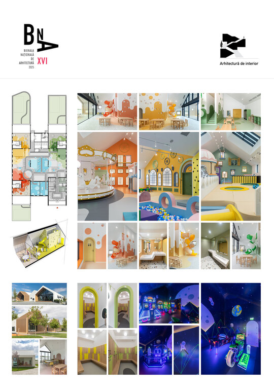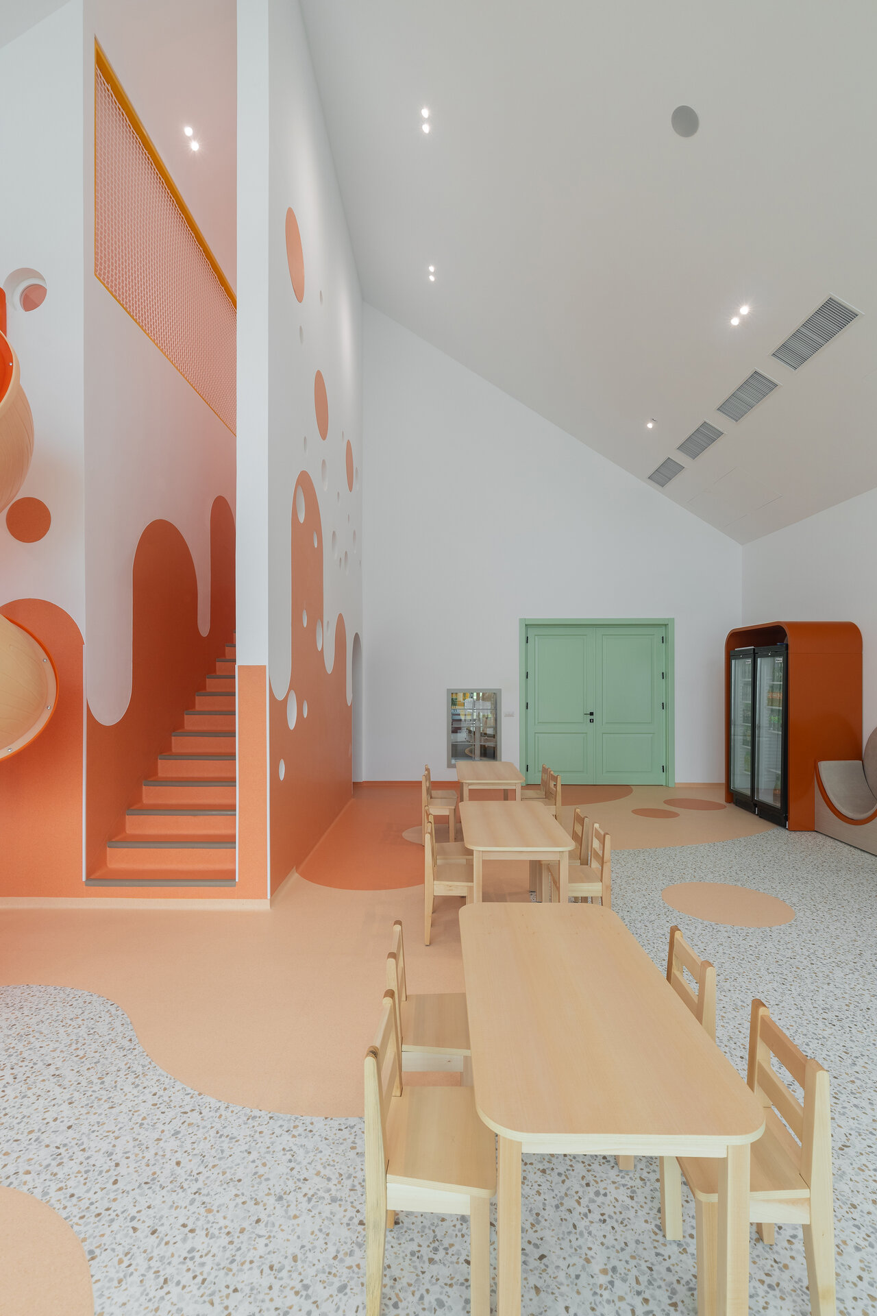 Paleta cromatică este alcătuită din nuanțe pastelate, combinate cu texturi calde de lemn și terrazzo, pentru a crea o atmosferă primitoare, luminoasă, cu accente nordice. Fiecare căsuță destinată evenimentelor este individualizată printr-o culoare dominantă și are o legătură directă cu locul de joacă exterior. De asemenea, fiecare beneficiază de o zonă de supantă, o „casă în casă”, accesibilă doar copiilor, cu tobogan, unde cei mici își pot imagina propriul univers și de unde pot observa întregul spațiu de joacă interior.