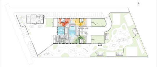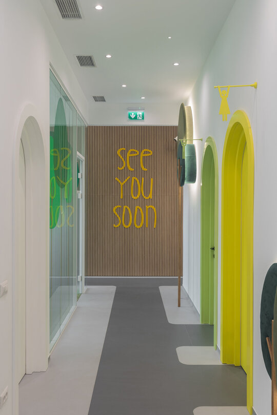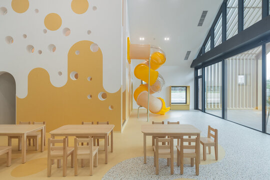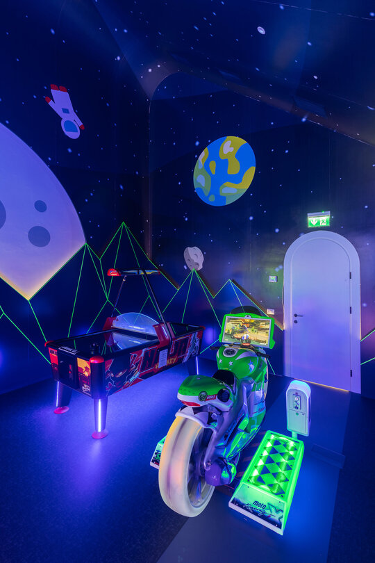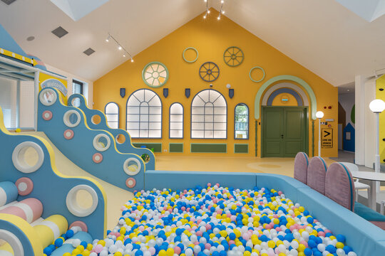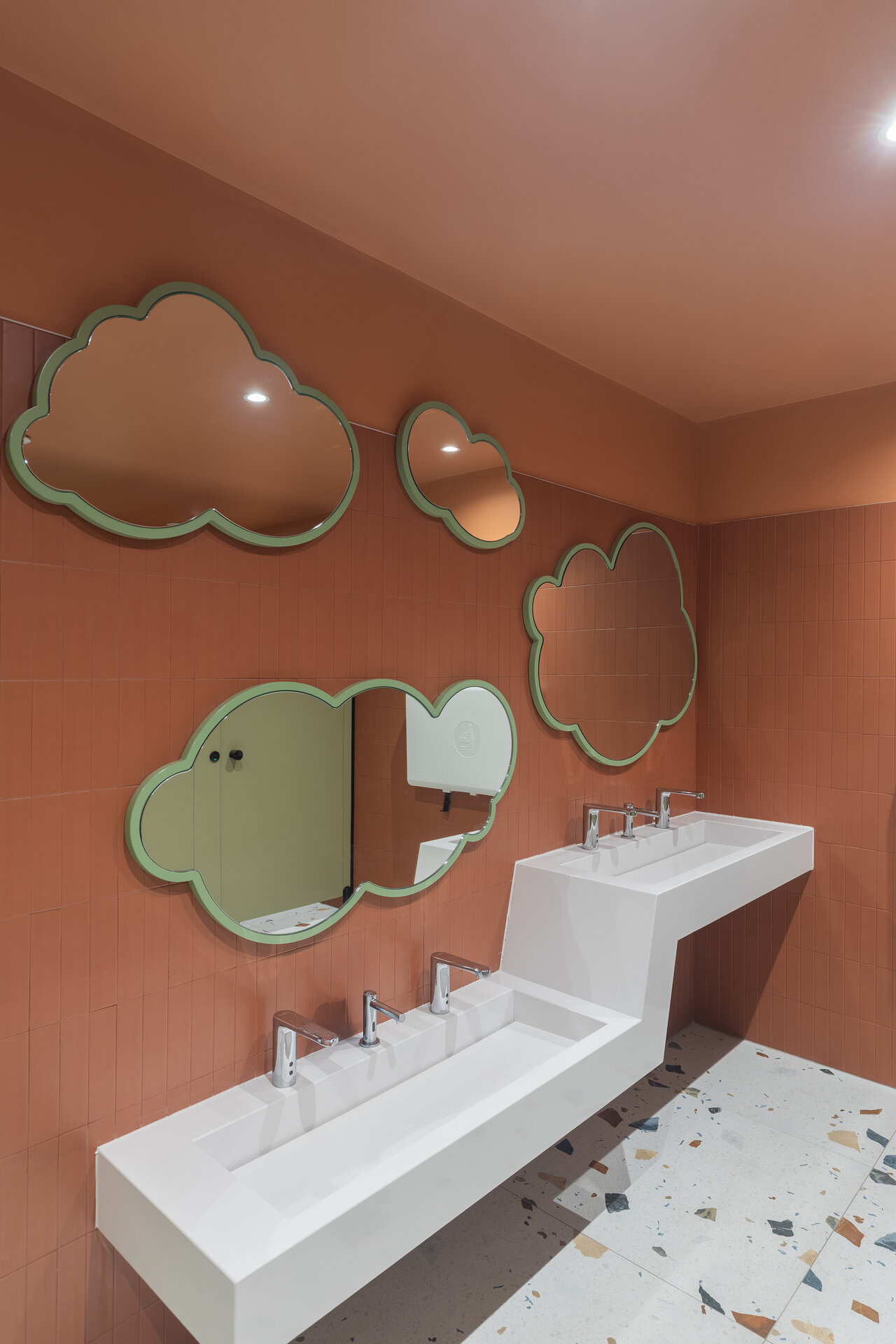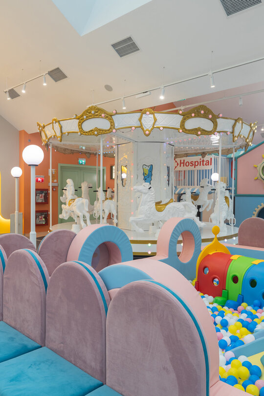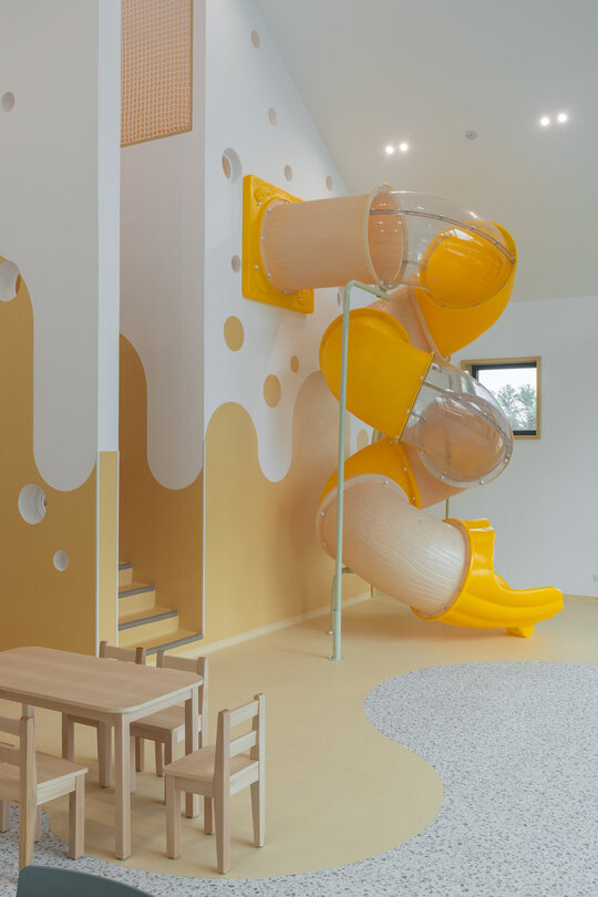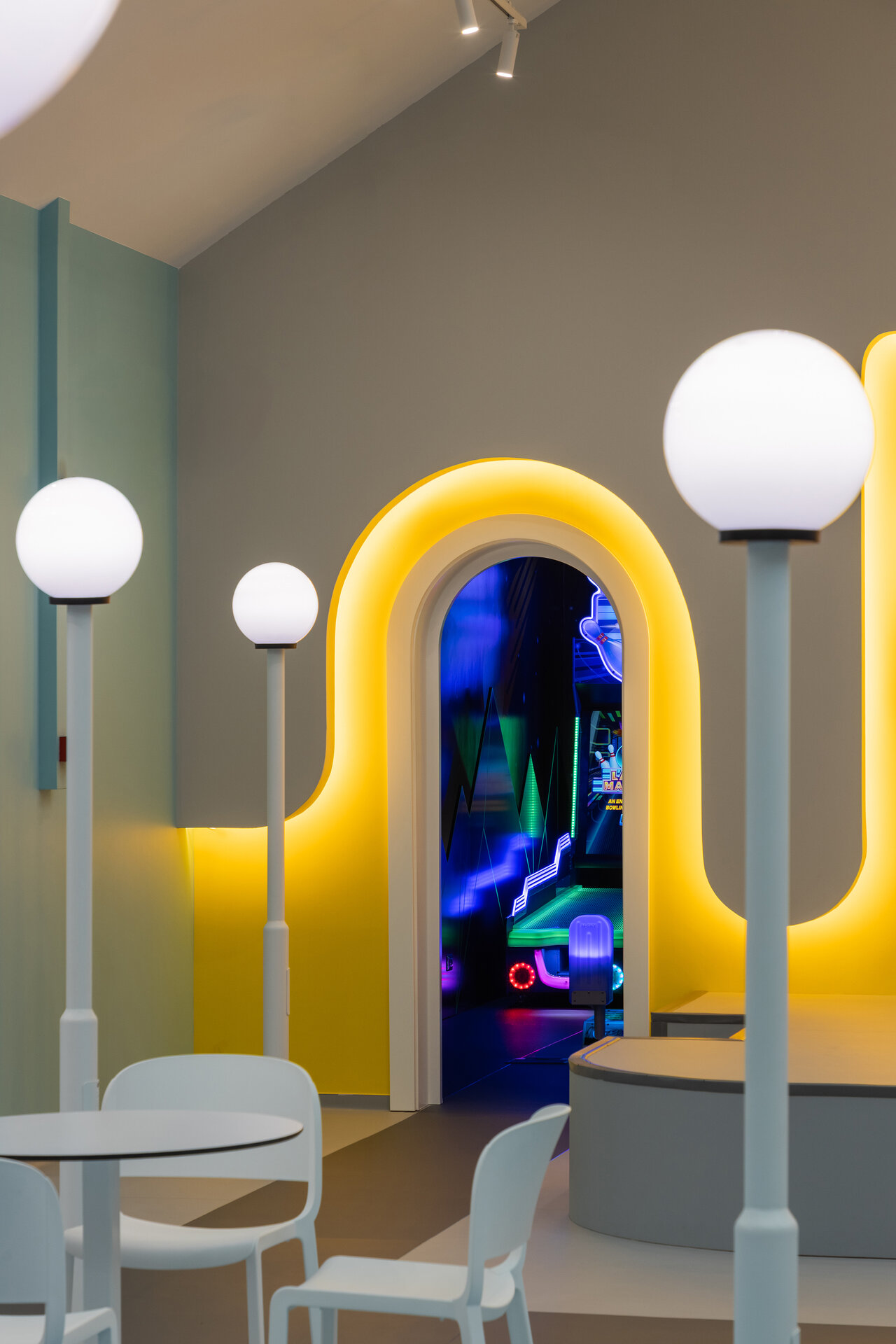 Paleta cromatică este alcătuită din nuanțe pastelate, combinate cu texturi calde de lemn și terrazzo, pentru a crea o atmosferă primitoare, luminoasă, cu accente nordice. Fiecare căsuță destinată evenimentelor este individualizată printr-o culoare dominantă și are o legătură directă cu locul de joacă exterior. De asemenea, fiecare beneficiază de o zonă de supantă, o „casă în casă”, accesibilă doar copiilor, cu tobogan, unde cei mici își pot imagina propriul univers și de unde pot observa întregul spațiu de joacă interior.