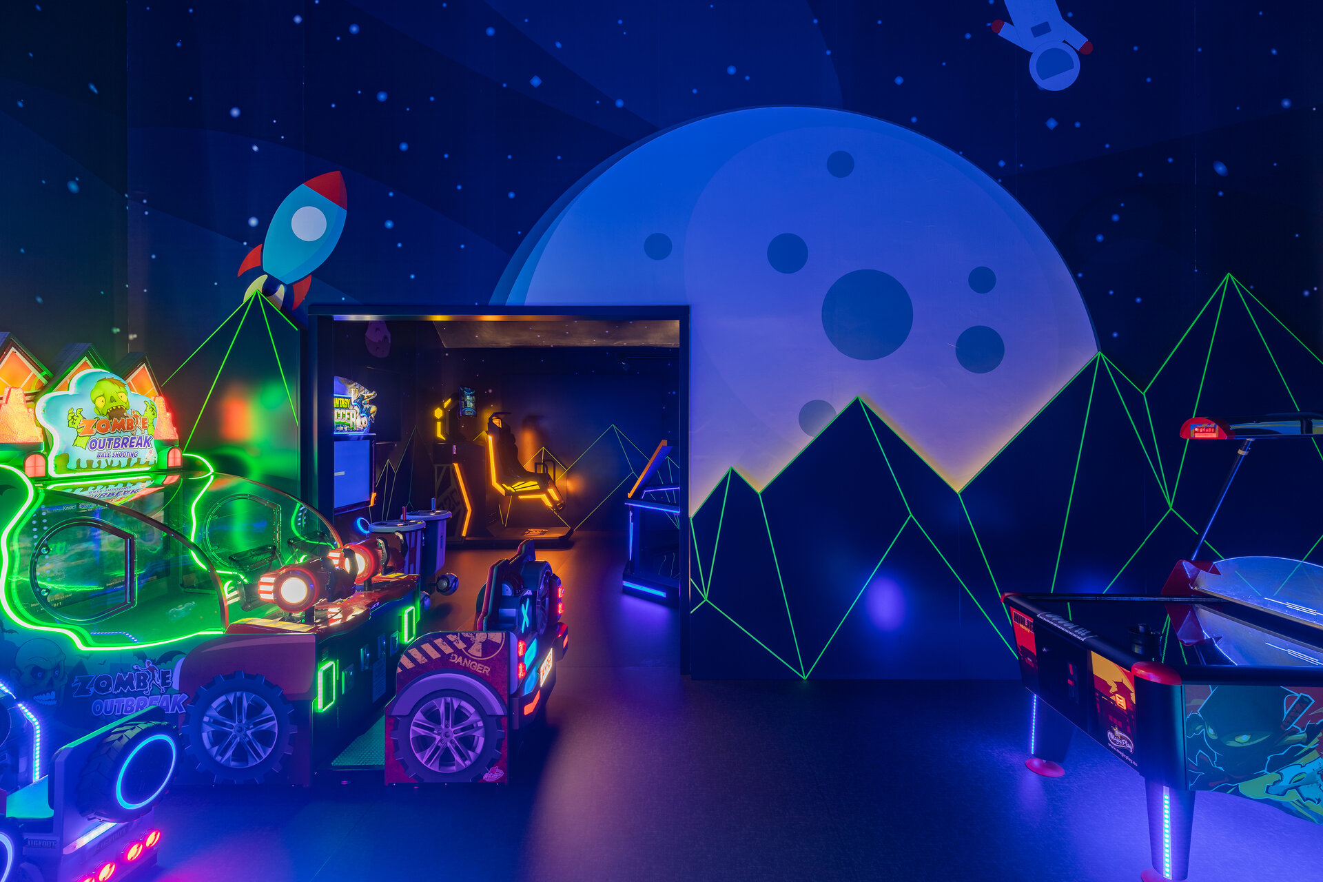 Interiorul este în conexiune directă cu o terasă acoperită și o grădină privată, care extind experiența în aer liber și oferă o continuitate naturală între spațiul de joacă, zona de petrecere și activitățile comunitare.