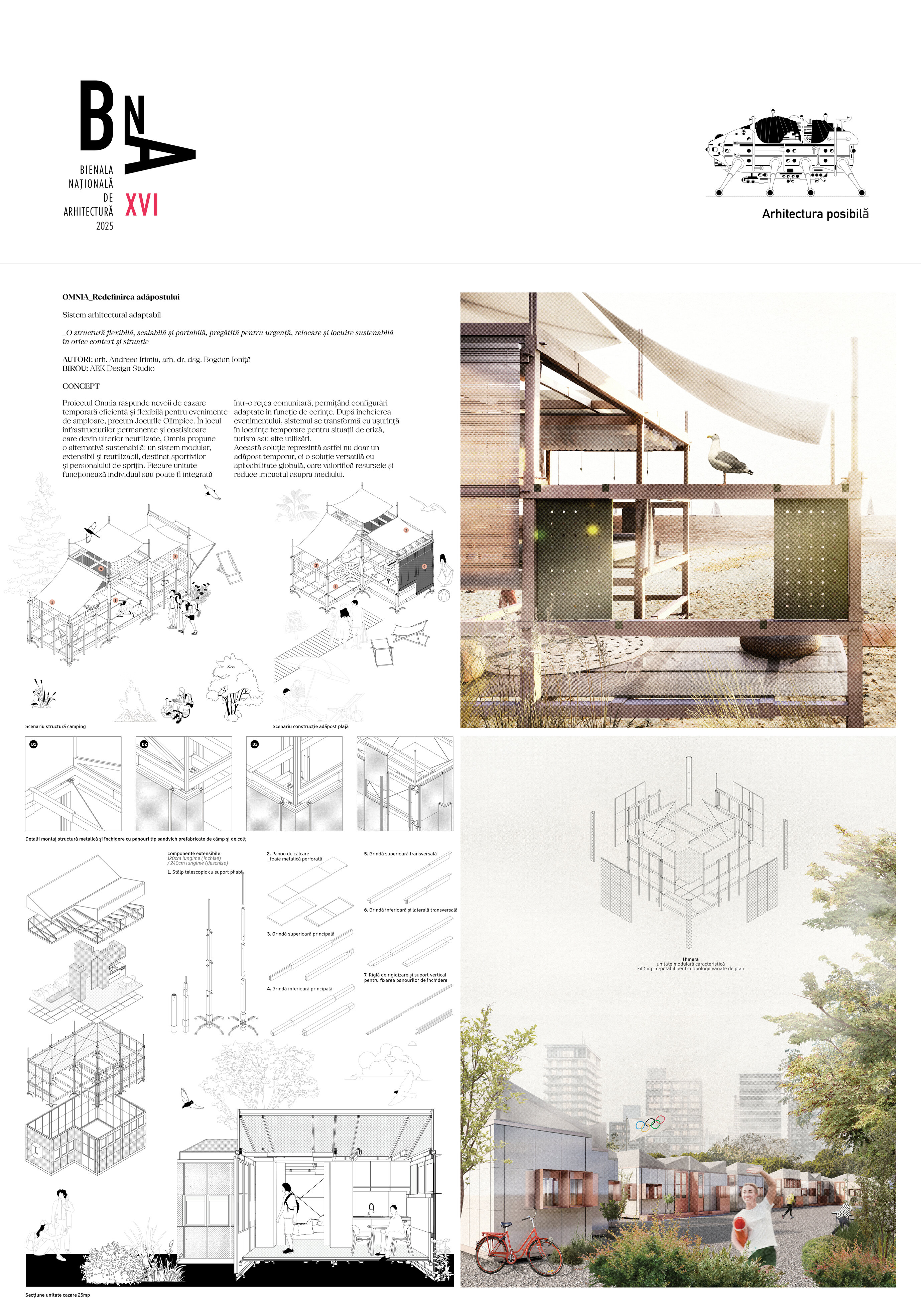 Proiectul Omnia răspunde nevoii de cazare temporară eficientă și flexibilă pentru evenimente de amploare, precum Jocurile Olimpice. În locul infrastructurilor permanente și costisitoare care devin ulterior neutilizate, Omnia propune o alternativă sustenabilă: un sistem modular, extensibil și reutilizabil, destinat sportivilor și personalului de sprijin. Fiecare unitate funcționează individual sau poate fi integrată într-o rețea comunitară, permițând configurări adaptate în funcție de cerințe. După încheierea evenimentului, sistemul se transformă cu ușurință în locuințe temporare pentru situații de criză, turism sau alte utilizări. Omnia nu este doar un adăpost temporar, ci o soluție versatilă cu aplicabilitate globală, care valorifică resursele și reduce impactul asupra mediului.