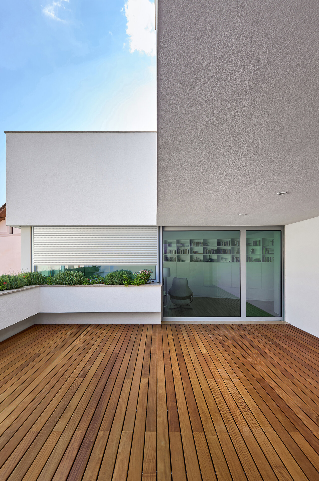 (ii) Primul etaj se retrage printr-o terasă parțial acoperită, însoțită pe una din laturi de un living secundar. Este o modalitate de a amplifica spațiul grădinii și totodată de a da formă unui mod particular de locuire, în care caracterului ”public” al parterului i se adaugă caracterul ”privat” al suitei de spații de la etaj; sau, dacă este permis, ceea ce în termenii reședințelor clasice se numeau ”appartement de société” şi ”appartement de commodité”.