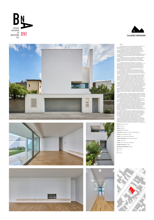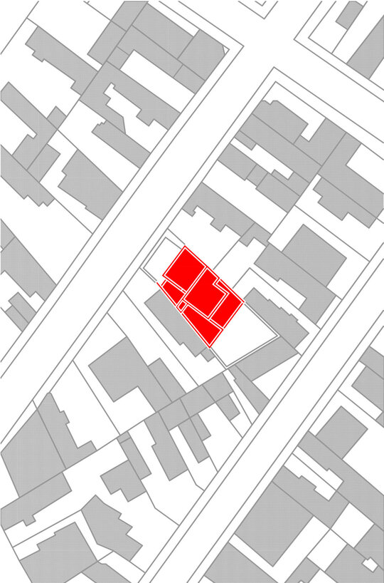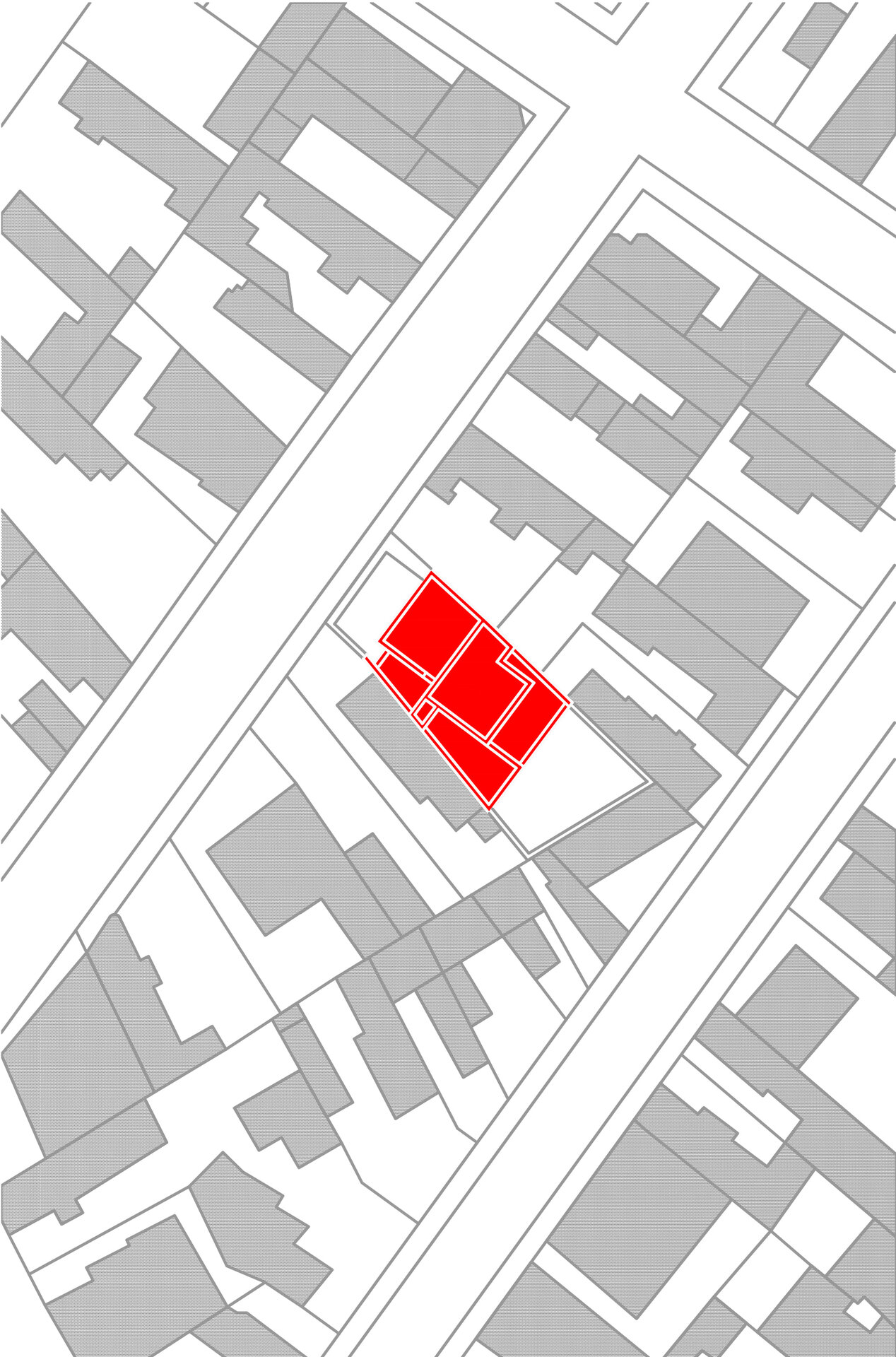 În parcelarul cvasi-regulat delimitat prin străzi paralele, există și perturbări geometrice locale, așa cum este cazul terenului în discuție: o suprafață poligonală de 353mp, cu o deschidere de 10,00m la stradă și cu calcane diferite ca înălțime, ocupând parțial celelalte trei limite. Plecând de la o reglementare de urbanism preexistentă, care prevedea un regim continuu de construire, clădirea se retrage de la aliniament și, preluând calcanele laterale, se deschide către curtea plantată din spate, orientată sud-est.