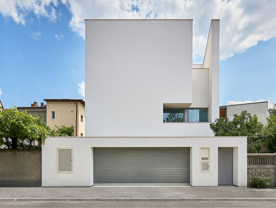 Caracterul ”loosian” – explicabil mai mult prin constrângerile parcelei și ale programului decât printr-o intenție arhitecturală apriorică – se manifestă și în exterior prin contrastul dintre caracterul fațadei spre stradă – pentru unii vecini contrariantă prin închiderea ei – și deschiderea celei din spate, cu toate spațiile de zi complet vitrate și orientate spre curtea plantată.