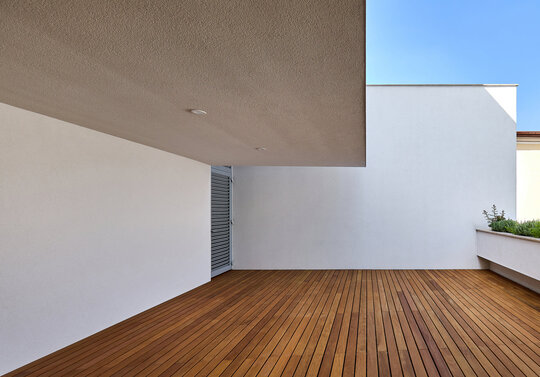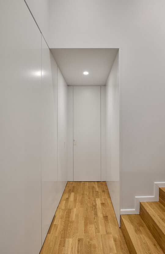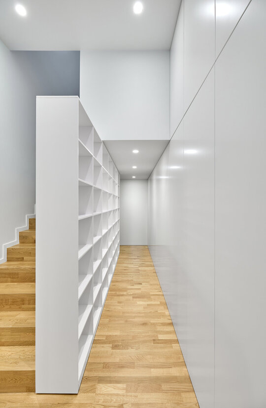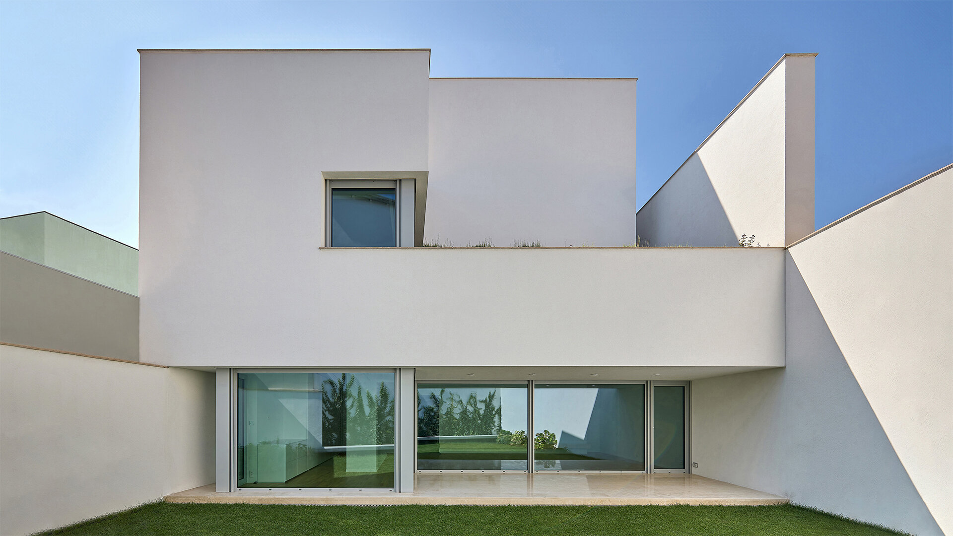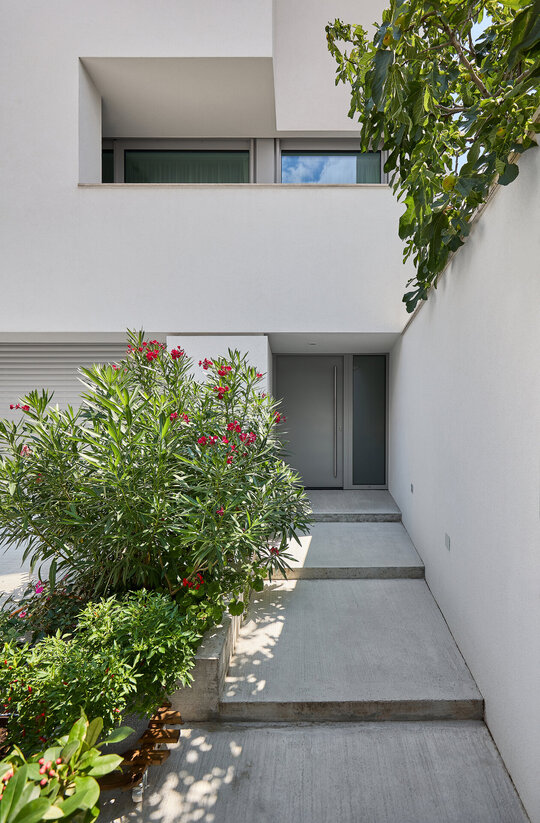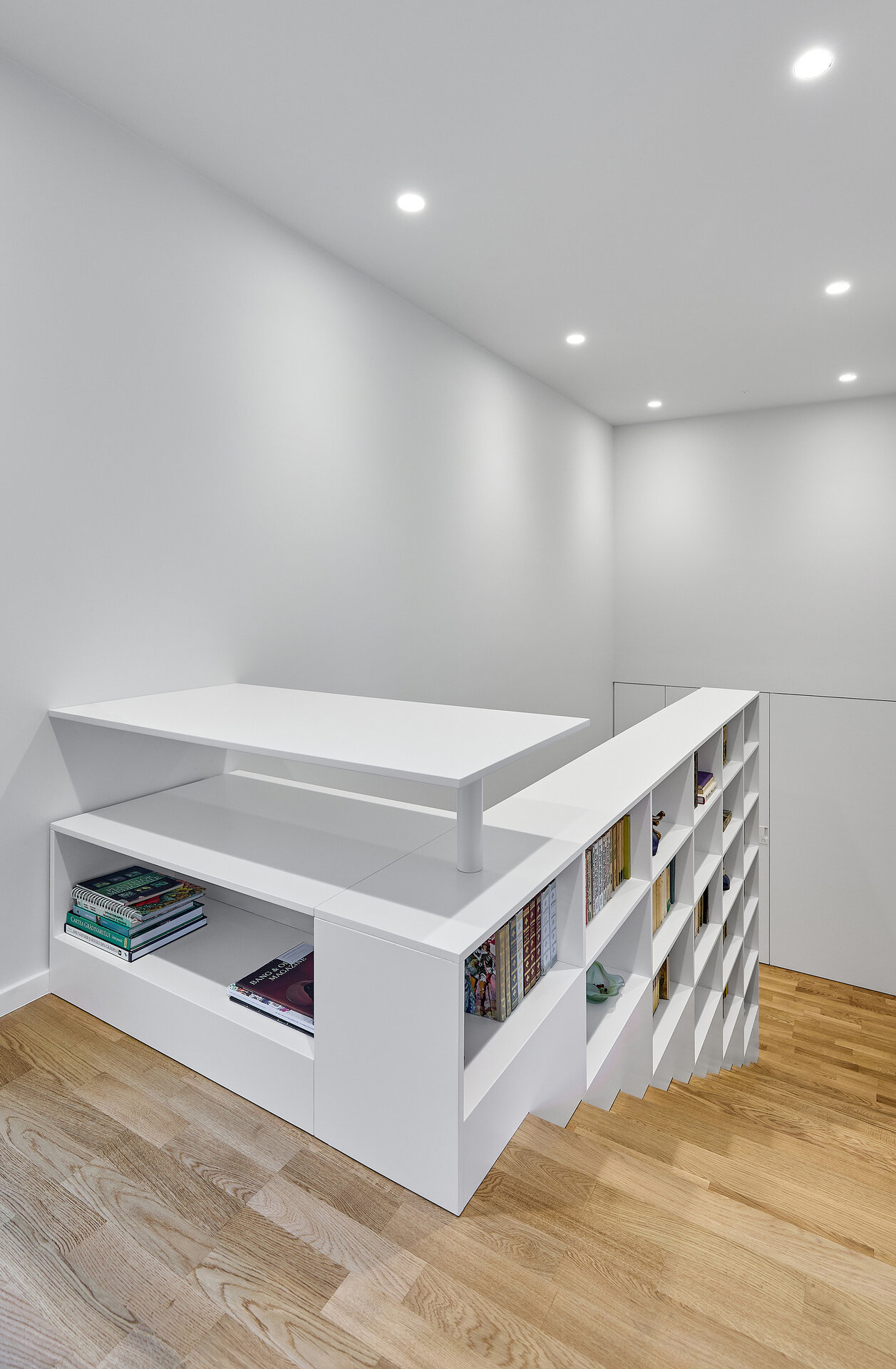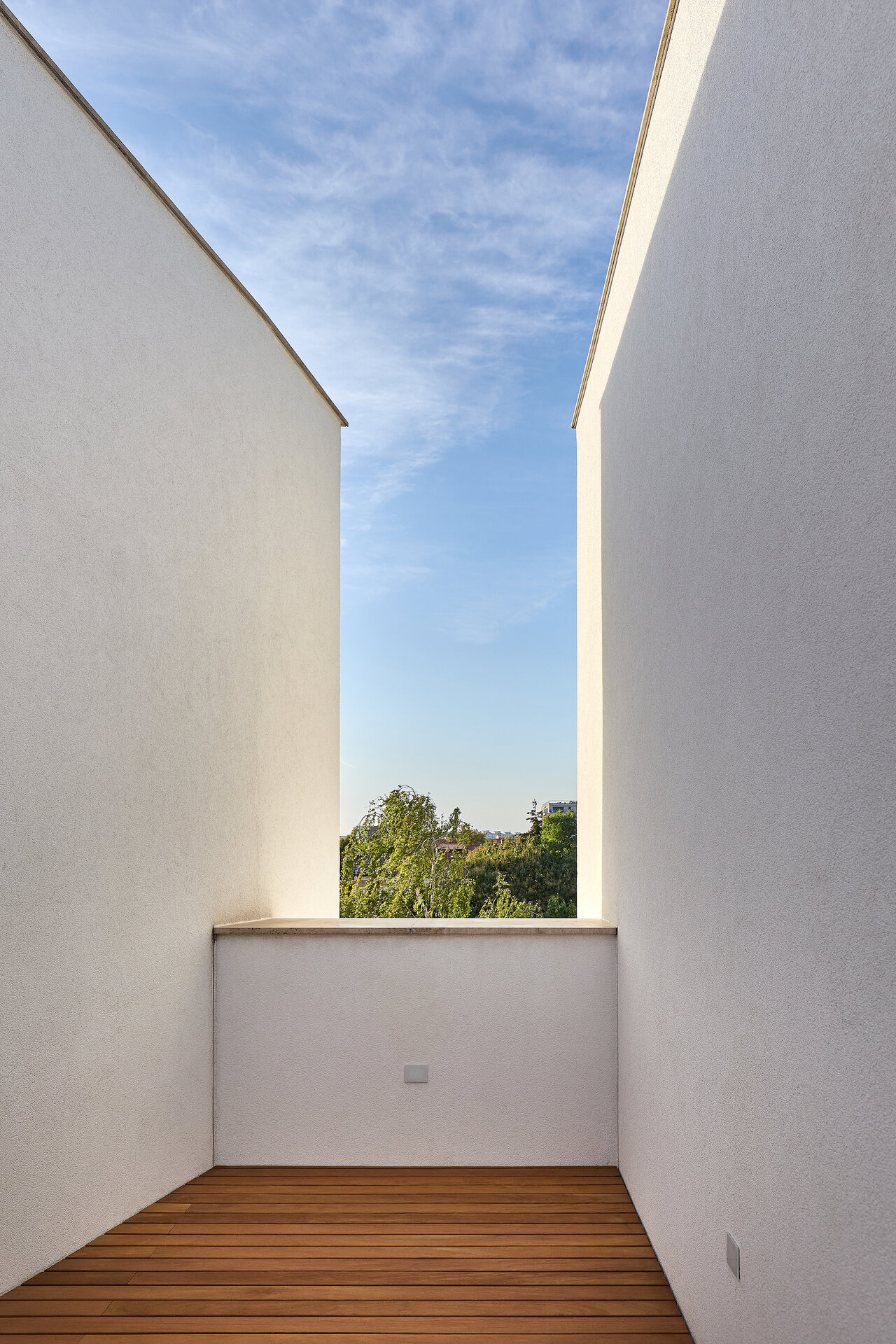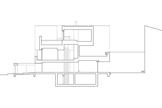 (iii) Etajul al doilea se deplasează în sens invers, acoperind terasa primului etaj cu un spațiu de lucru și făcând loc spre stradă unei terase cu o mica piscină, închisă pe contur pentru a fi ascunsă vederii. Deși exterior, este un spațiu al intimității, care nu are relație decât cu cerul și cu soarele; nu poți fi văzut, dar poți vedea, aruncând o privire către stradă prin decalajul celor doi pereți care continua pe verticală axul structurant longitudinal al parterului.