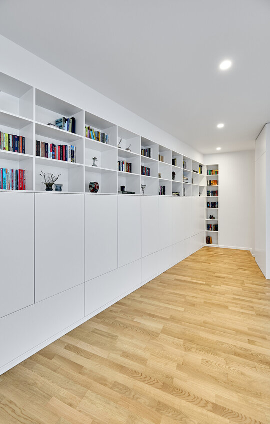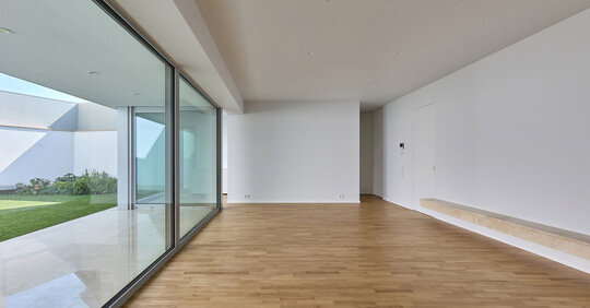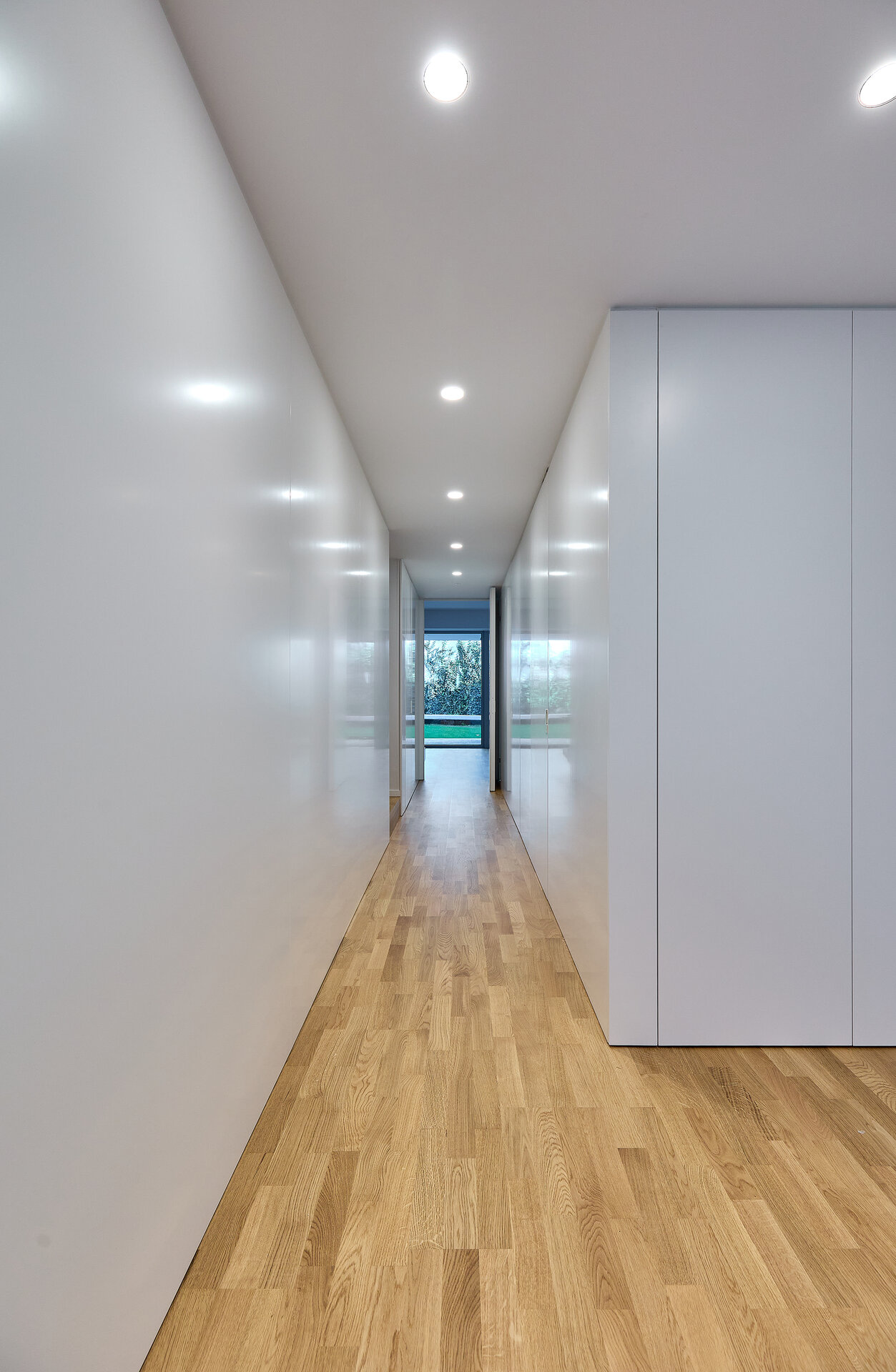 (i) Parterul este cel mai extins, cu living-ul principal, dinning-ul și bucătăria orientate spre curtea-grădină din spate. Suprafața continuă de sticlă, pe toată înălțimea – retrasă în fața living-ului pentru a crea o terasă acoperită și avansată în fața locului de luat masa din bucătărie – relativizează limita dintre interior și exterior.