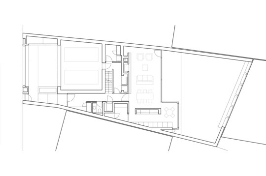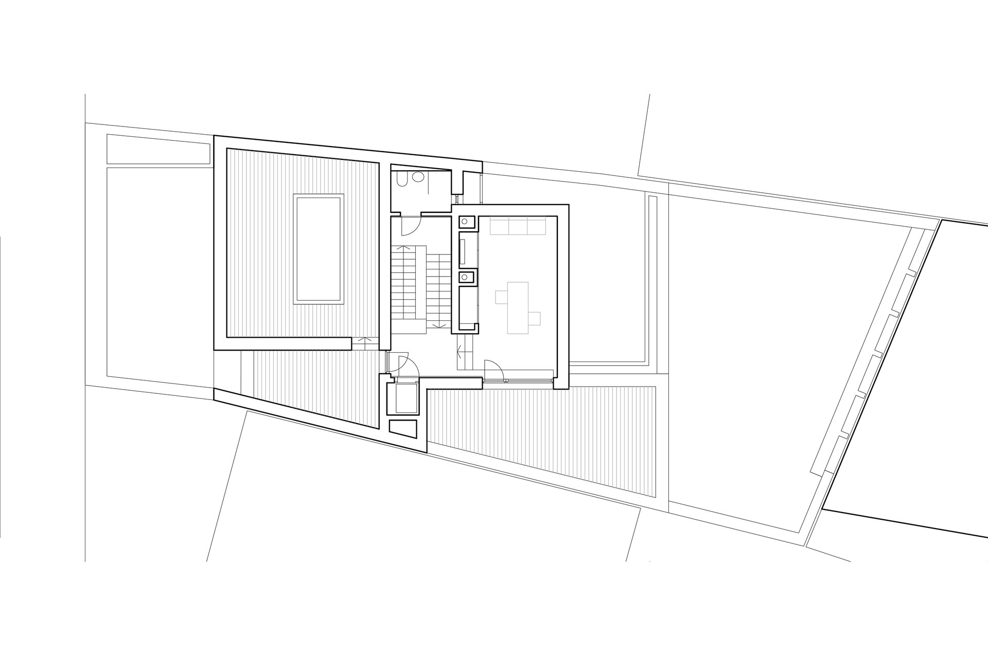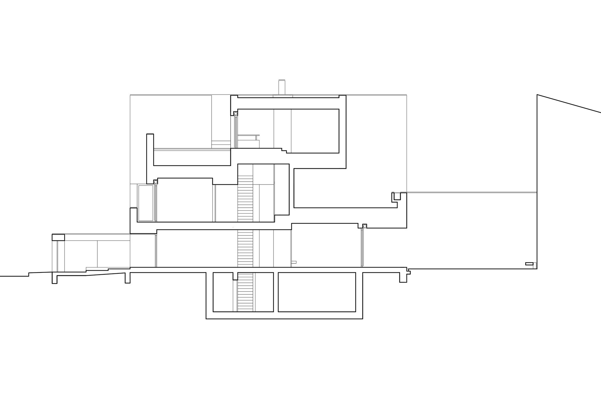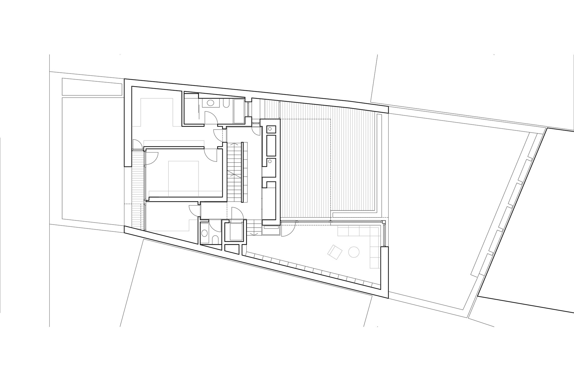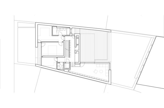 Între direcțiile divergente ale limitelor, două axe structurante ortogonale organizează planul: prima longitudinală – circulația orizontală care leagă zona de intrare cu cea a living-ului și a curții plantate din spate –, a doua transversală – succesiunea de spații pe care sunt dispuse circulația verticală (scară, ascensor) și nucleul de echipamente tehnice (șemineu, instalații de climatizare). Ordonate de aceste direcții, conturul și structura planimetrică diferă de la un nivel la altul: