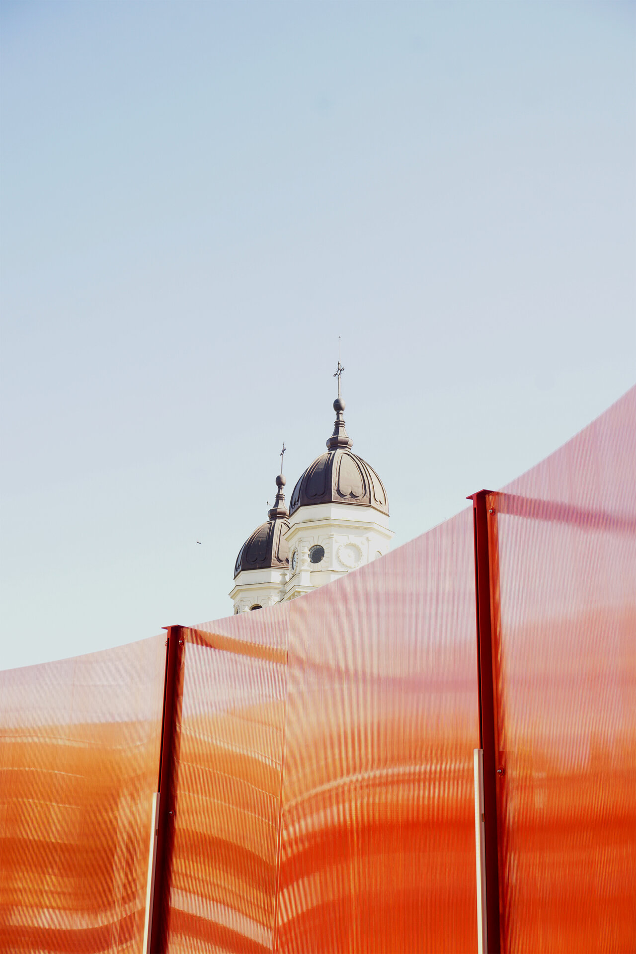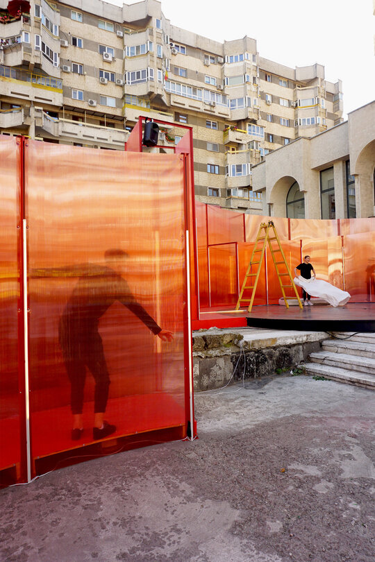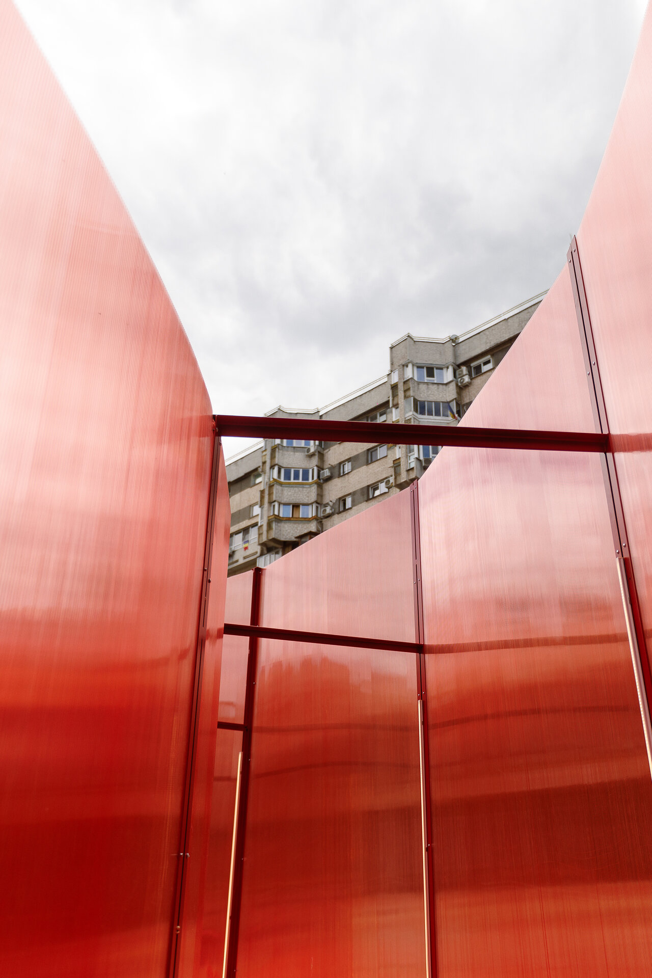 Ne-am folosit de caracteristicile pieței pentru a așeza și orienta scena astfel încât aceasta să rămână vizibilă, dar retrasă față de circulația pietonală intensă. Ansamblul propus este corelat la scara spațiului în care este inserat, dar se contopește cu acesta, prin formă și transparență, lăsând mișcarea artiștilor care performează să se suprapună cu mișcarea locuitorilor care tranzitează piața în rutina lor zilnică.