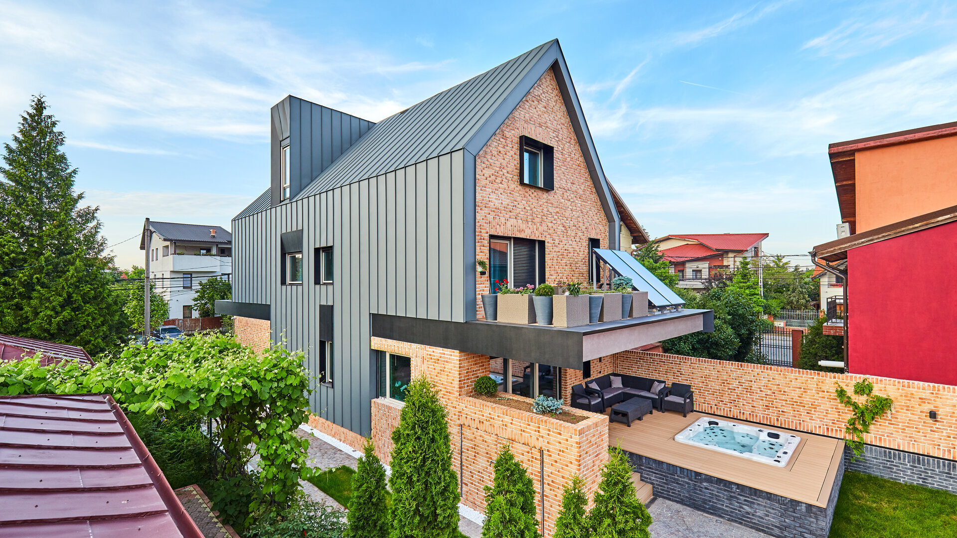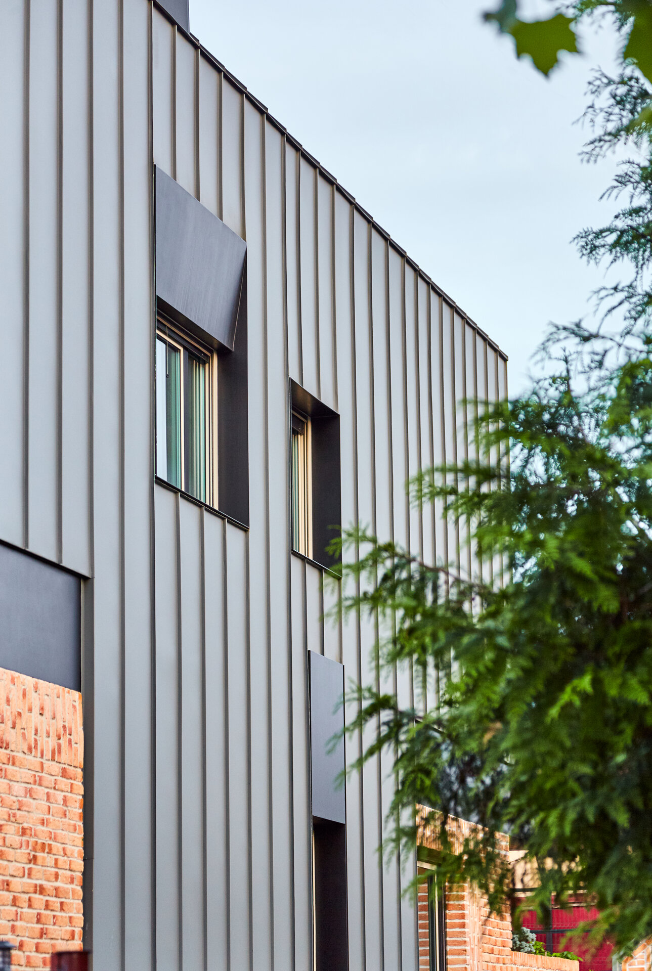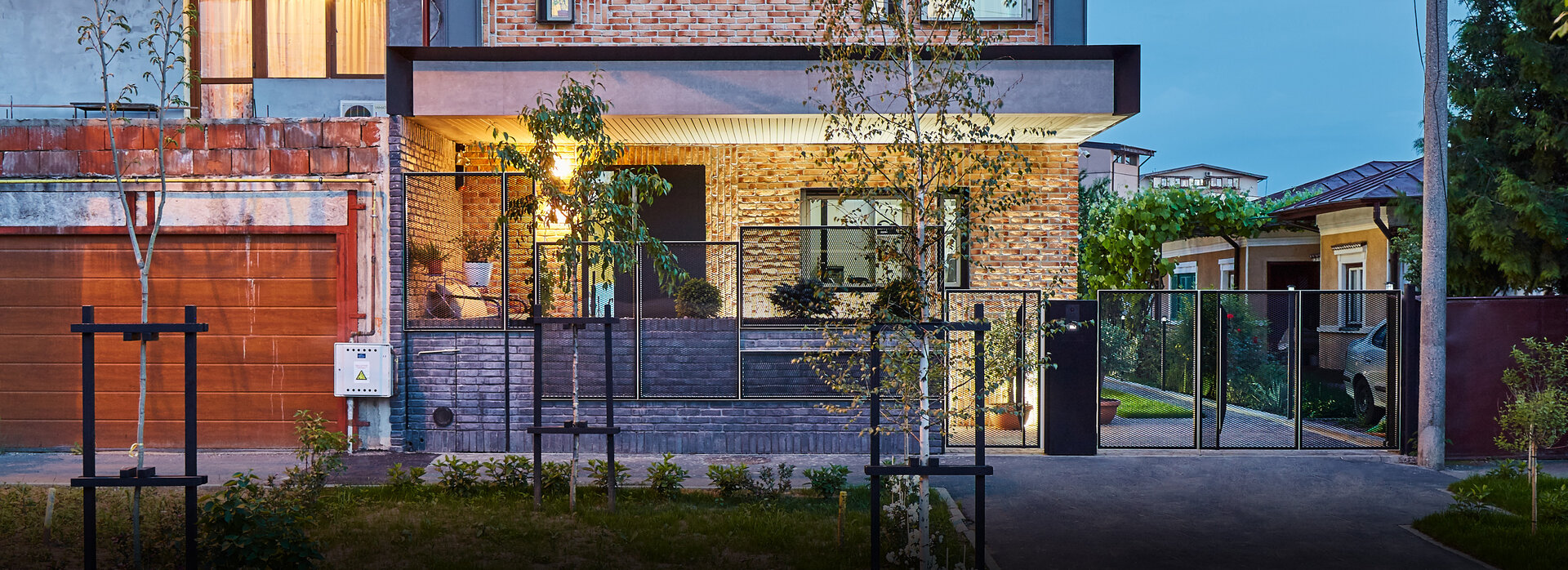 Materiale: tabla faltuita din Aluminiu tratat, caramida de fatada, otel, piatra vulcanica, beton parent, stejar reconditionat