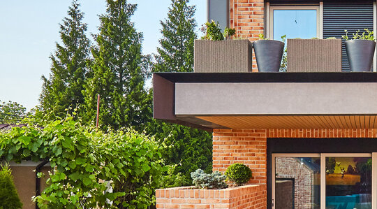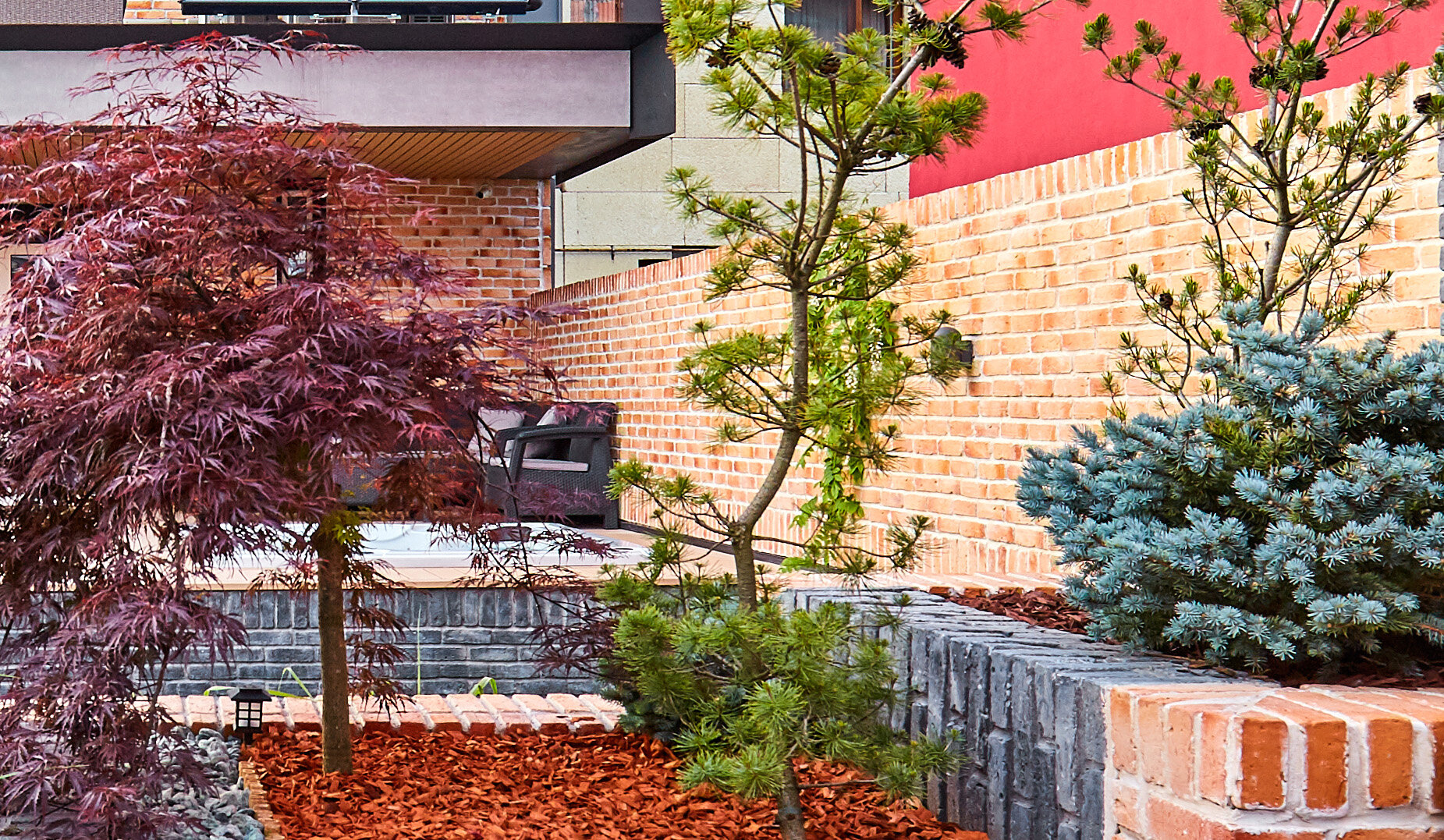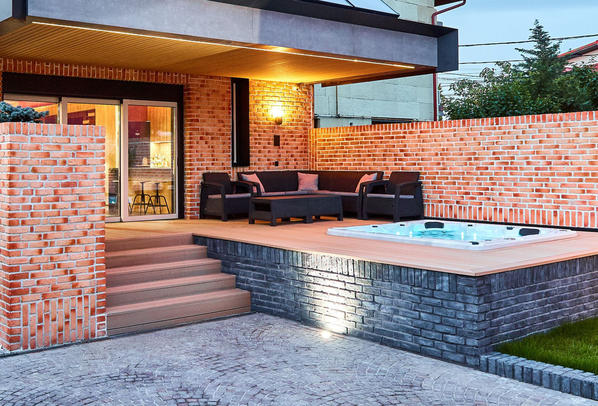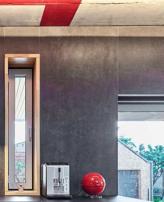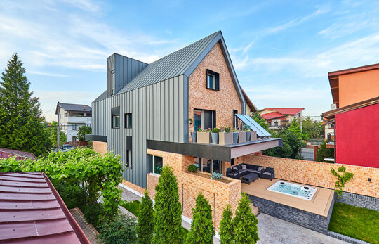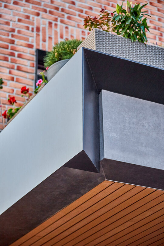 Materiale: tabla faltuita din Aluminiu tratat, caramida de fatada, otel, piatra vulcanica, beton parent, stejar reconditionat