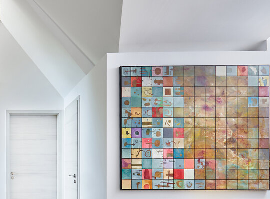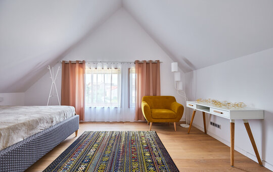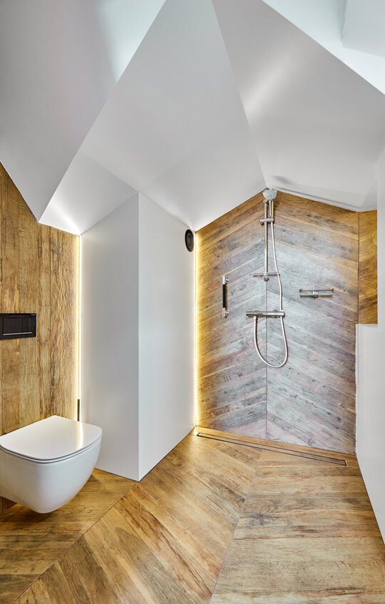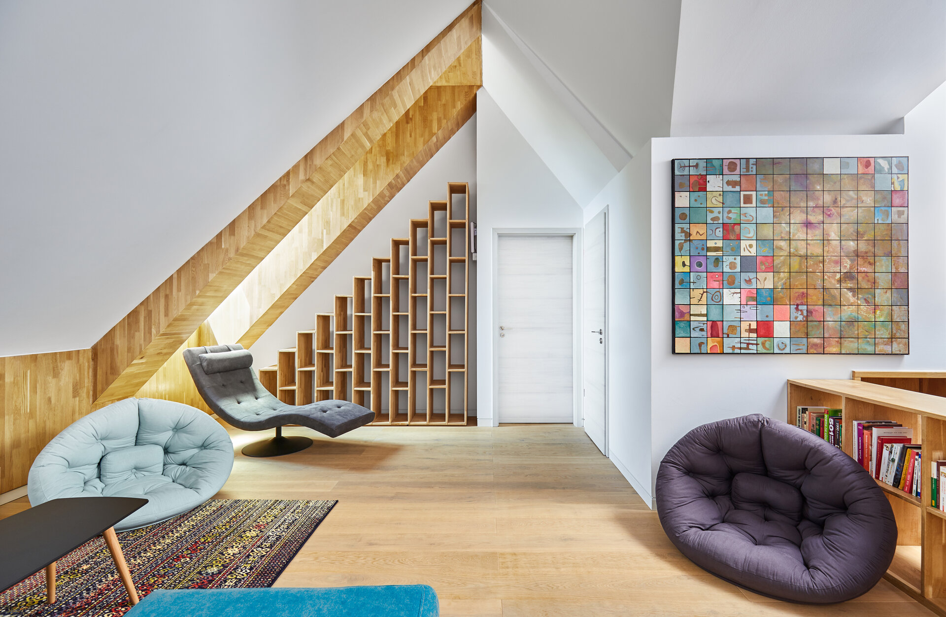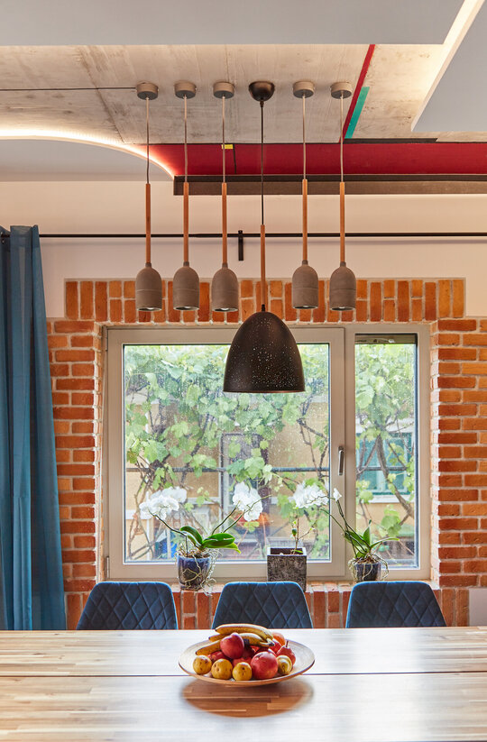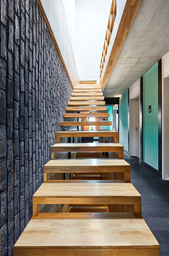 al spatiilor. Pentru a crea contradictii si elemente de confort s-au folosit covoare traditionale, mobilier colorat si lemn masiv din stejar refolosit. Iluminatul natural este asigurat pentru fiecare zona de trai, cu exceptia scarilor care sunt iluminate zenital. Iluminatul artificial este asigurat prin banda LED si spoturi cilindrice care ofera control si accente zonale. Lemnul si caramida au un rol antropomorfic si sunt folosite ca material de legatura intre raceala betonului si tencuiala alba.