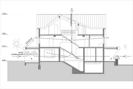 S-a recurs la o intarsie intre ce creste din sol si ce este orientat spre cer. In sectiunea longitudinala se observa relatia functionala intre elemente – pridvor, prispa, goluri pentru ventilare si iluminat, scara interioara ca element de circulatii, mobilier, transitie si ventilare a spatiilor.