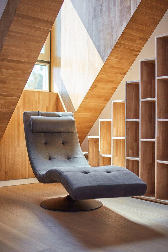 In interior s-au eliminat complet elementele structurale prin acunderea lor in compozitia peretilor. Spatiul la parter de 100 m.p. pare mai mare datorita stalpilor ascunsi, iar folosirea betonului aparent cenusiu sau gri subliniaza accentul idustrial