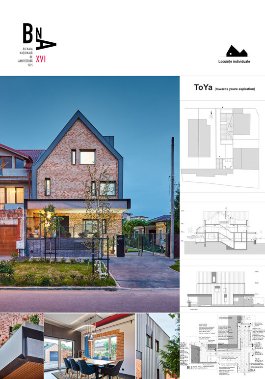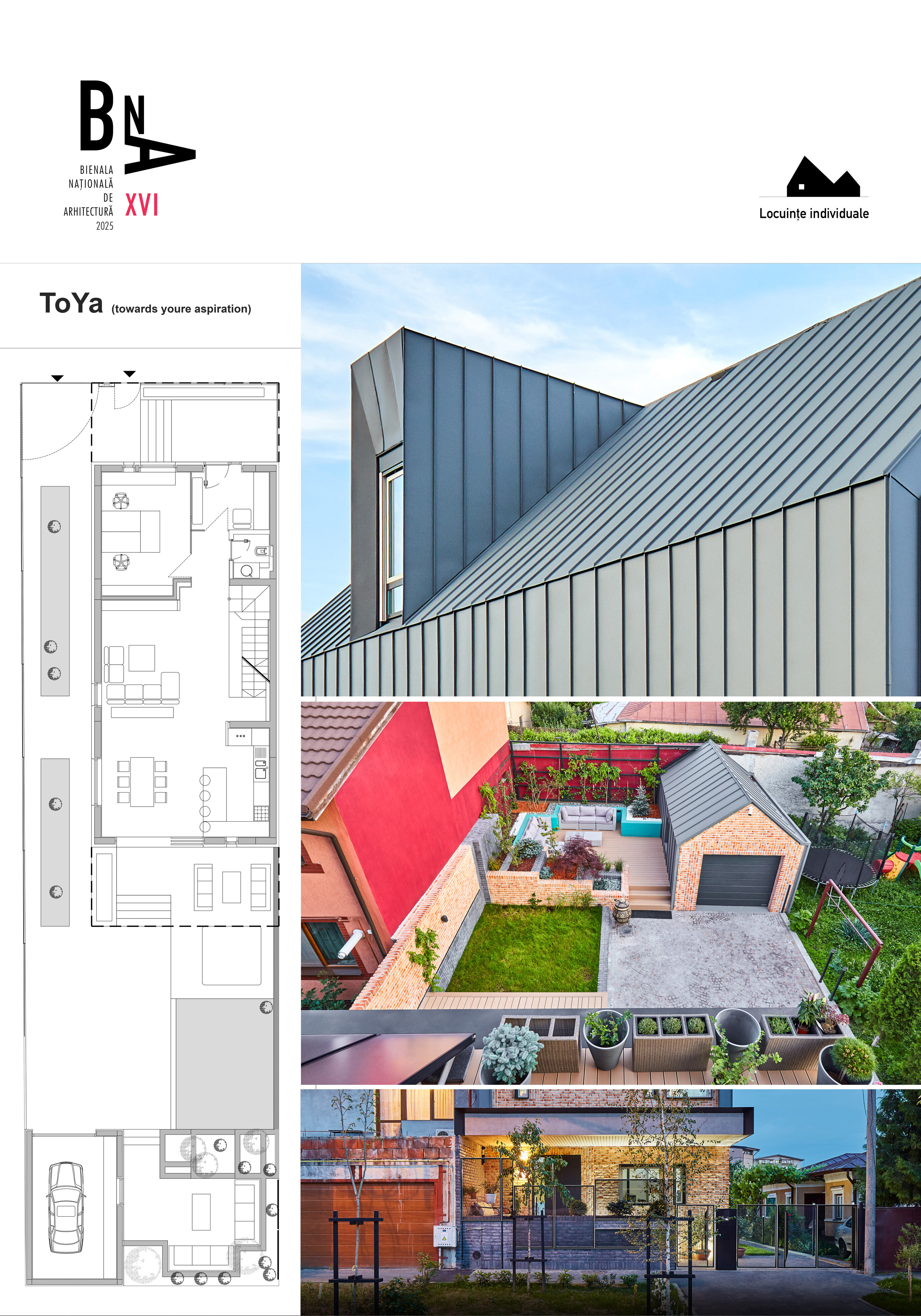 Prin aceasta insertie am dorit sa cream un spatiu stereotipal de ,,casa” chiar daca locuina este cuplata noi am incercat sa o tratam ca o ,,viletta’’ de oras, care sa lase senzatia de casa izolata. Acoperisul este un element important pentru acesta scop, iar frontonul a fost detasat ca sa obtinem imaginea de locuinta isolata.Pantele sunt gandite in asa fel incat sa rezolve surgerile apelor fara a afecta vecinii.