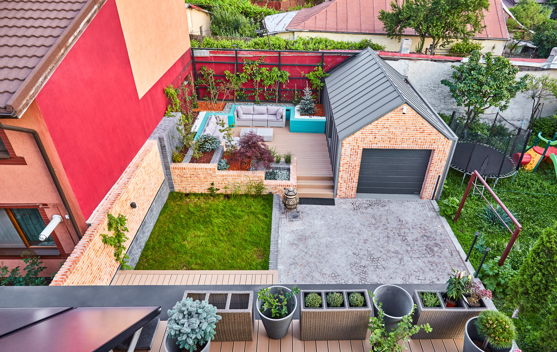 Gradina are cateva paliere de relationare – gradina publica reconditionata – spatiul de intampinare si dialog public, gard – jardiniera – element de bariera si de acces limitat, dar cu grade de trasparenta pentru evitarea delimitarii categorice, traseul auto – tratat ca o curte longitudinala, terasa spate pentru relaxare all sezons cu jakuzzi, piata pietruita si gradina de vara – amenajata in zona de calcan spate pentru a oferi fundal si senzatie de discontinuitate.