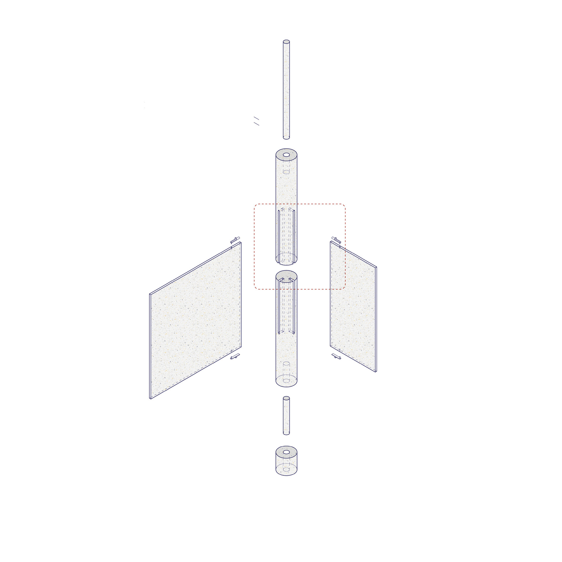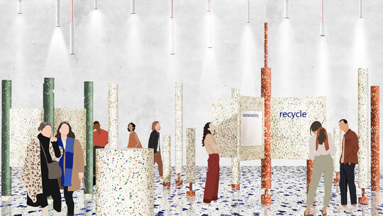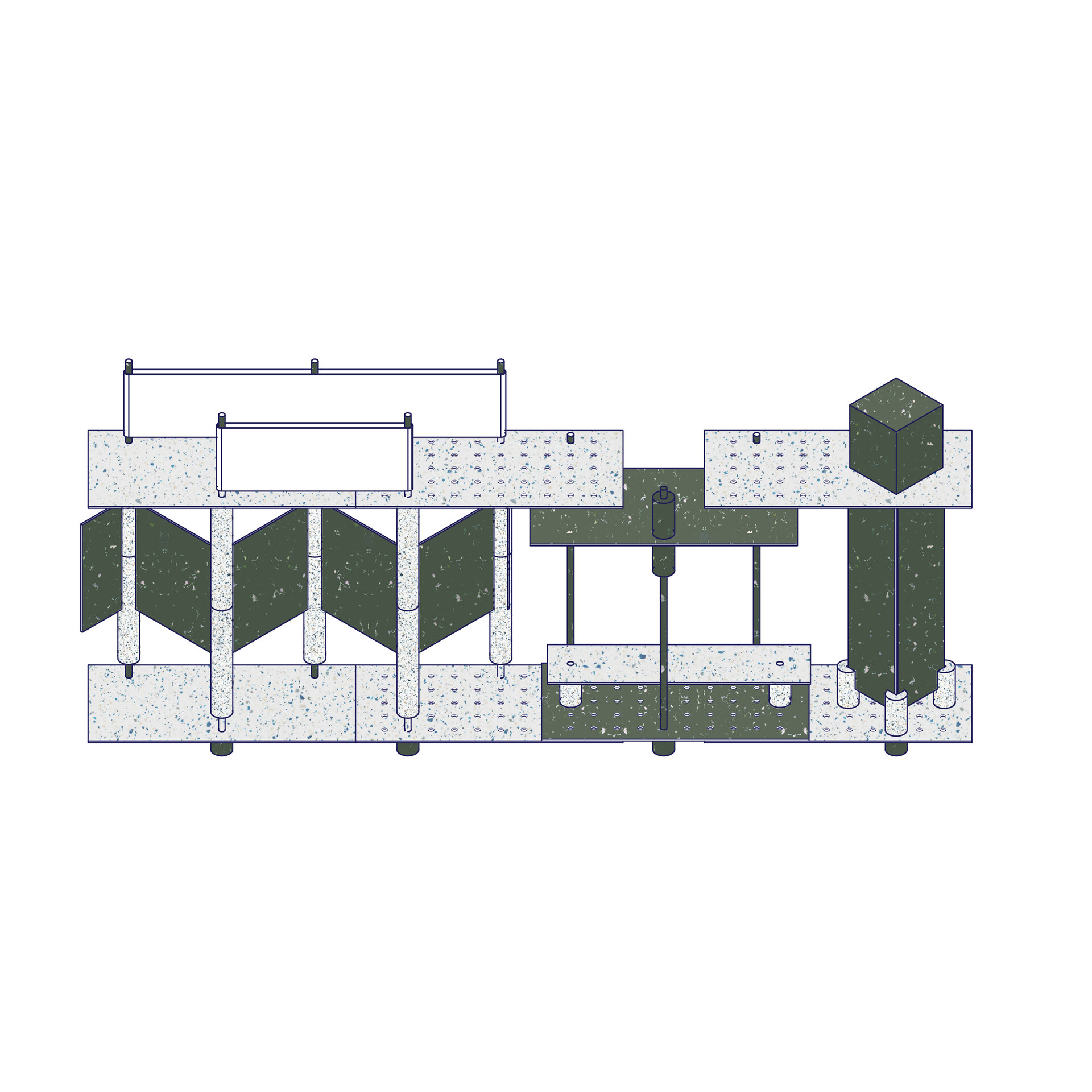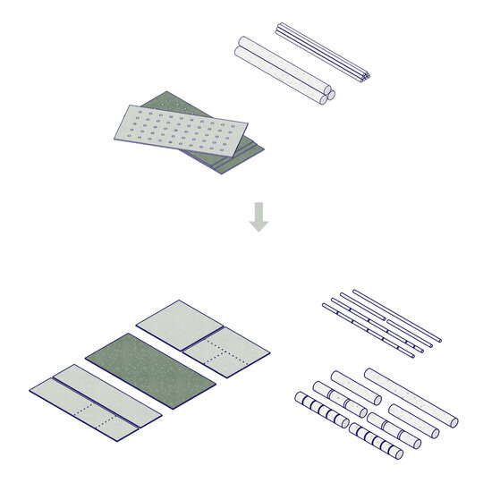 Fiecare componentă este produsă din plastic reciclat cu agregate estetice vizibile, prin tehnologii avansate (topire, extrudare, expandare), cu densități variabile pentru a asigura rezistență și greutate redusă. Piesele compacte sunt ușor de transportat și asamblat, integrându-se într-un sistem coerent ce minimizează emisiile și optimizează logistica. Întregul proces de fabricație este zero-deșeu, gândit pentru eficiență maximă și refolosire ulterioară. Paleta cromatică rezultă din materialele reciclate, conferind pavilionului o identitate vizuală puternică și versatilă. Astfel, Polyvert transformă deșeurile într-o expresie vizuală a responsabilității ecologice și oferă un exemplu concret de integrare a principiilor circulare în arhitectura spațiului public.