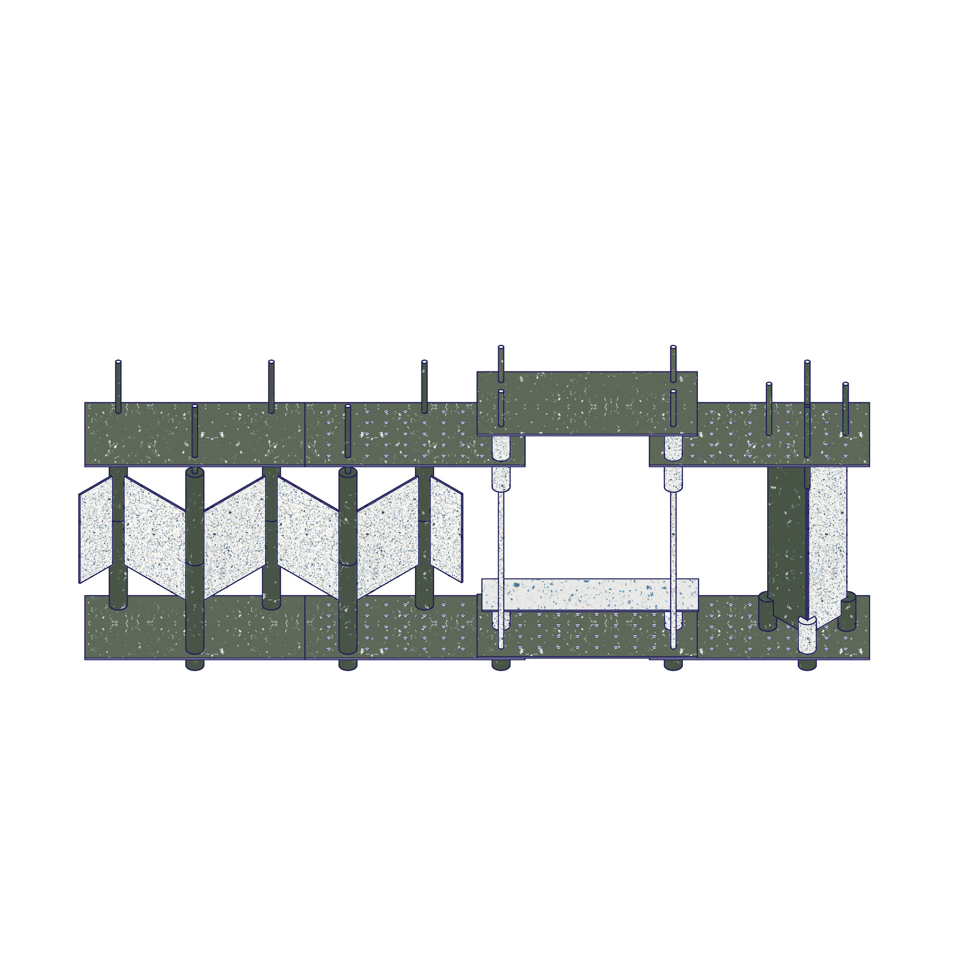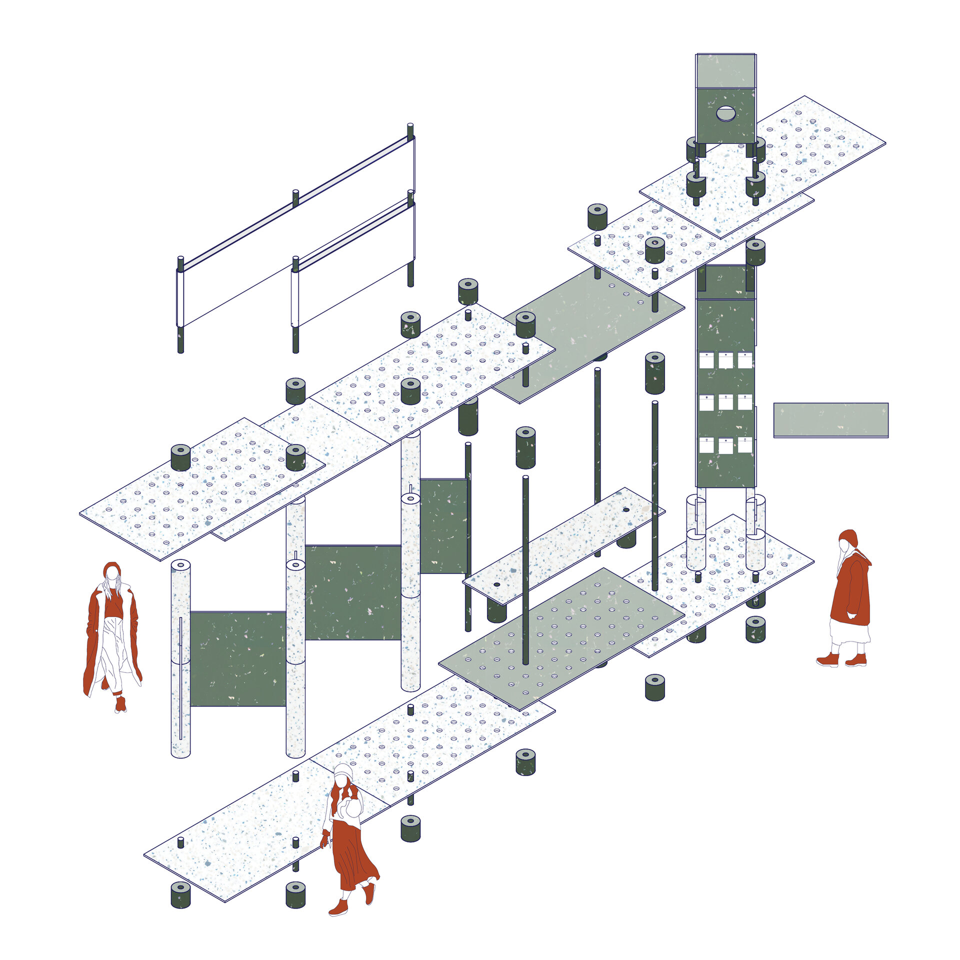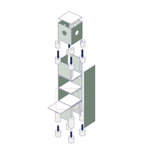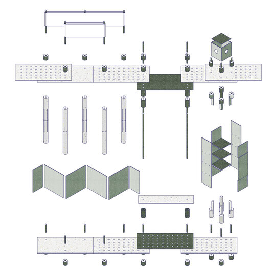 Structura este gândită pentru integrare armonioasă în spații naturale sau urbane, interior sau exterior. Sistemul de construcție interconectat permite asamblarea rapidă, fără unelte speciale sau materiale adiționale. Fiecare element este multifuncțional, standardizat și prevăzut cu perforații și puncte de prindere care permit multiple configurări: de la mobilier urban, la scene temporare sau expoziții interactive. Această flexibilitate permite reconfigurarea, relocarea sau reinterpretarea spațiului în funcție de context, transformând Polyvert într-un instrument educațional și social adaptabil. Prin modularitate, pavilionul optimizează spațiul și funcționalitatea și devine un exemplu de arhitectură sustenabilă, capabilă să răspundă nevoilor în continuă schimbare ale spațiilor publice.